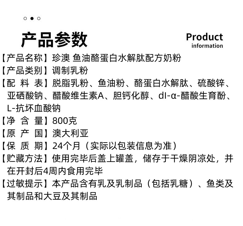 澳大利亚进口 珍澳鱼油酪蛋白水解肽配方奶粉800g