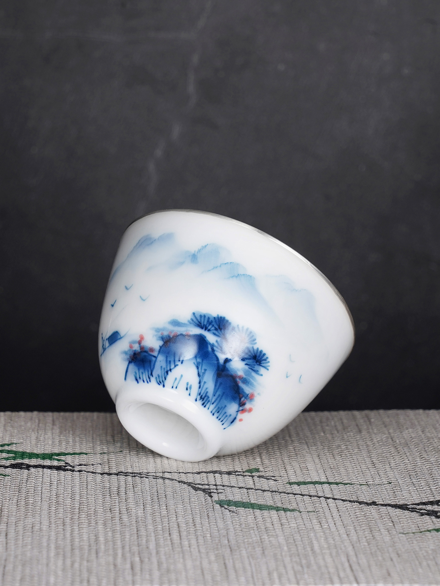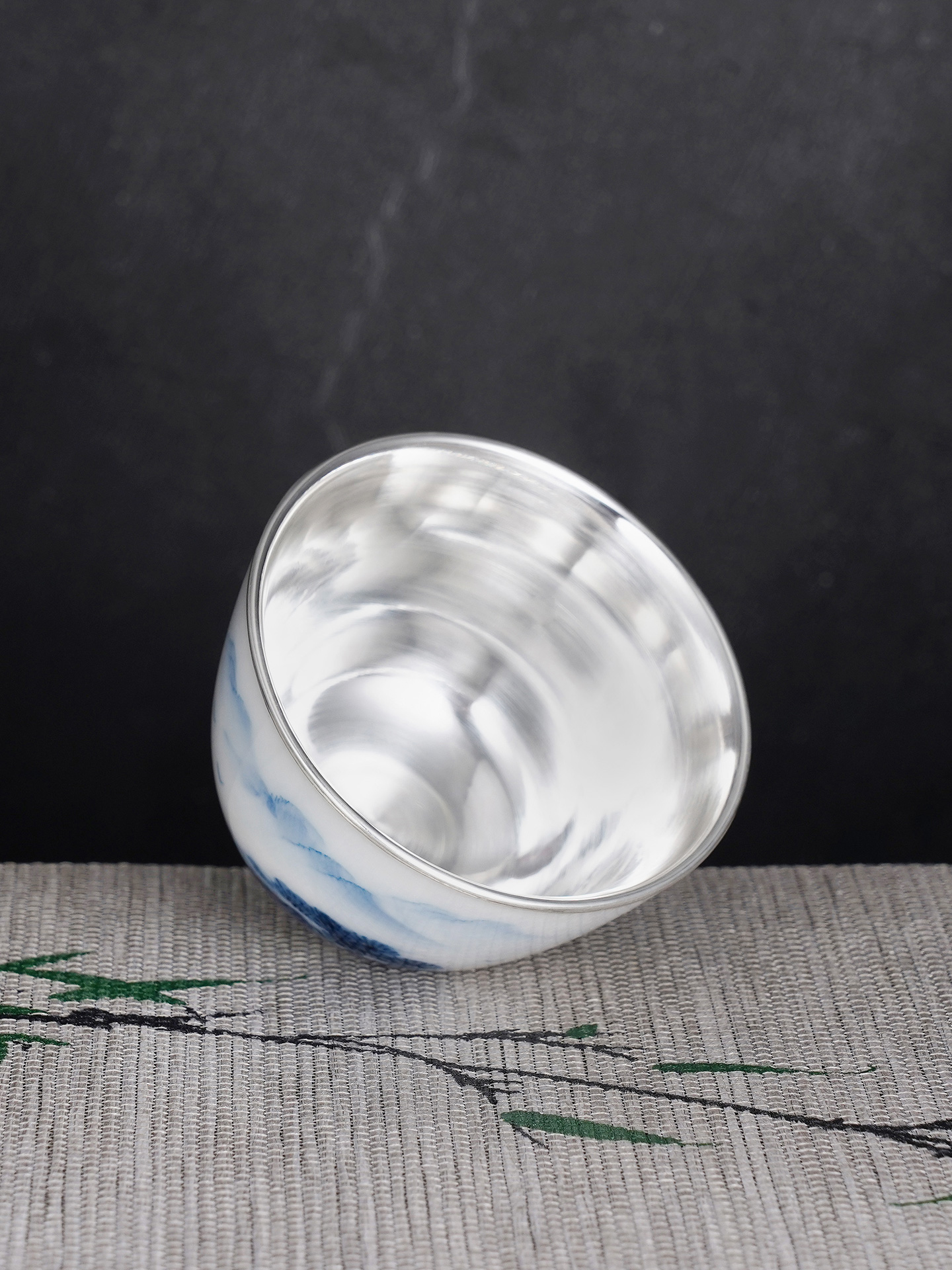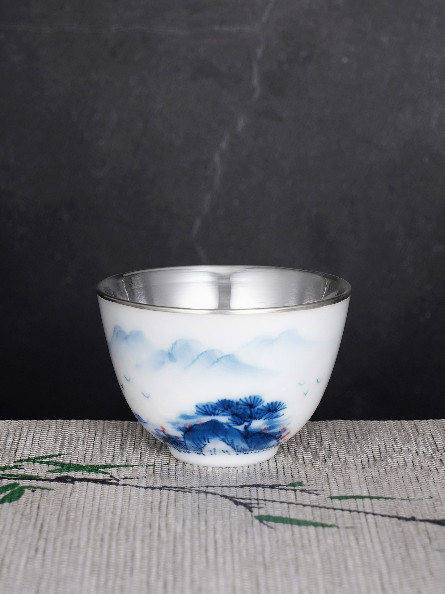 子佩集S990【青松秀色】摆件【FP018】纯银茶具青花松树茶杯纯银内胆景德镇手绘2508