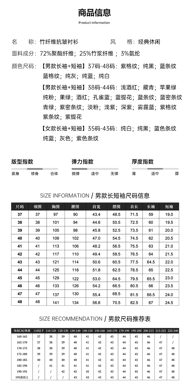 【竹纤维抗皱衬衫】男女商务长袖衬衫 大码免烫短袖休闲衬衣