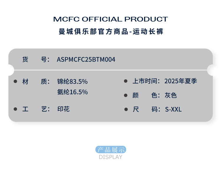 【官方正版】曼城俱乐部 | 灰色运动长裤系带松紧口袋隐形拉链