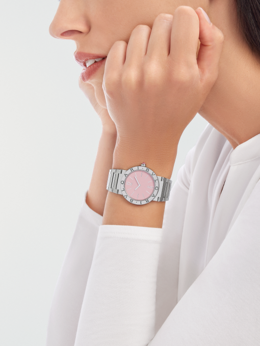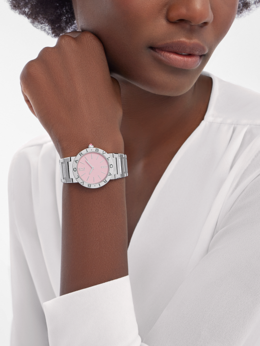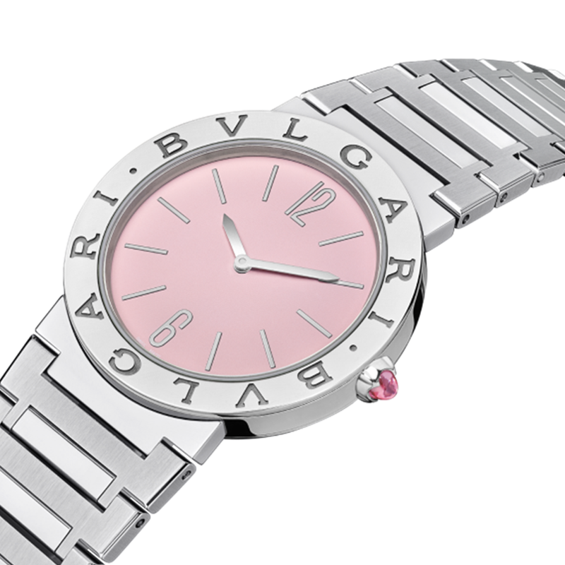 镜面 材质 | 蓝宝石水晶玻璃 | 表盘 | 精钢表壳 精钢表圈镌刻双LOGO标 淡粉色漆面表盘,12枚镶贴时标,银色指针 精钢表冠镶嵌一颗凸形蛋面切割粉色红碧玺 |