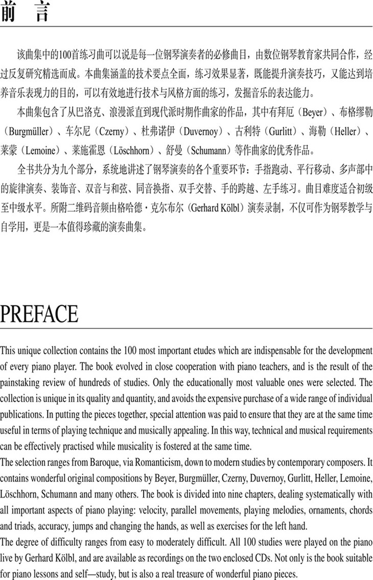格哈德·克尔布尔著的《钢琴上的美妙练习曲100首(原版引进)》中的100首练习曲可以说是每一位钢琴演奏者的必修曲目,由数位钢琴教育家共同合作,经过反复研究精选而成。本曲集涵盖的技术要点全面,练习效果显著,既能提升演奏技巧,又能达到培养音乐表现力的目的,可以有效地进行技术与风格方面的练习,发掘音乐的表达能力。