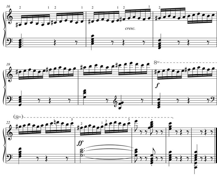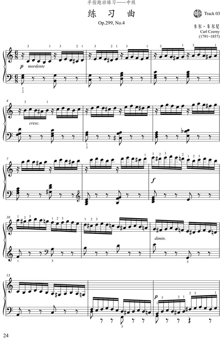 全书共分为九个部分,地讲述了钢琴演奏的各个重要环节:手指跑动、平行移动、多声部中的旋律演奏、装饰音、双音与和弦、同音换指、双手交替、手的跨越、等