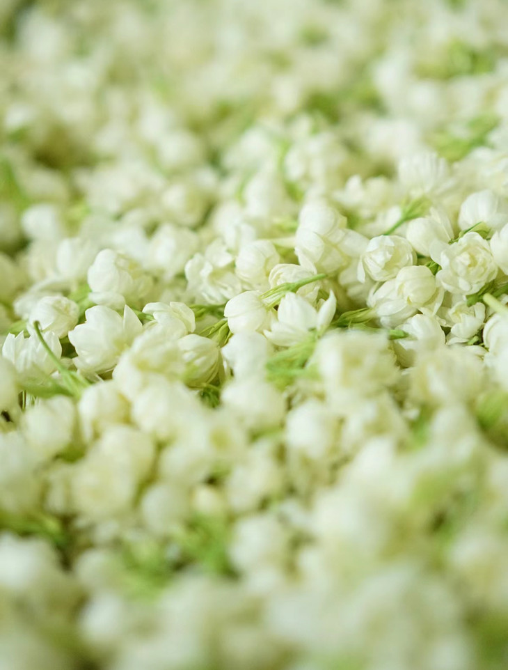 茉莉花蕾三伏天午时采摘 通常在下午的两点到三点之间 此时的日头最毒 花蕾中的精油浓度达到顶峰 茉莉花的香气最足 采摘下的茉莉花蕾 用通气箩筐或网兜装好 🔻避免“火烧花” 运至茶厂后,须迅速摊凉 每间隔半小时堆起,半小时推开 反复这个过程 直到花蕾开放率达80%-85%左右 进行筛花(剔除青蕾、花蒂、杂物)备用 【茉莉花胚】才算做好