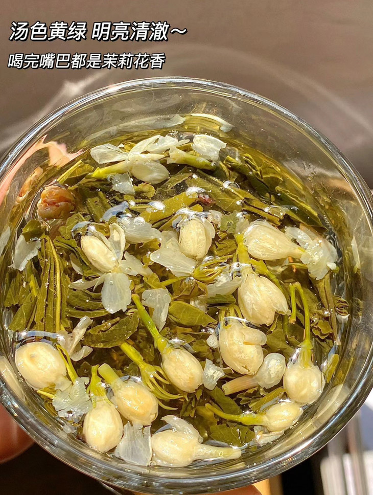 🔻温馨提醒: 泡茉莉花茶时,最佳量为3-5g左右 这个量冲出来的口感最温和甘甜 量多了分解出来点茶香会偏浓蕴 只适合少部分重口味的家人们呢 夏季饭后来一杯即可生津解渴,还能舒缓压力 ps:茉莉花茶还可以冷泡哦! 但虚寒体质或者肠胃不好的朋友 尽量不要选择冷泡 需要冷藏时,注意选择密闭的瓶子 隔绝异味和细菌
