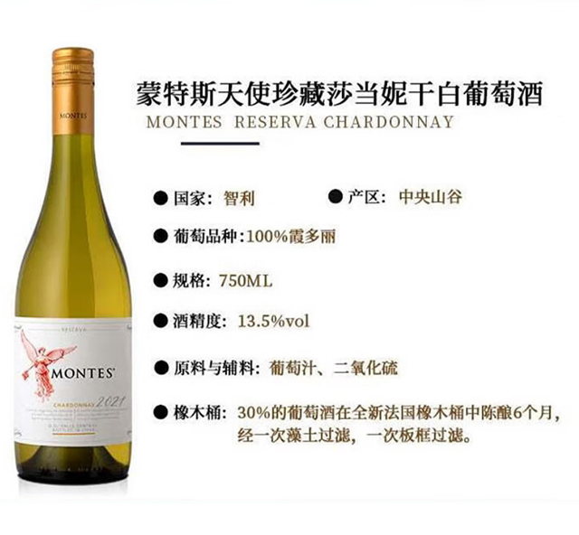 蒙特斯红天使珍藏莎当妮干白葡萄酒 750ml/1瓶