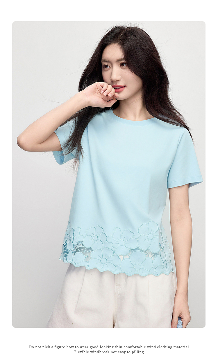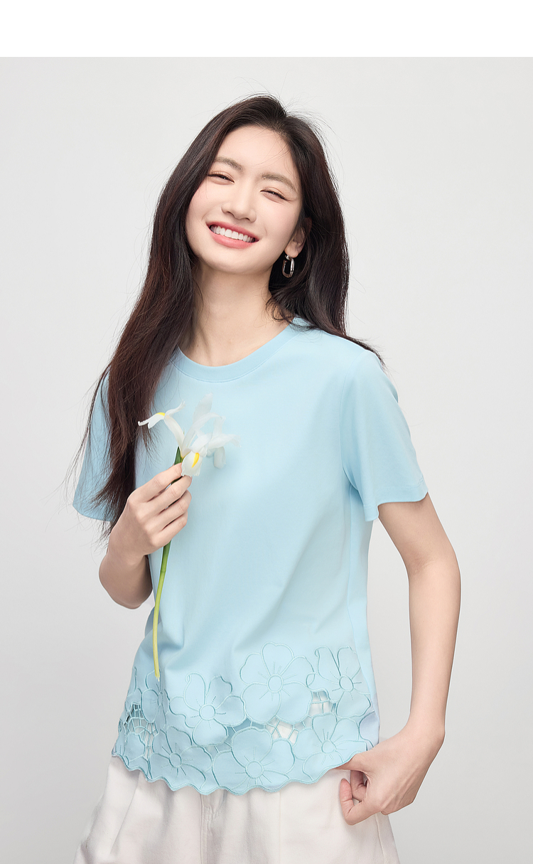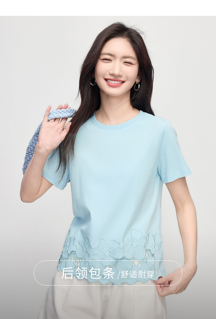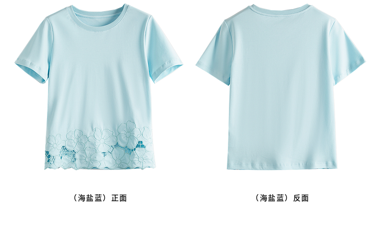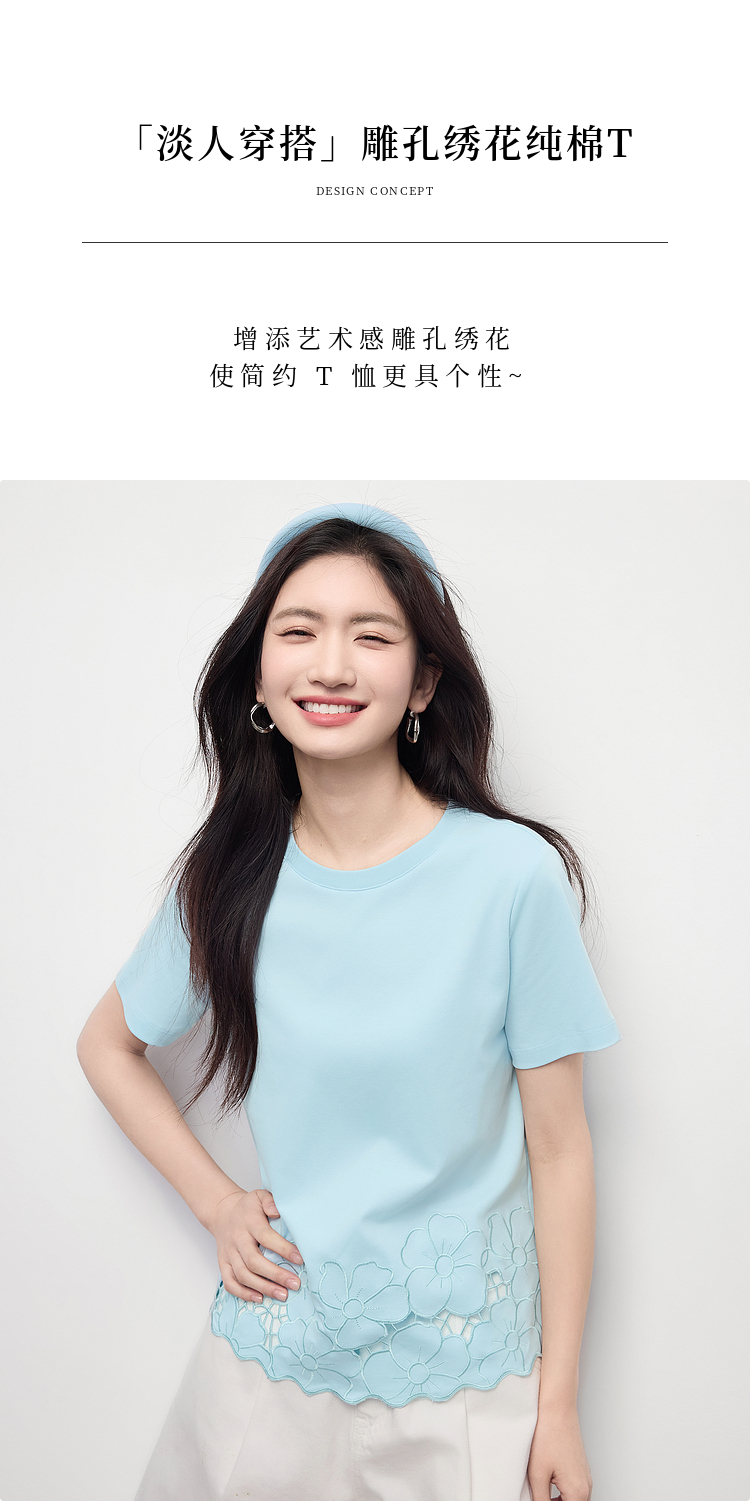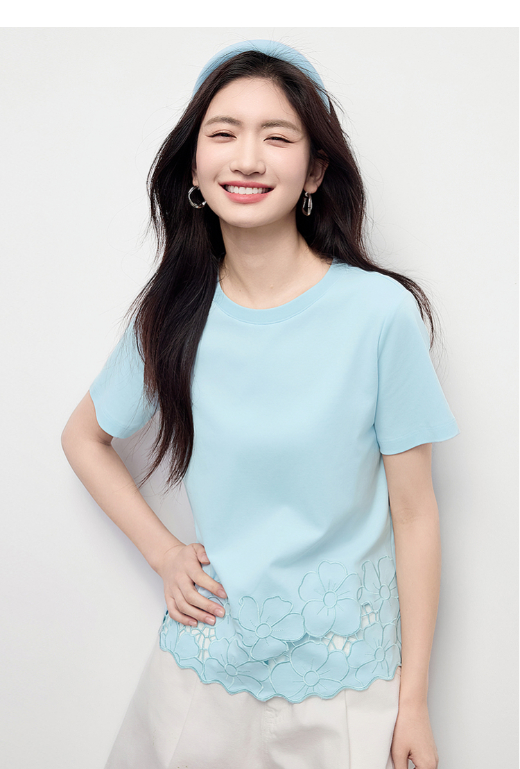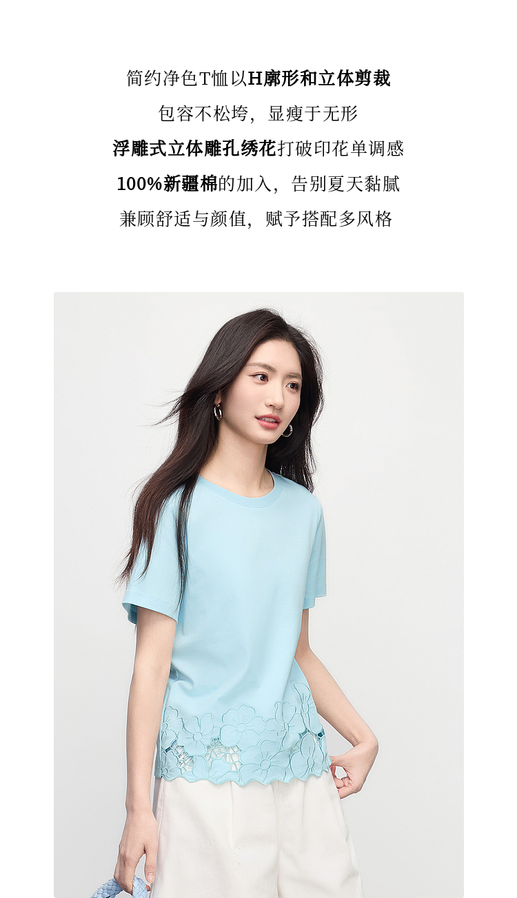 熙世界2025夏季浮雕式镂空绣花T恤女短袖设计感别致纯棉蓝色上衣