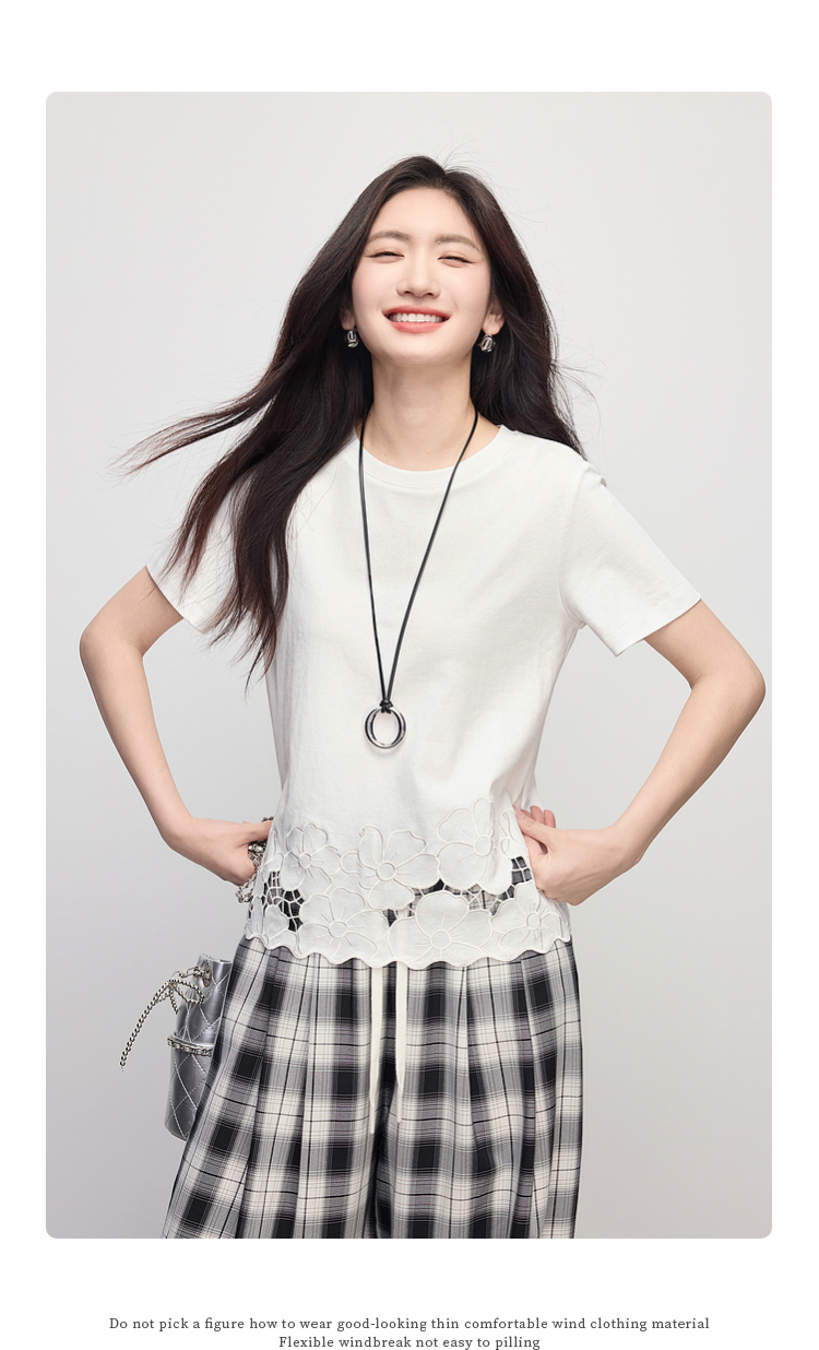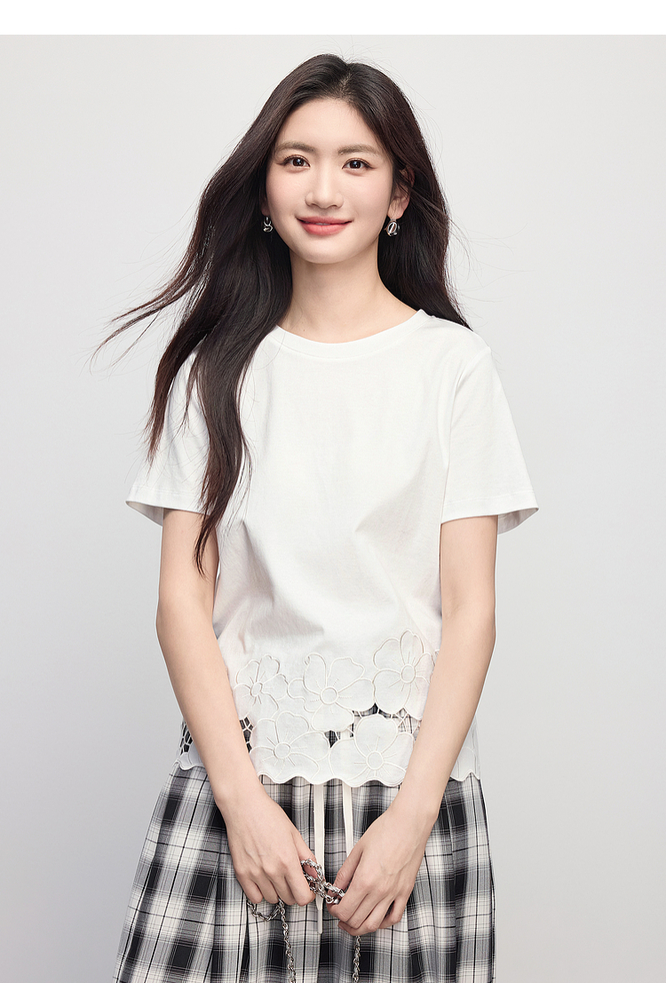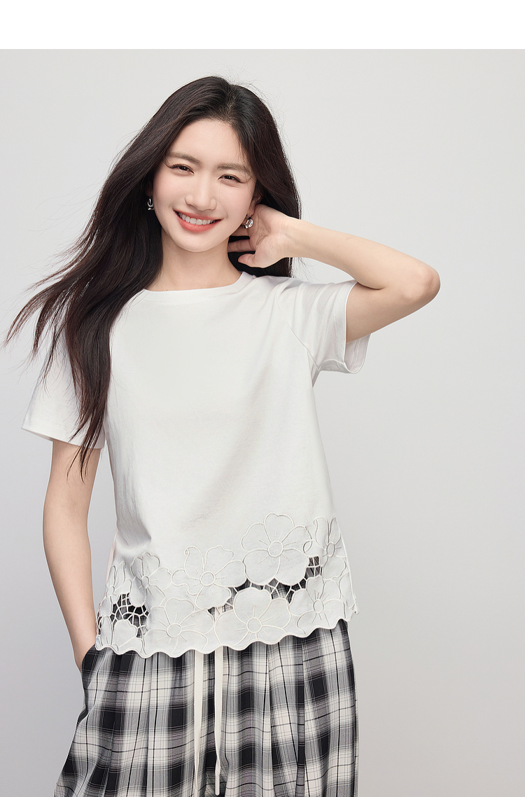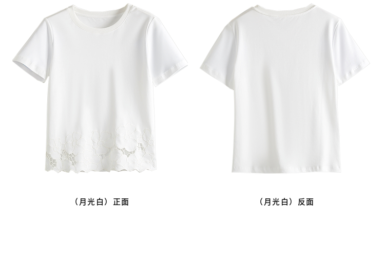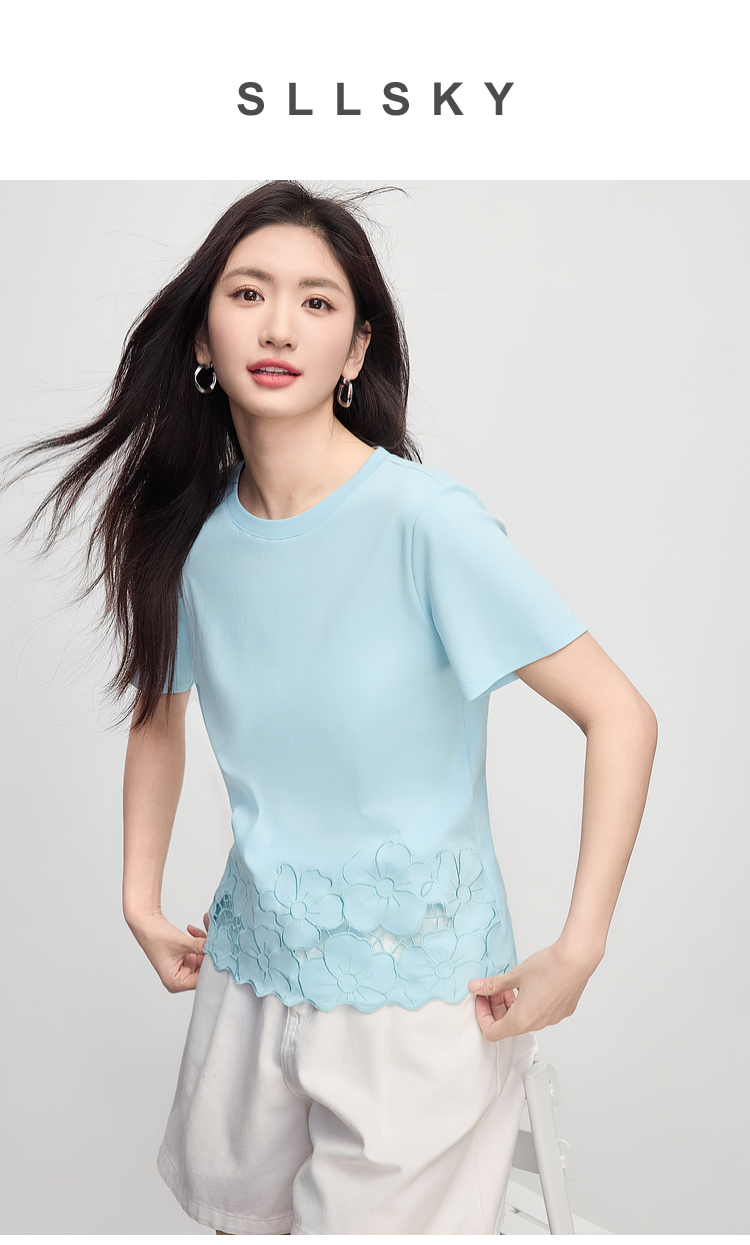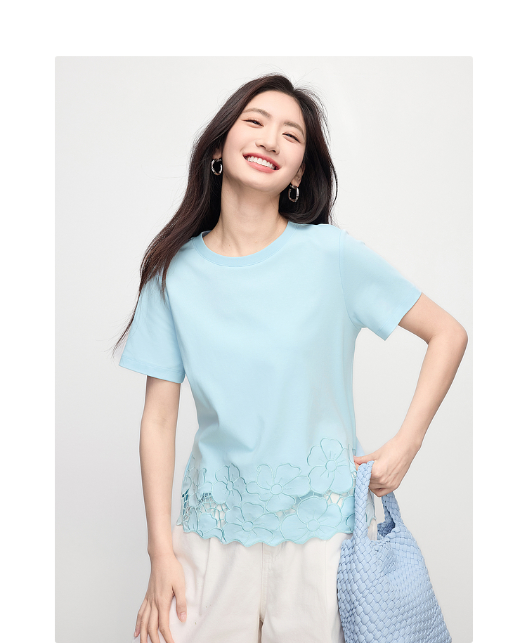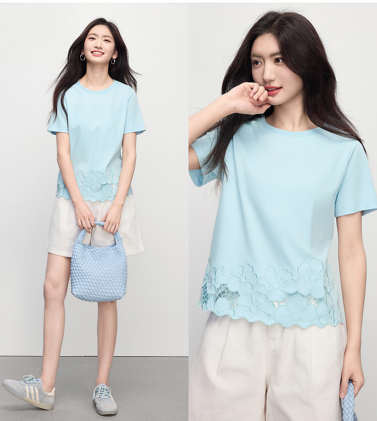 熙世界2025夏季浮雕式镂空绣花T恤女短袖设计感别致纯棉蓝色上衣