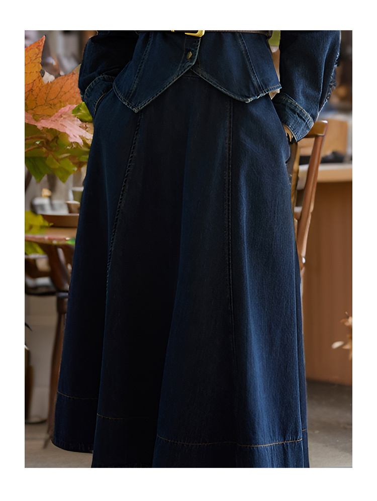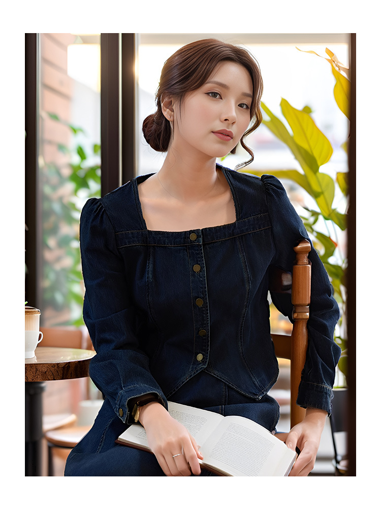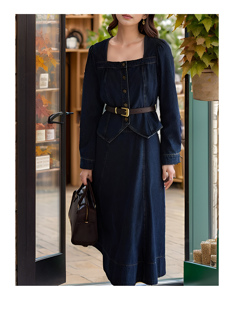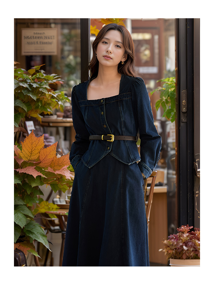 9/10奢姿大码女装2024秋季气质方领牛仔两件套胖妹妹系带设计时尚套装9943834075
