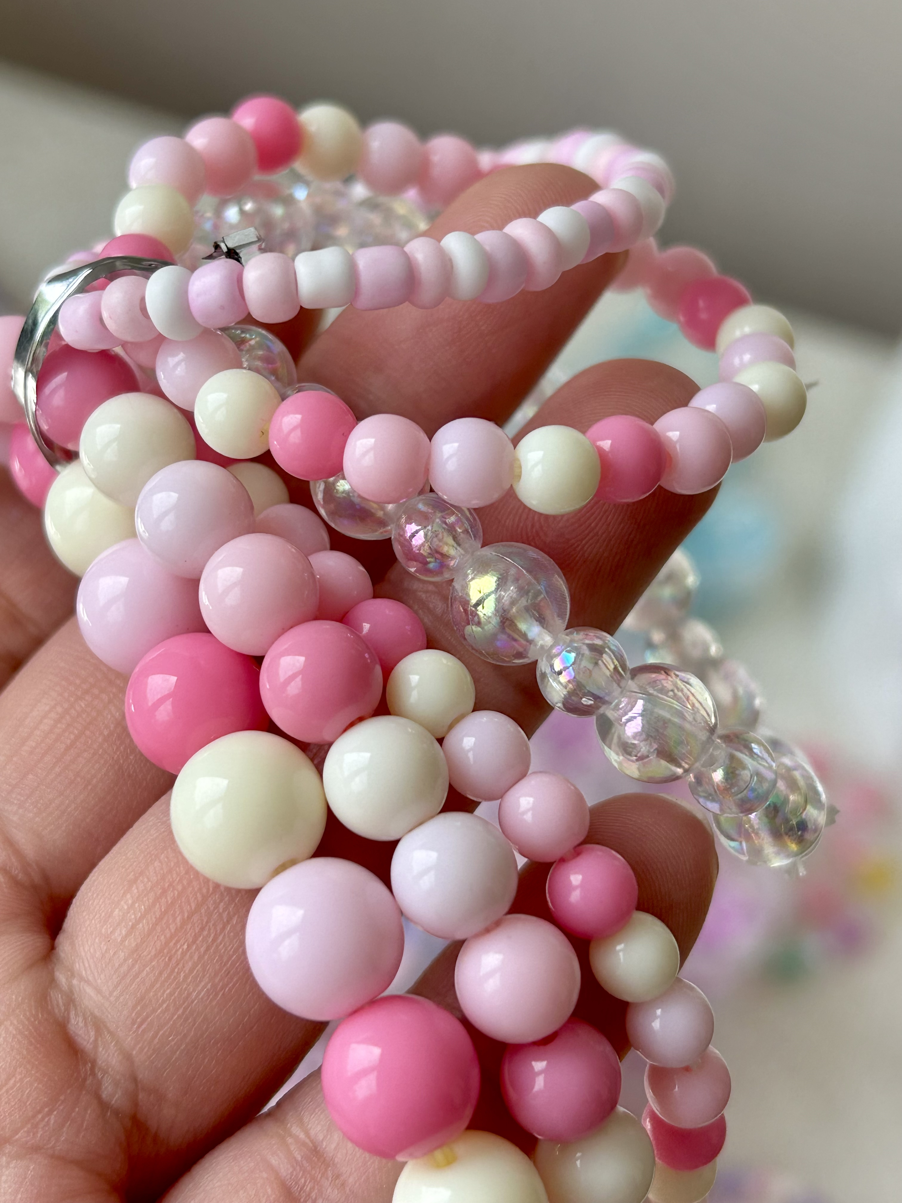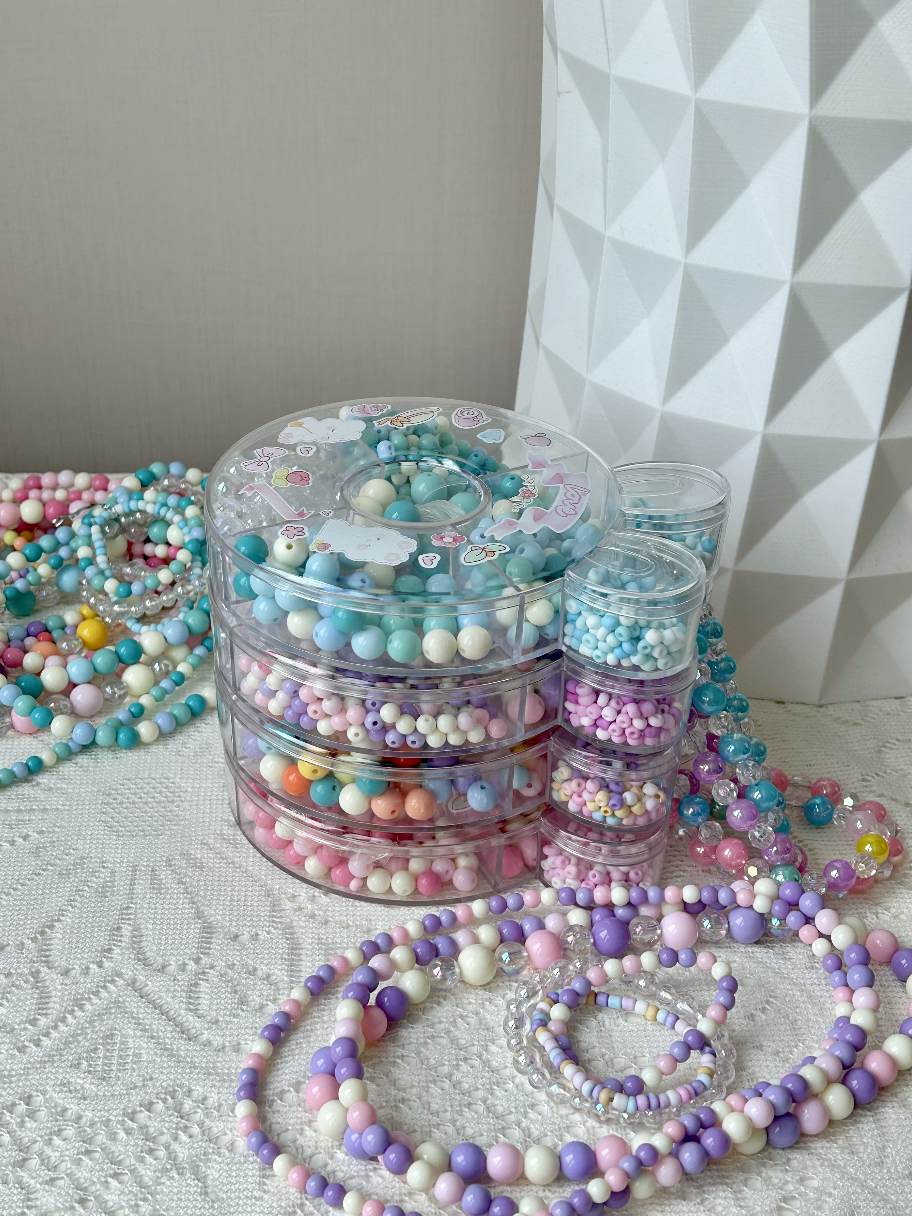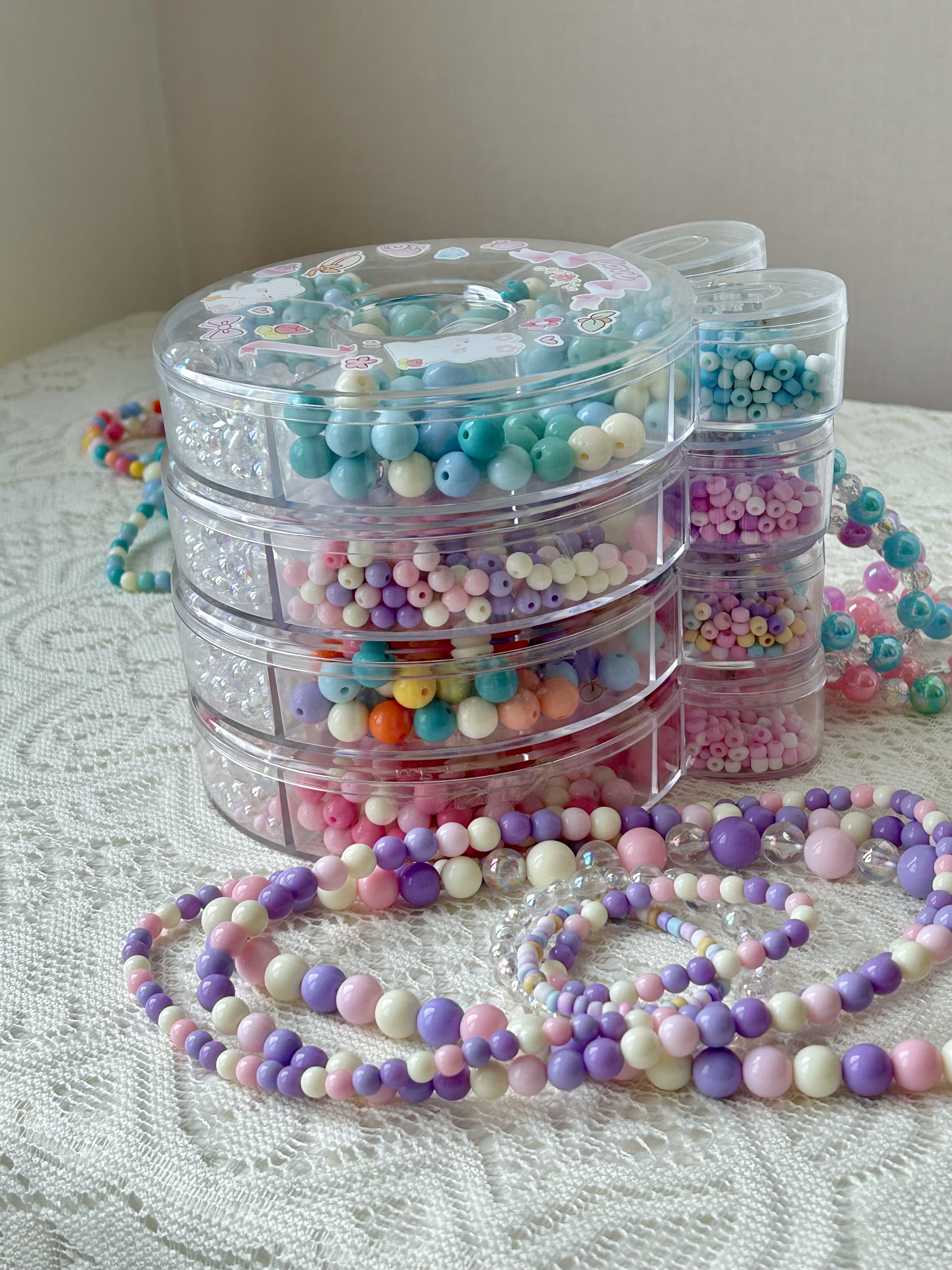 五颜六色的小珠子串成手链项链 也可以用来装点心爱的物品和家中各个角落 既能美美哒又能远离手机电脑💻 2.5m弹力线➕300多颗珠珠 可以制作出3条项链➕3条手链 粉、紫、蓝、黄是最适合夏天的颜色 形状不同但风格统一 上手干净清爽又甜美~