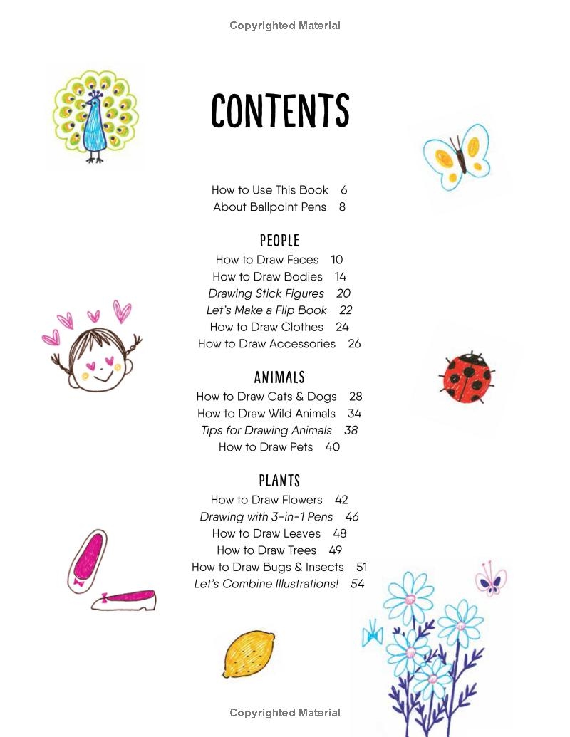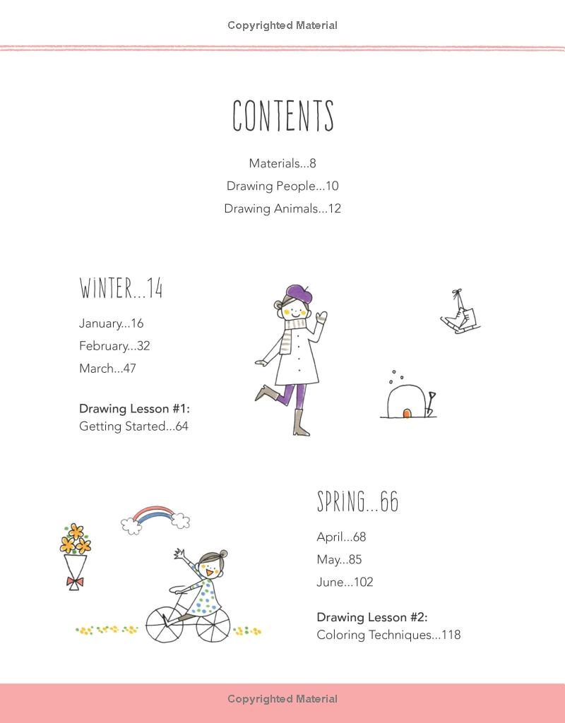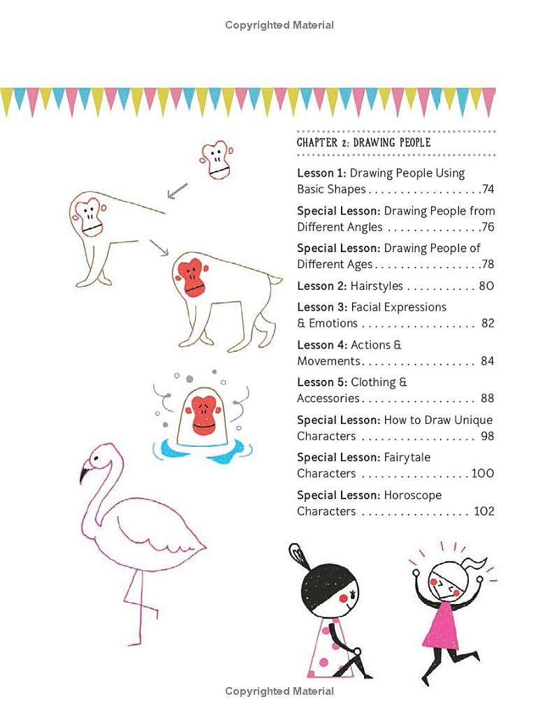 绘制动物、人物、日常物品、图案和边框,以及节日和季节主题,并包含热身练习和特别课程。