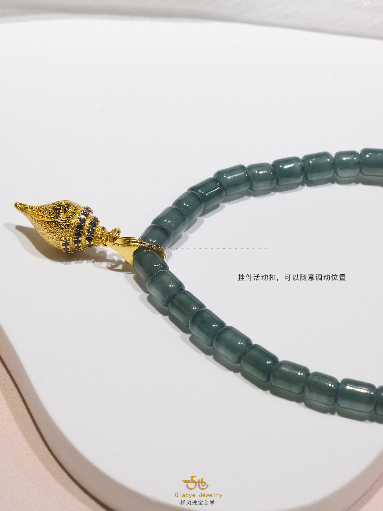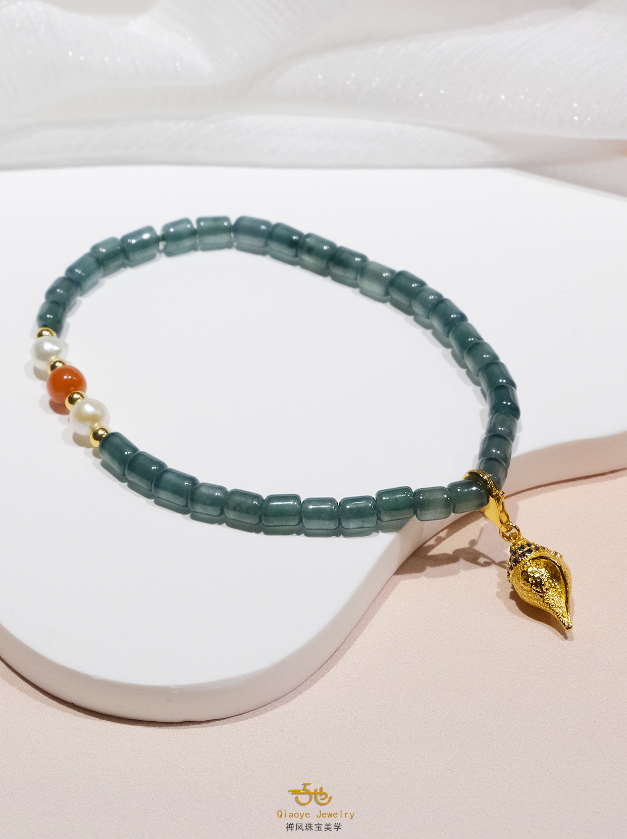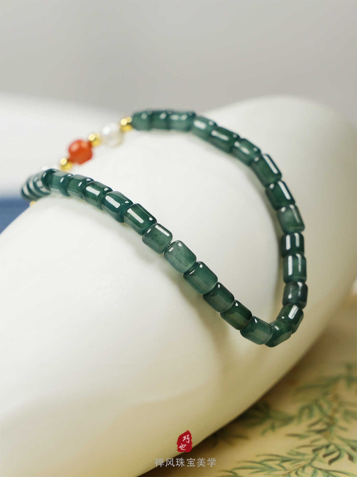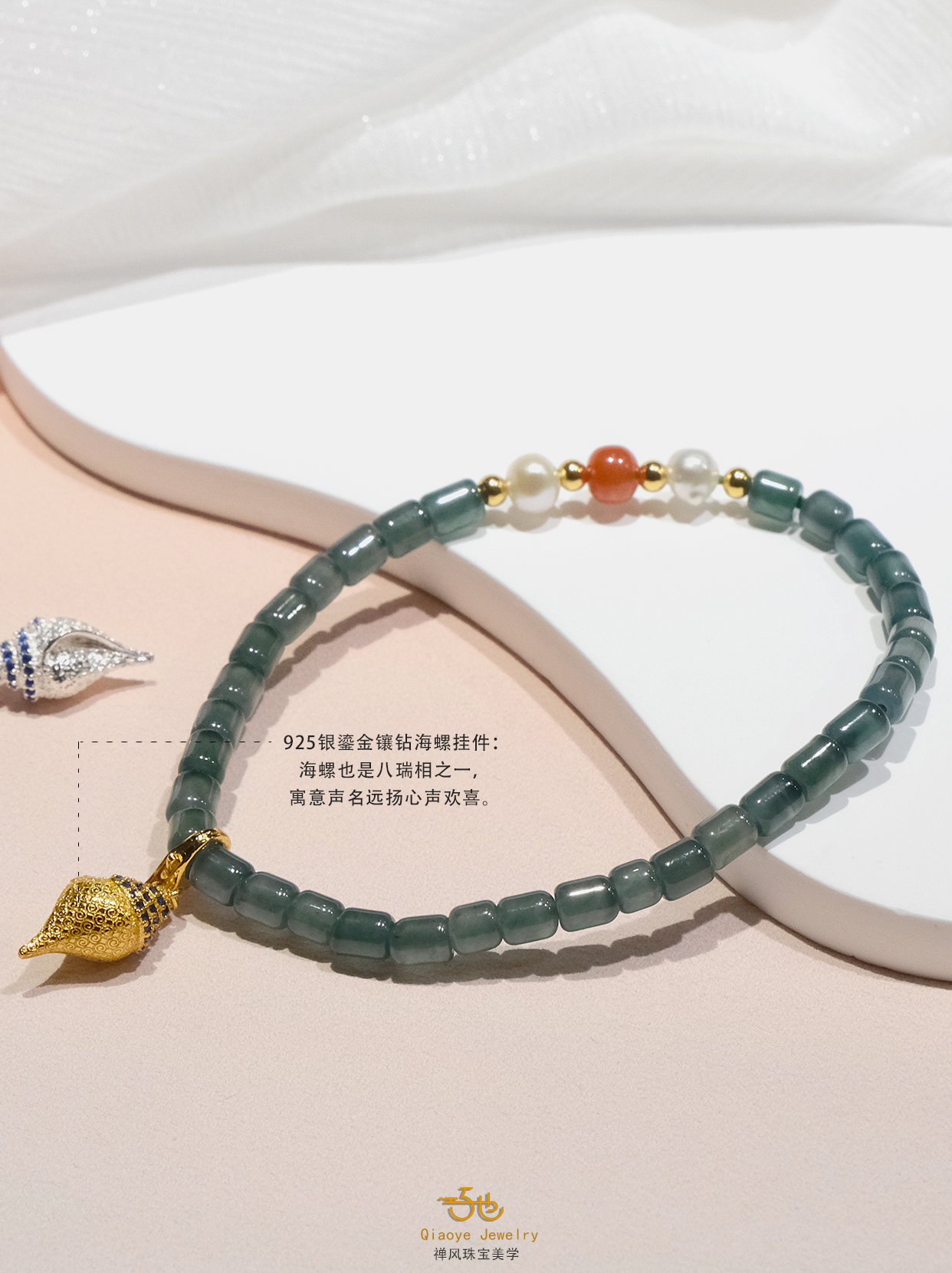 取天然蓝水翡翠为天青底色,缀天然珍珠作鲛人泪,间以川南红题朱砂旧契。银鎏金转经轮悬垂如月,轮转时流光溯回,似李清照把玩金石那一瞬的凝眸。蓝玉生凉处,藏着盛唐未寄出的铜镜约;朱砂晕染时,醒转两宋离散的胭脂诺。