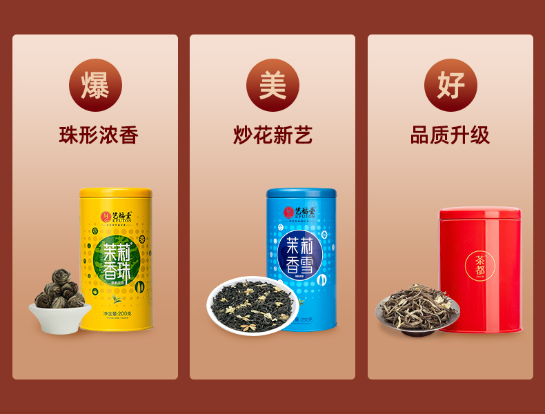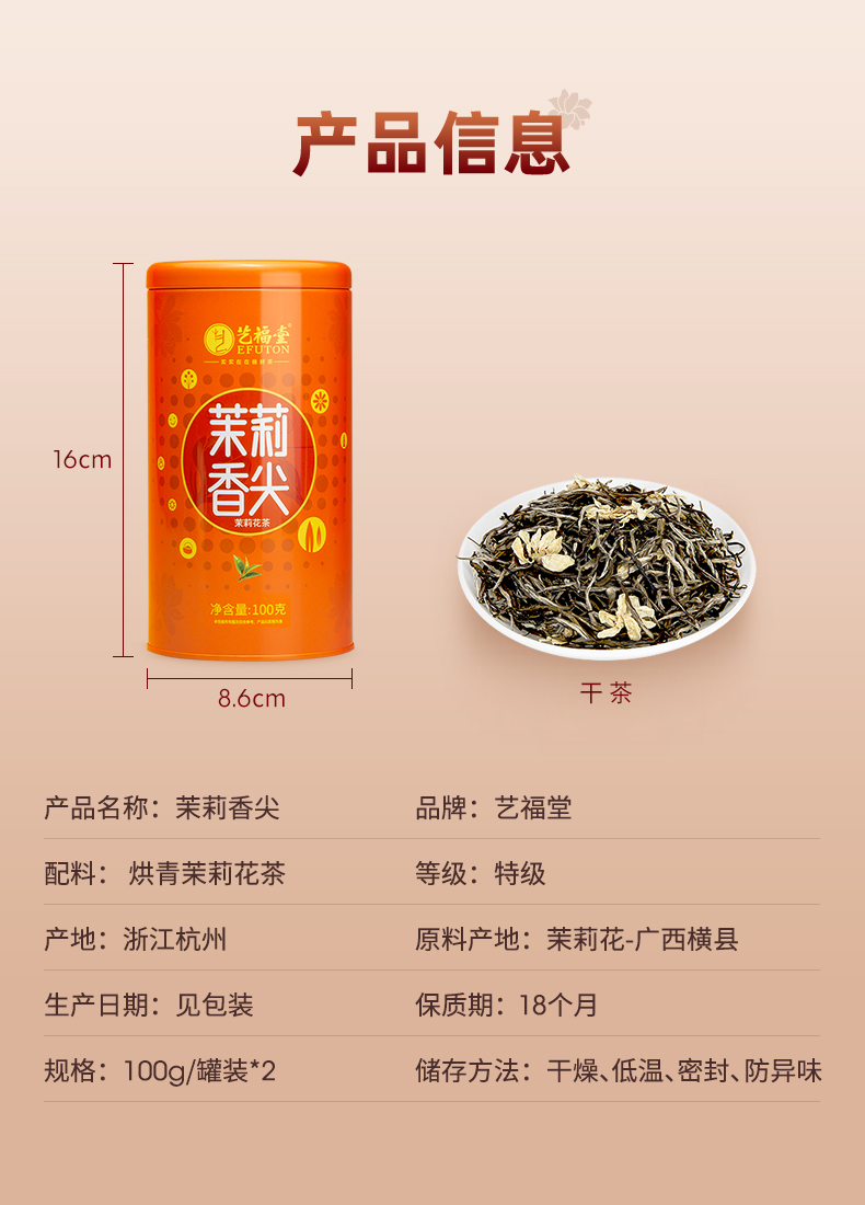 【下单减25,第2组半价送茶叶罐】艺福堂 特级茉莉花茶 茉莉香尖 散装茶叶 100g/罐*2