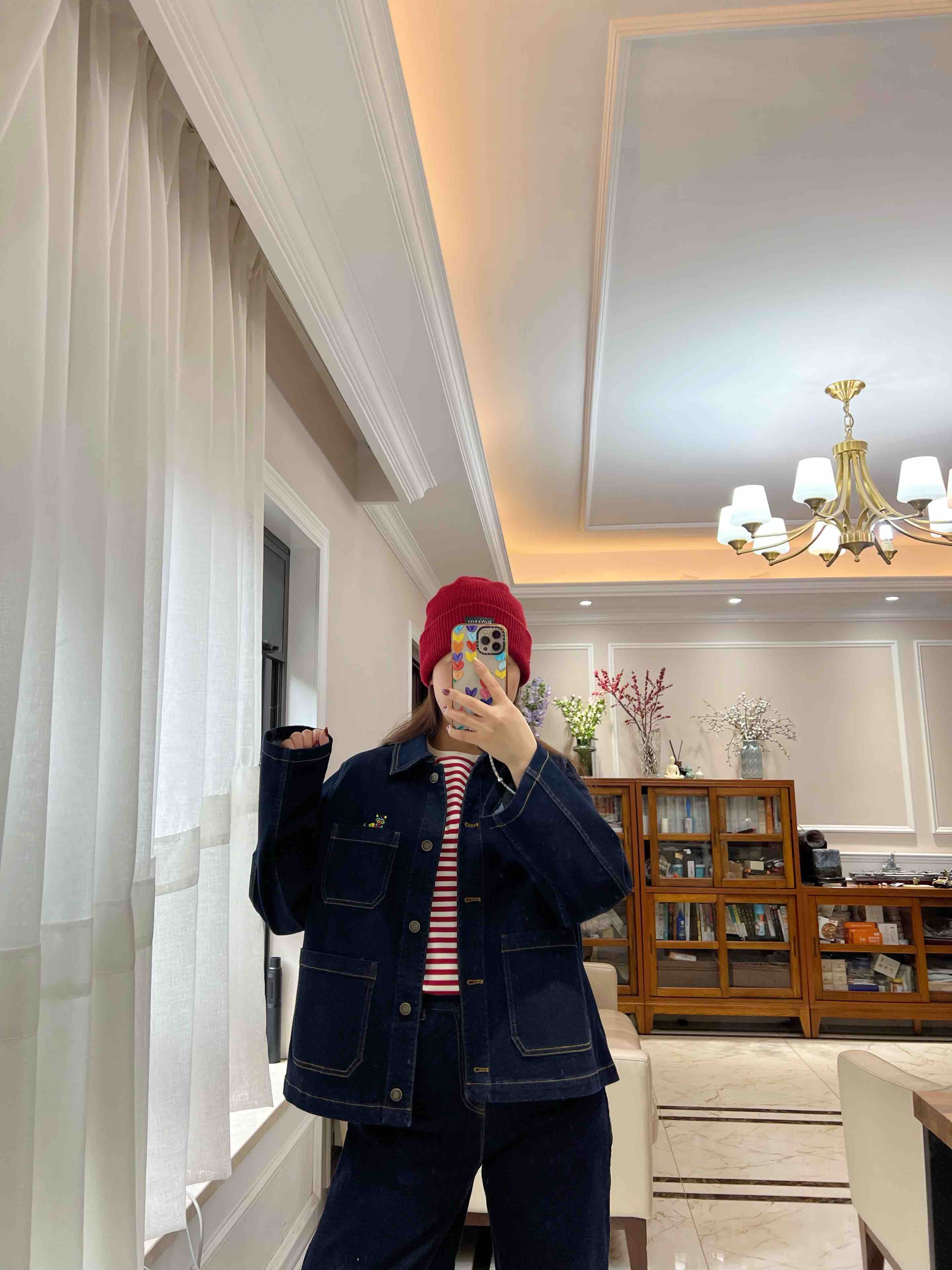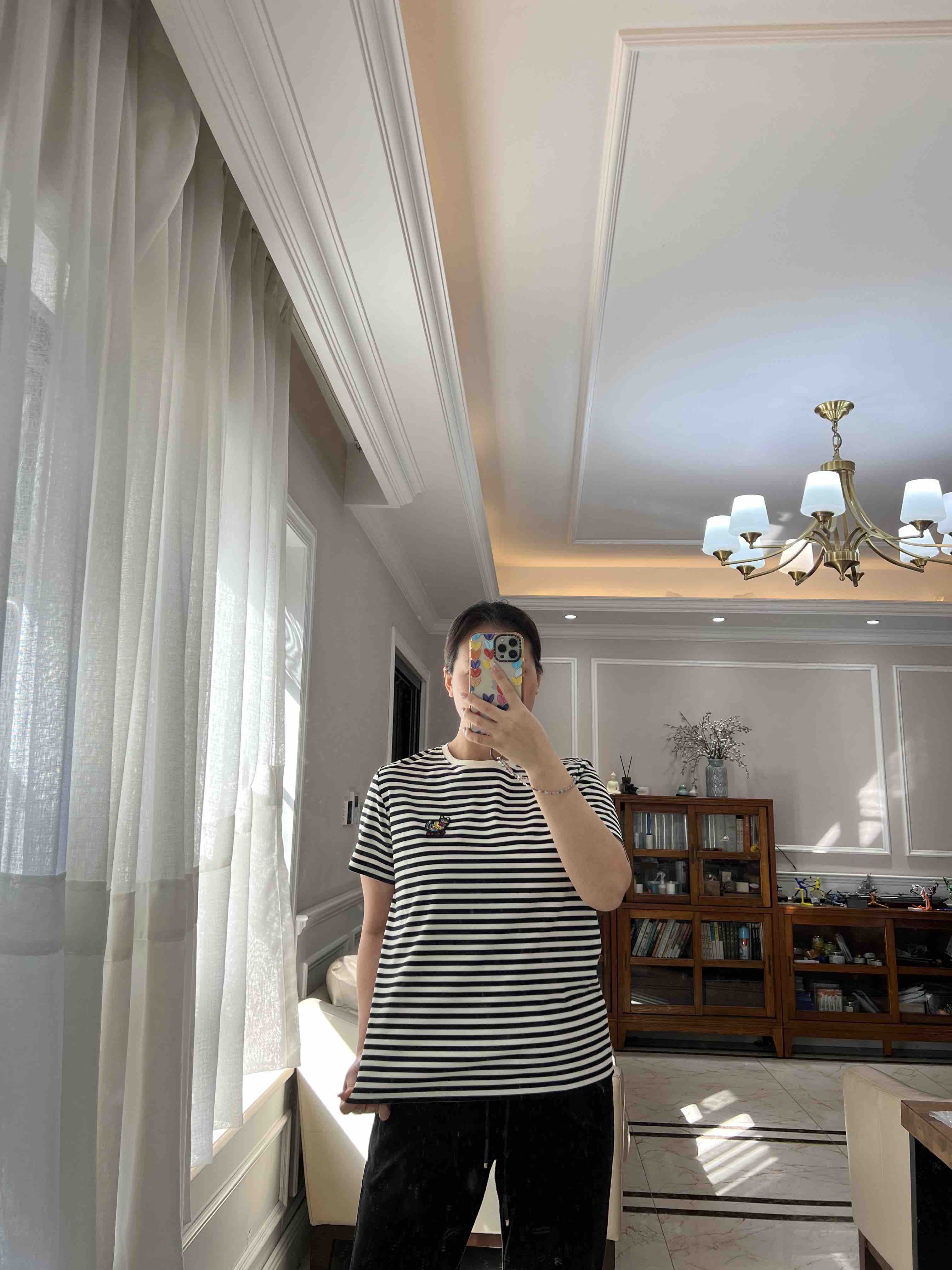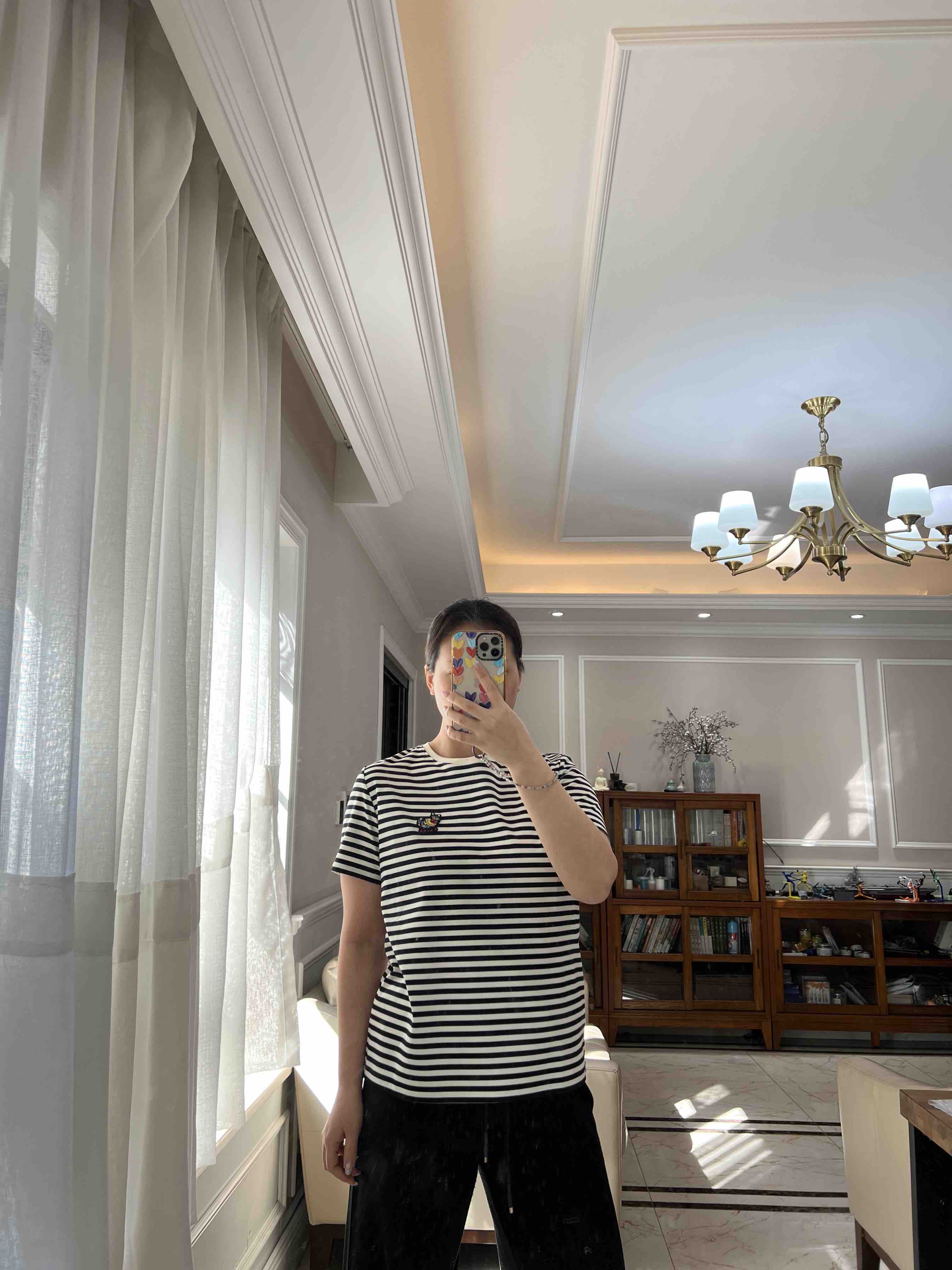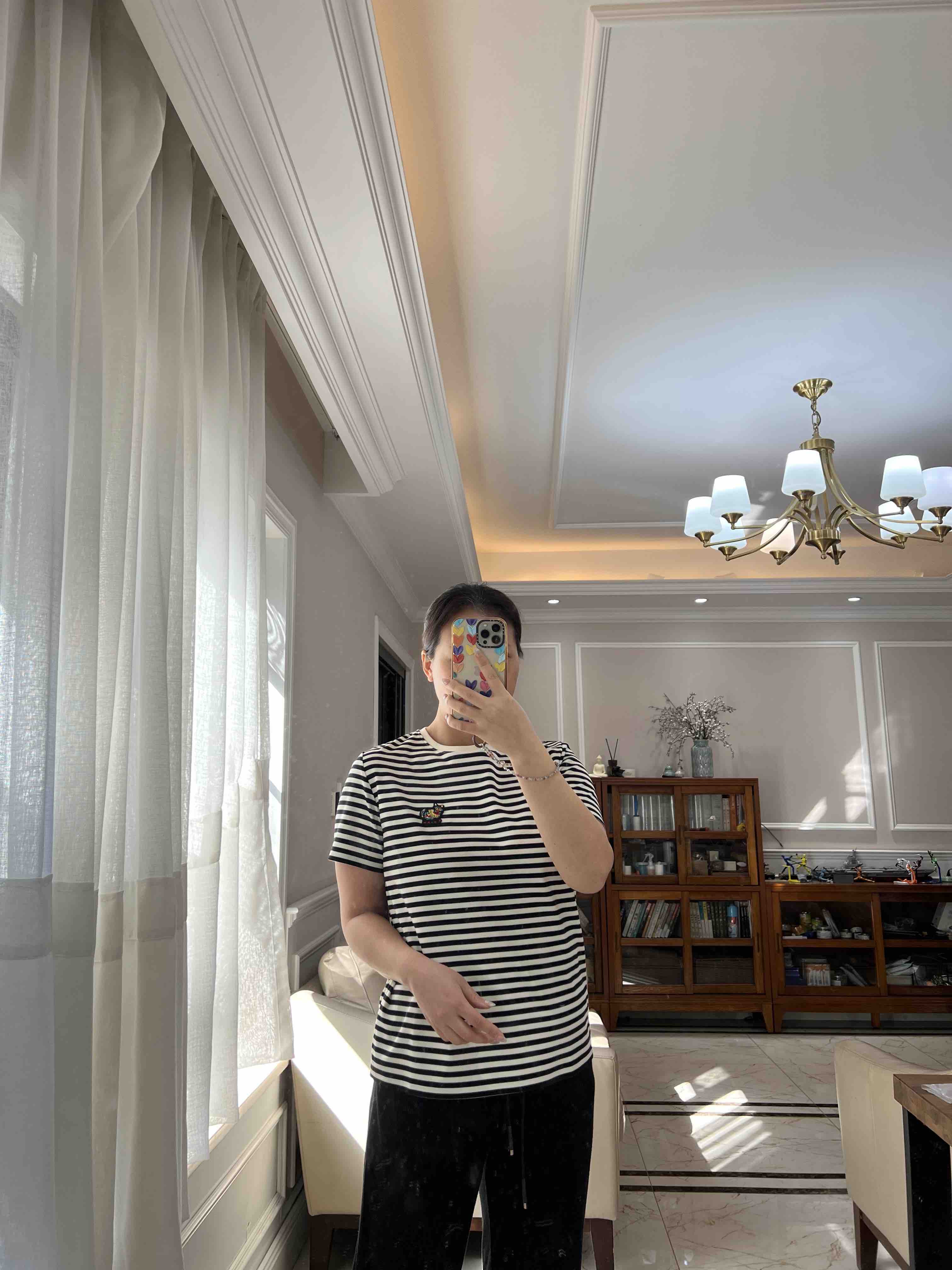 水柔棉针织面料,摸上去就是相当的丝光,柔滑,细腻,自带光泽,你们看这个做工,后领防水洗变形的贴布,条纹都是严格对齐,下摆的收针袖口的收针,非常的细致。招财猫,喵喵喵,就像小时候棉鞋上绣的图案了。