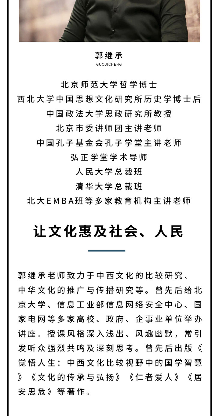 - 继承之道致力于中华优秀传统文化的推广和卓越人才的培养,通过线上+线下的课程形式,将文化精品的智慧与现实人们的需要结合起来,力求学以致用,从而实现个人、家庭和社会的共赢!