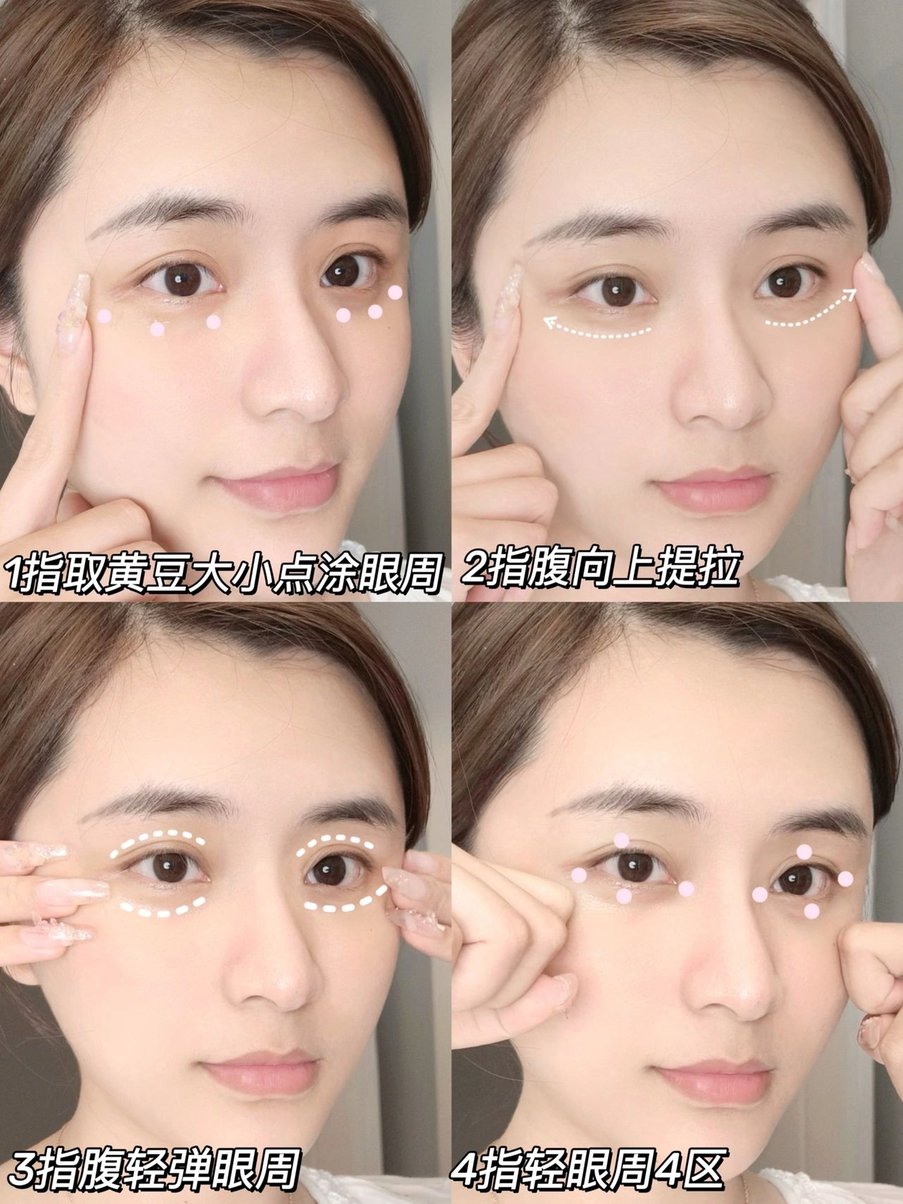 先取一点眼霜涂在眼周,然后提拉,再轻弹,最后按摩眼周4区穴位
