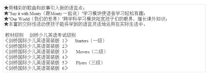《剑桥国际少儿英语》倡导为孩子的英语学习创造一个自信的起点,并让老师充分体验语言教学的乐趣。同时,这套教材全面培养孩子 的听、说、读、写技 能,其内容涵盖了剑桥少儿英语考试大纲所有相关的语法结构和词汇,学完本套教材的相关级别即可达到剑桥少儿英语考试的各级水平。