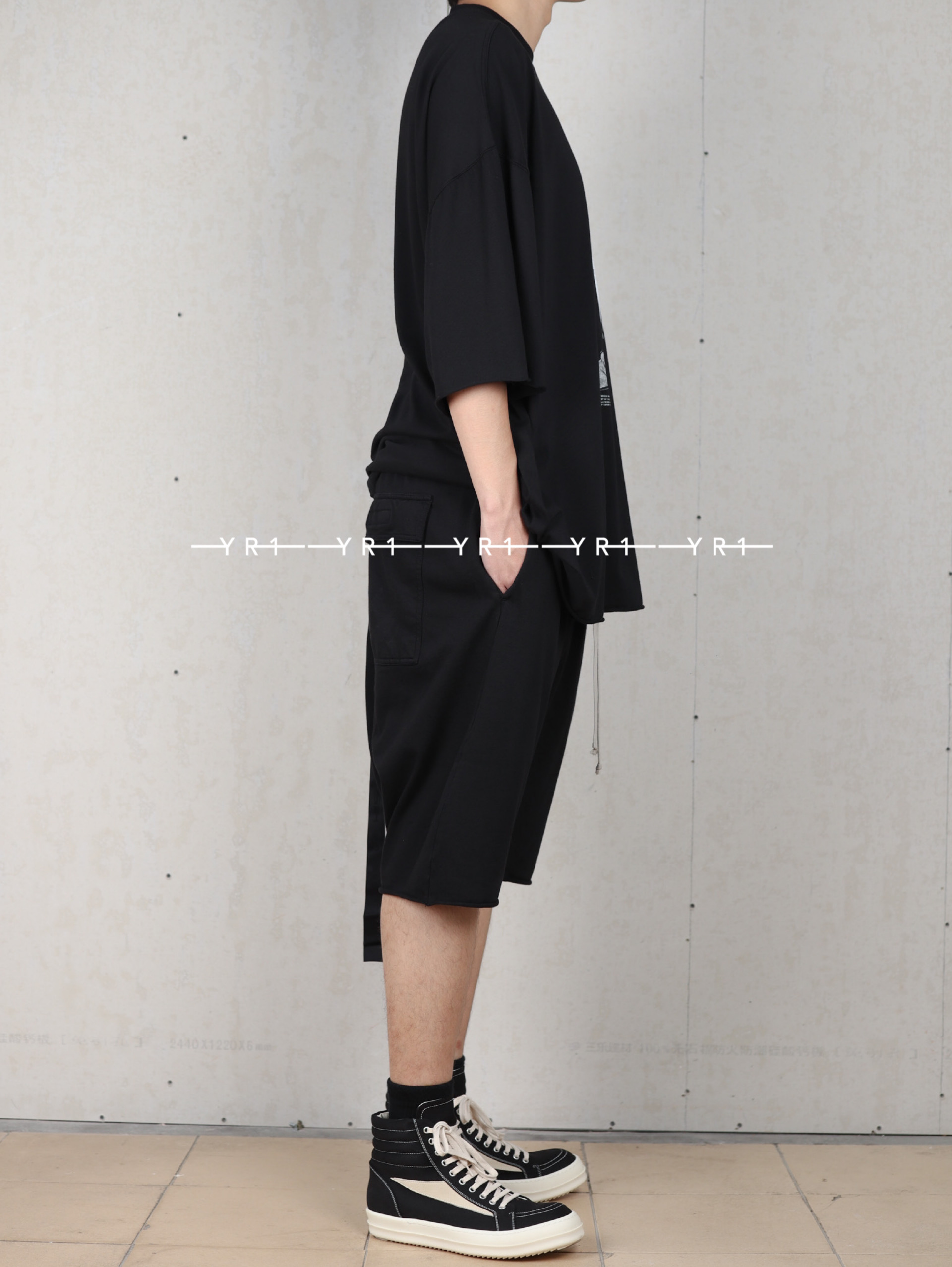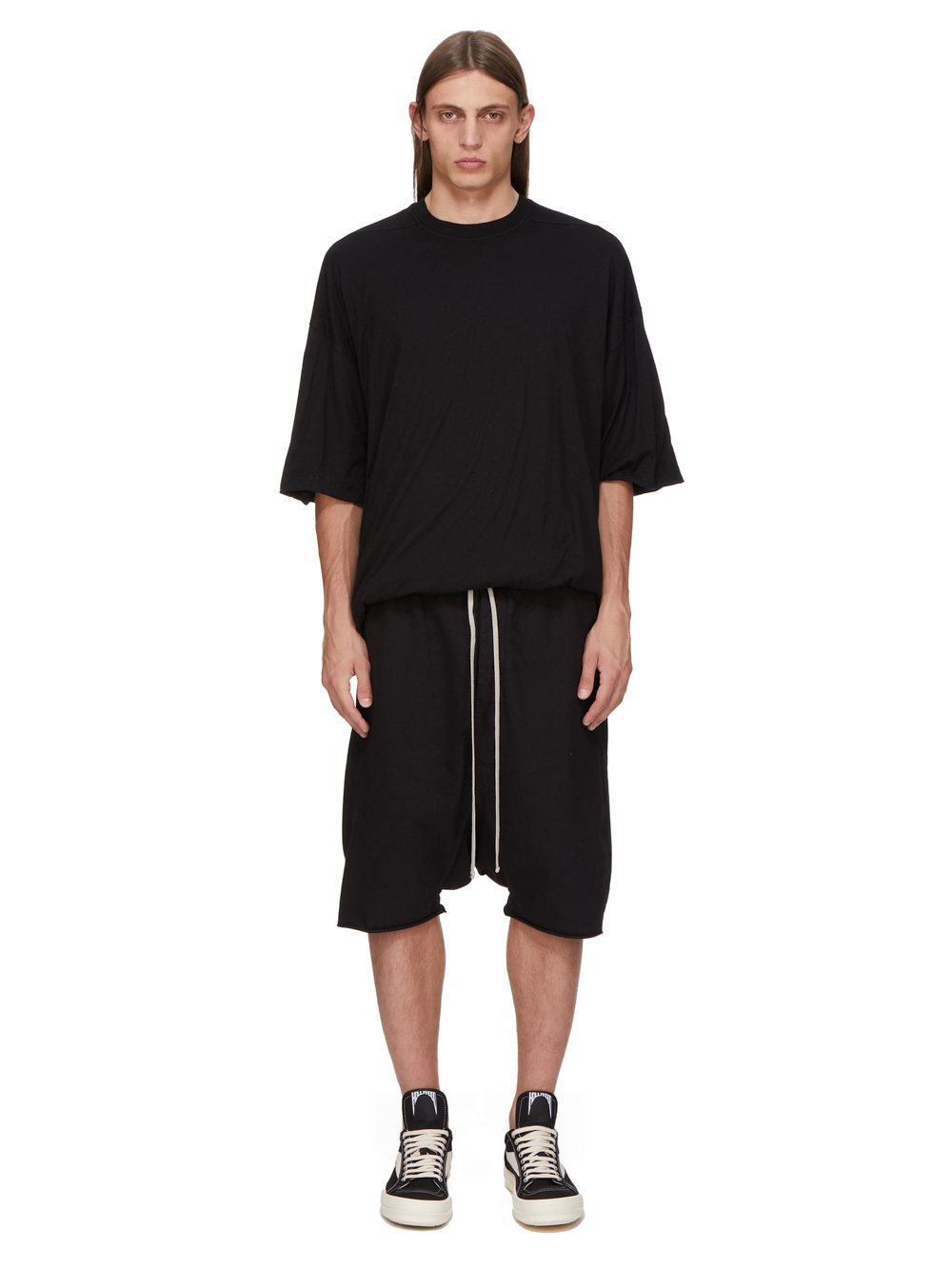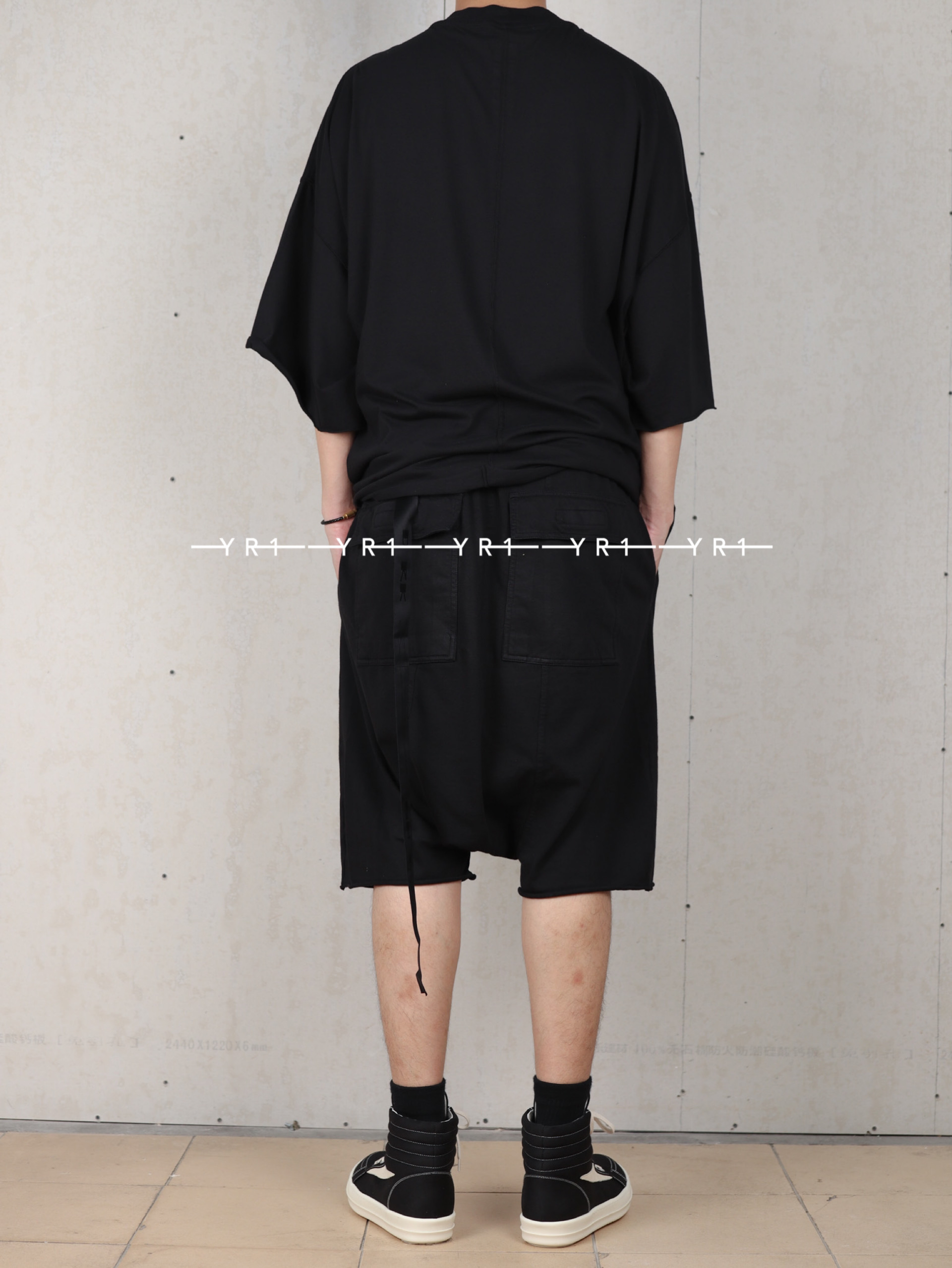 这些抽绳裤长度在膝盖以下,裤裆低垂。