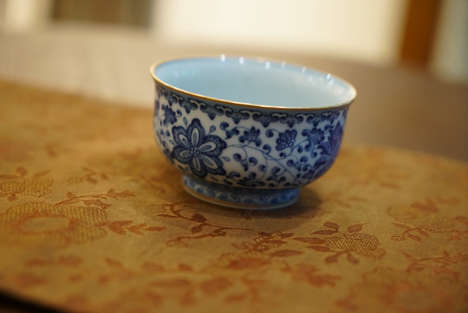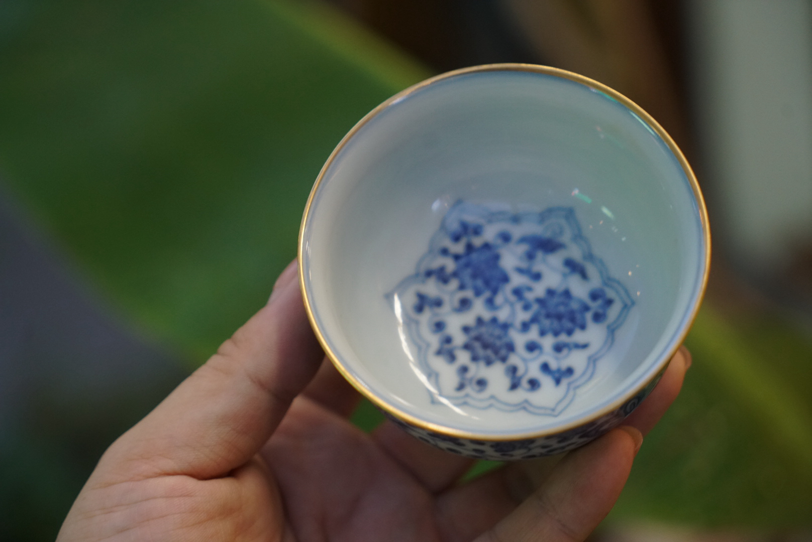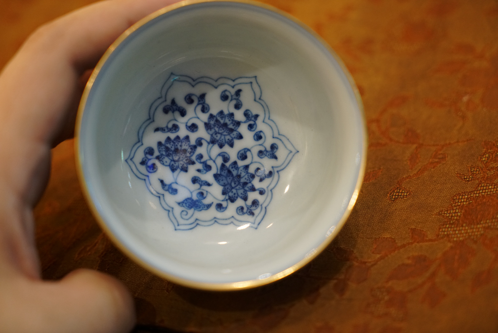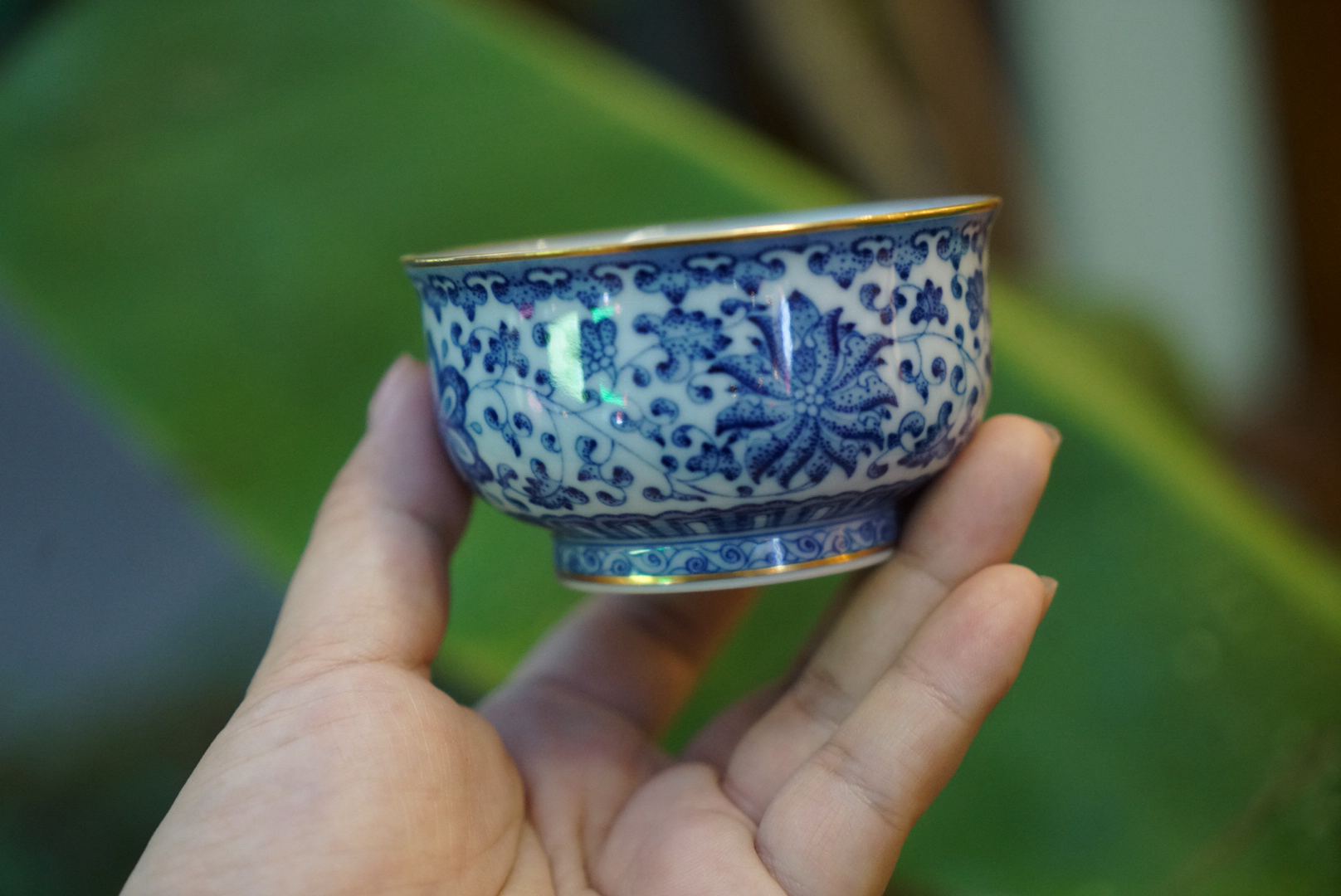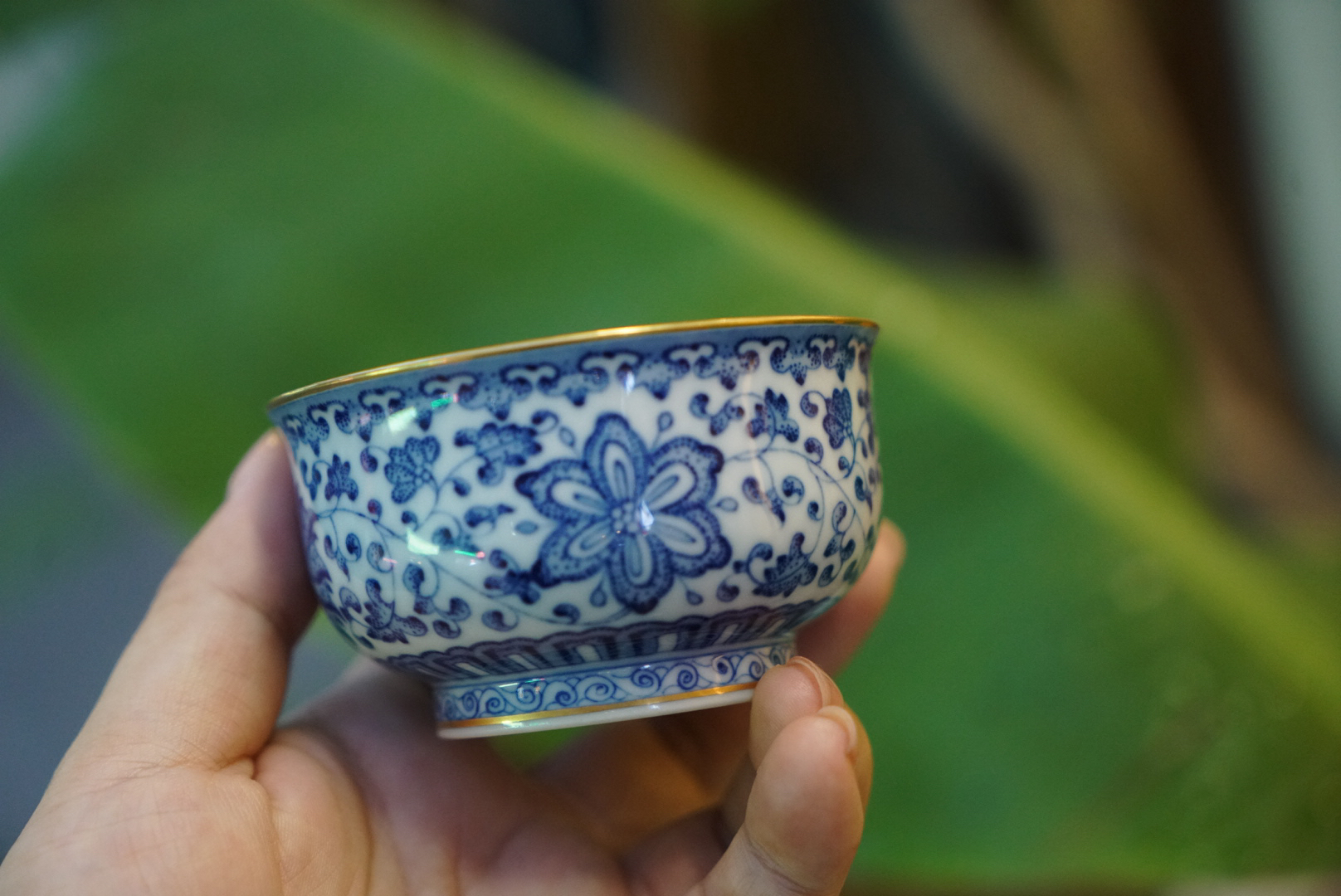 柴窑青花缠枝莲金口杯,青花发色非常漂亮,全手工,笔触精美细腻,生动,疏密有致。瓷器佳品。仅一。