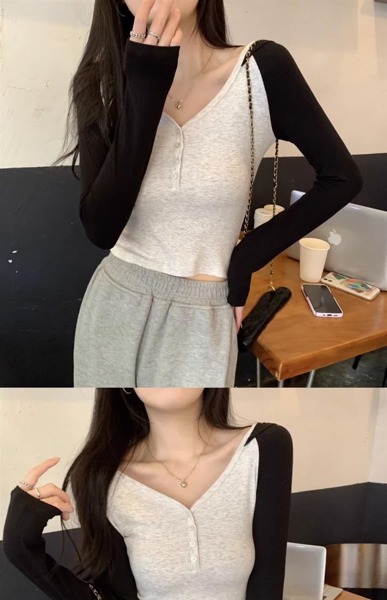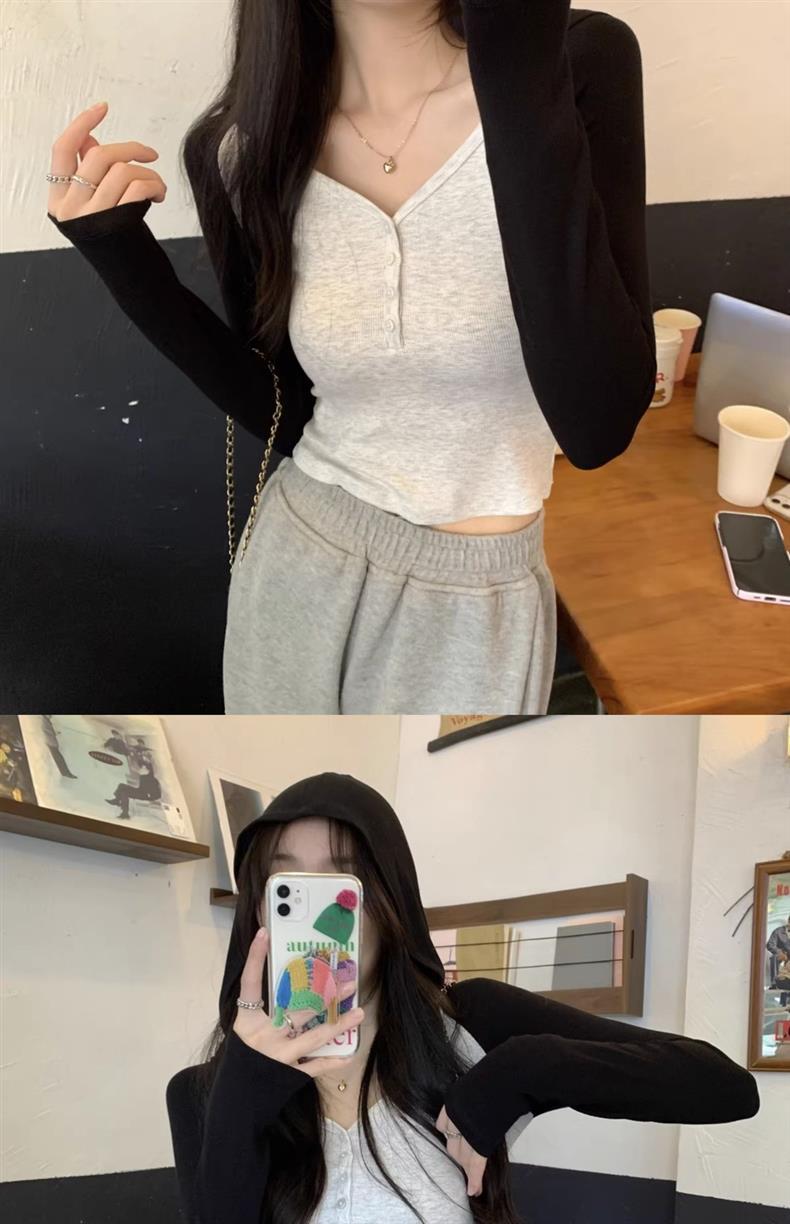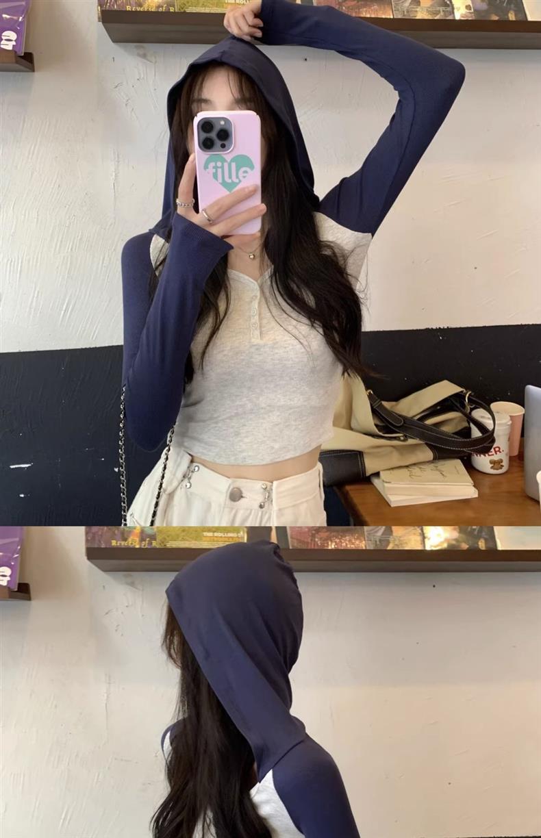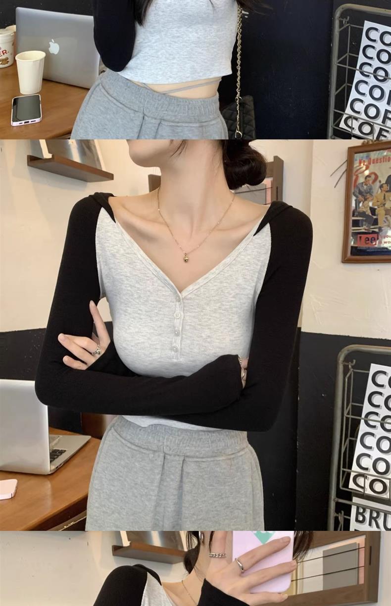 早秋新款【连帽长袖t恤女】修身显瘦 V领辣妹短款打底上衣 插肩袖拼接长袖