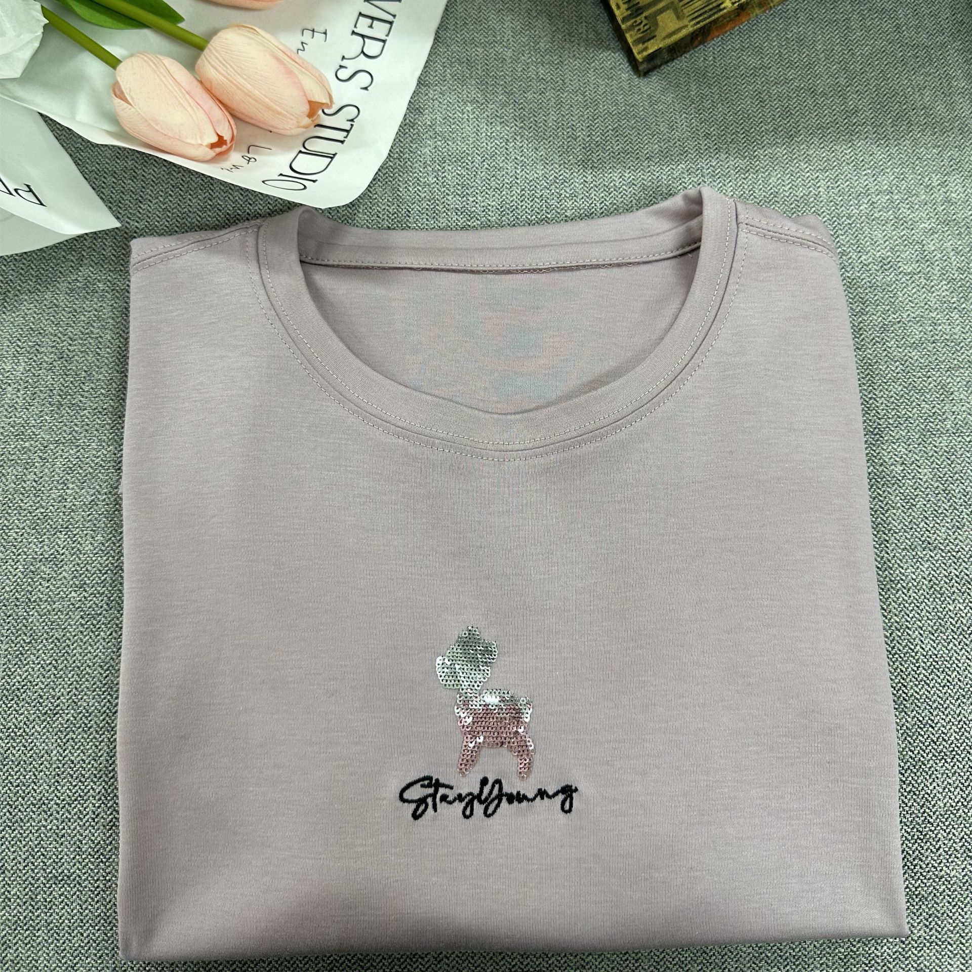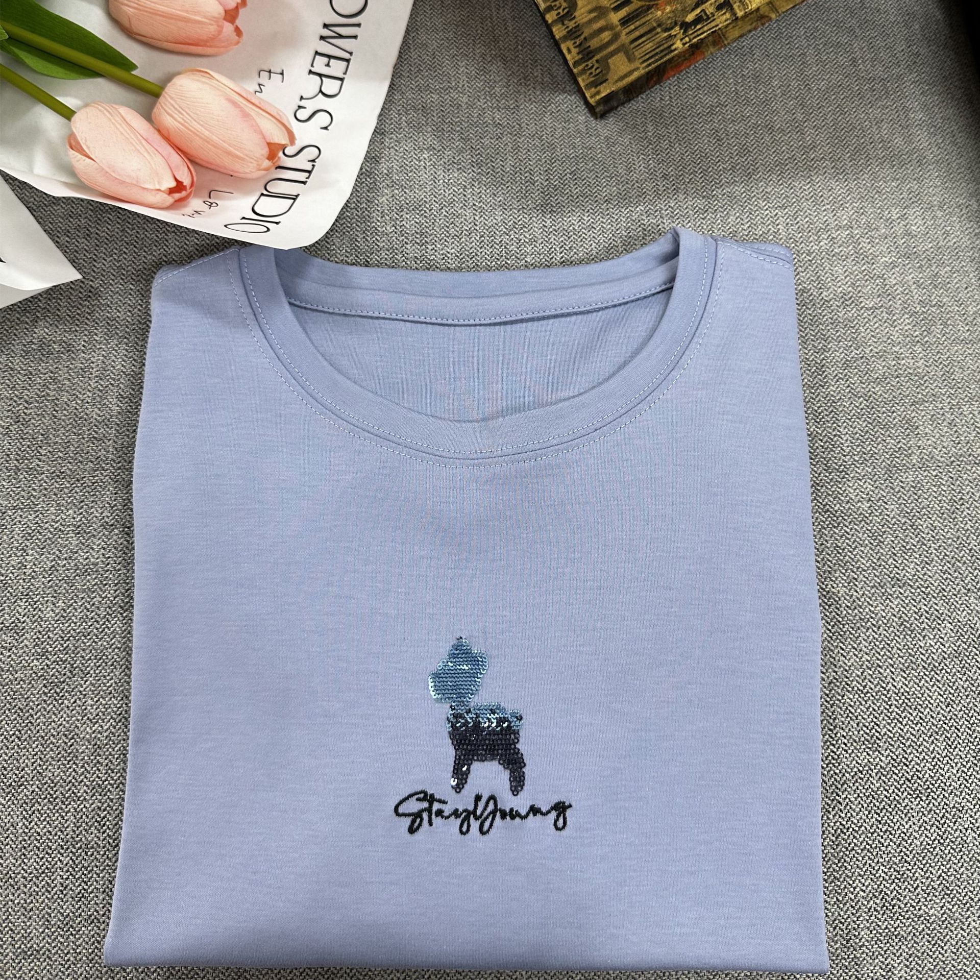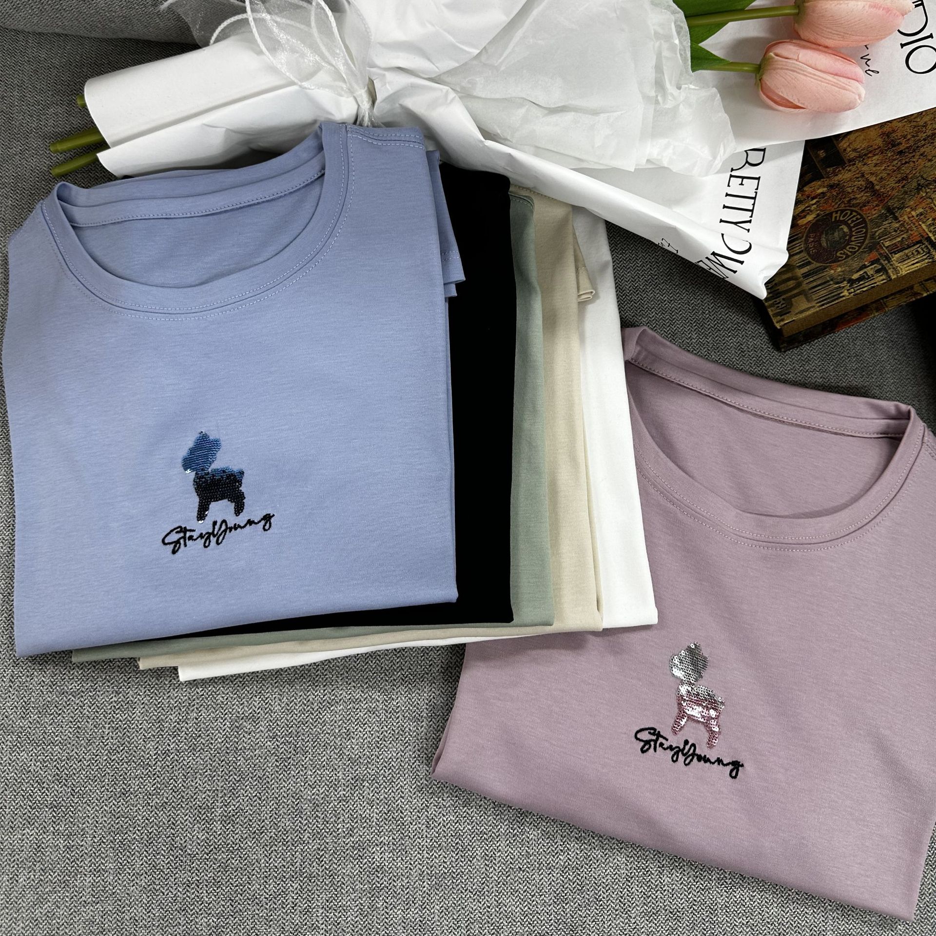 【桑蚕丝丝光棉短袖 小羊款短袖T恤女】基础款 宽松小羊款 刺绣字母搭配短袖T恤女