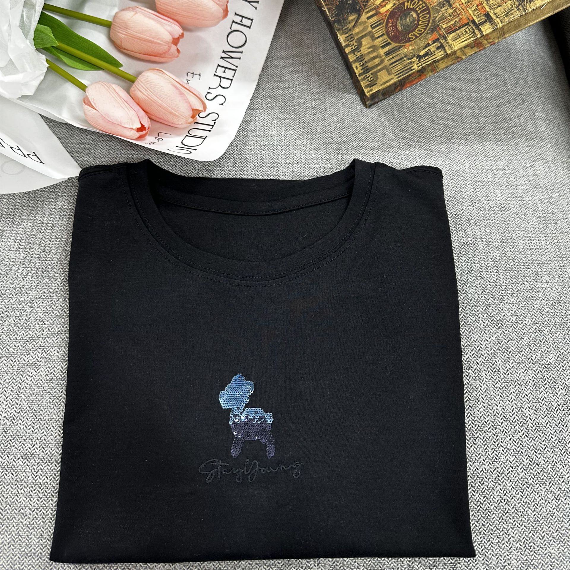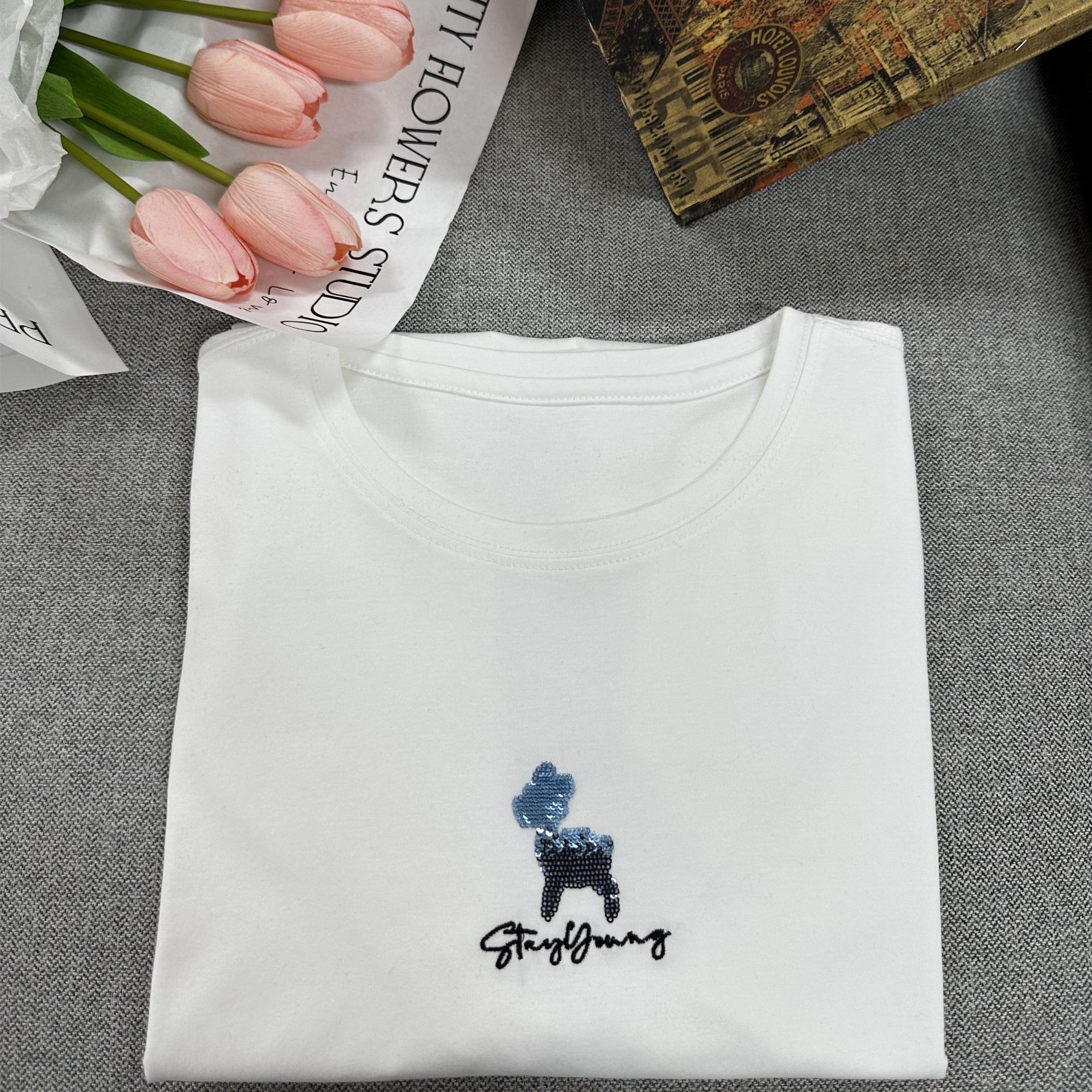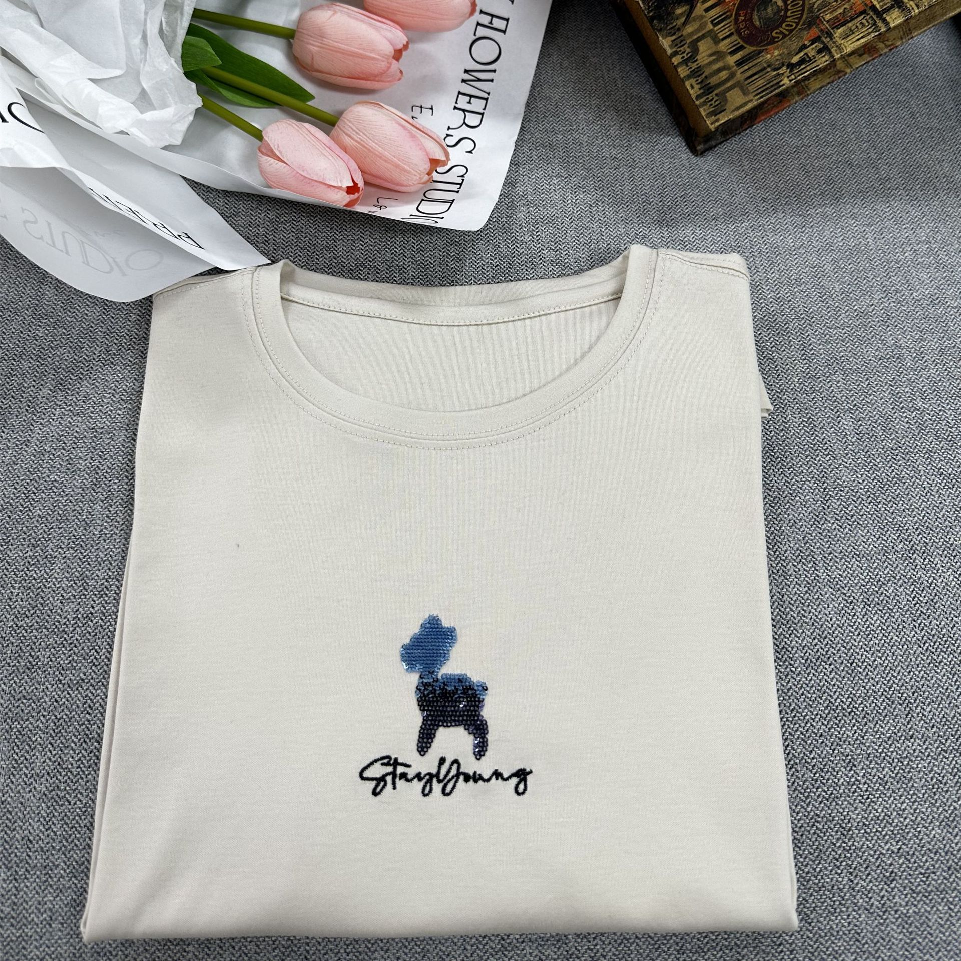 【桑蚕丝丝光棉短袖 小羊款短袖T恤女】基础款 宽松小羊款 刺绣字母搭配短袖T恤女