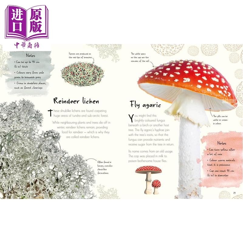 孩子们可以惊叹于各种不同的毒菌种类,包括毒蝇伞、瓷菌、绒柄菌、木紫露草和深红色蜡盖菌,以及地衣、菌盖菌等等——所有这些都通过插图、照片和注释进行了精美的详细描述。