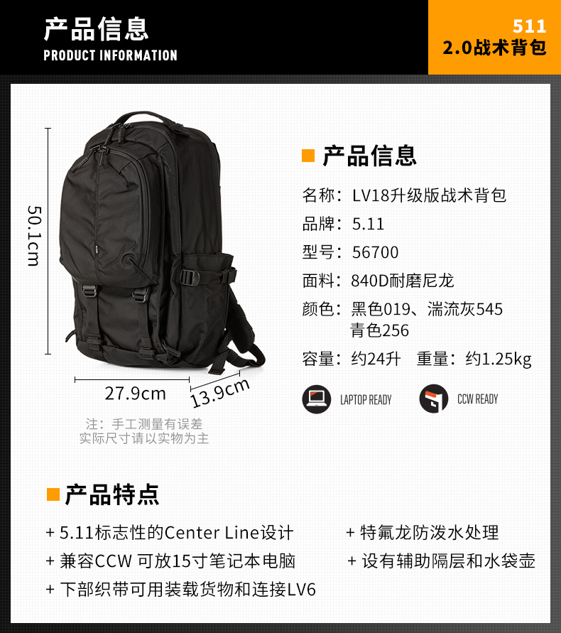 5.11新品 LV18 2.0双肩包56700城市休闲通勤包 511灰人商务战术包2.0(24L)