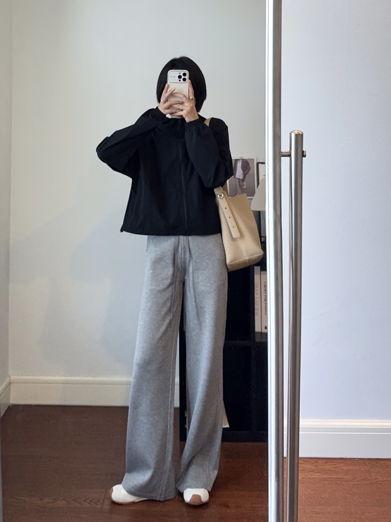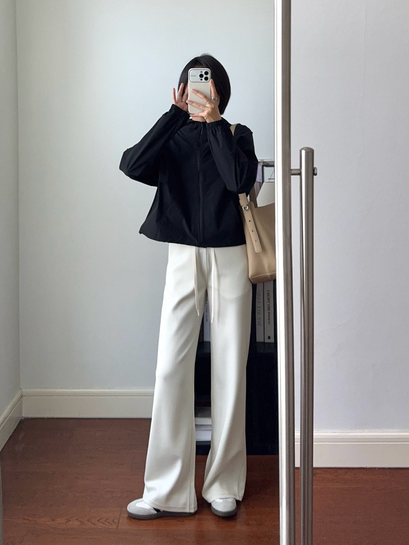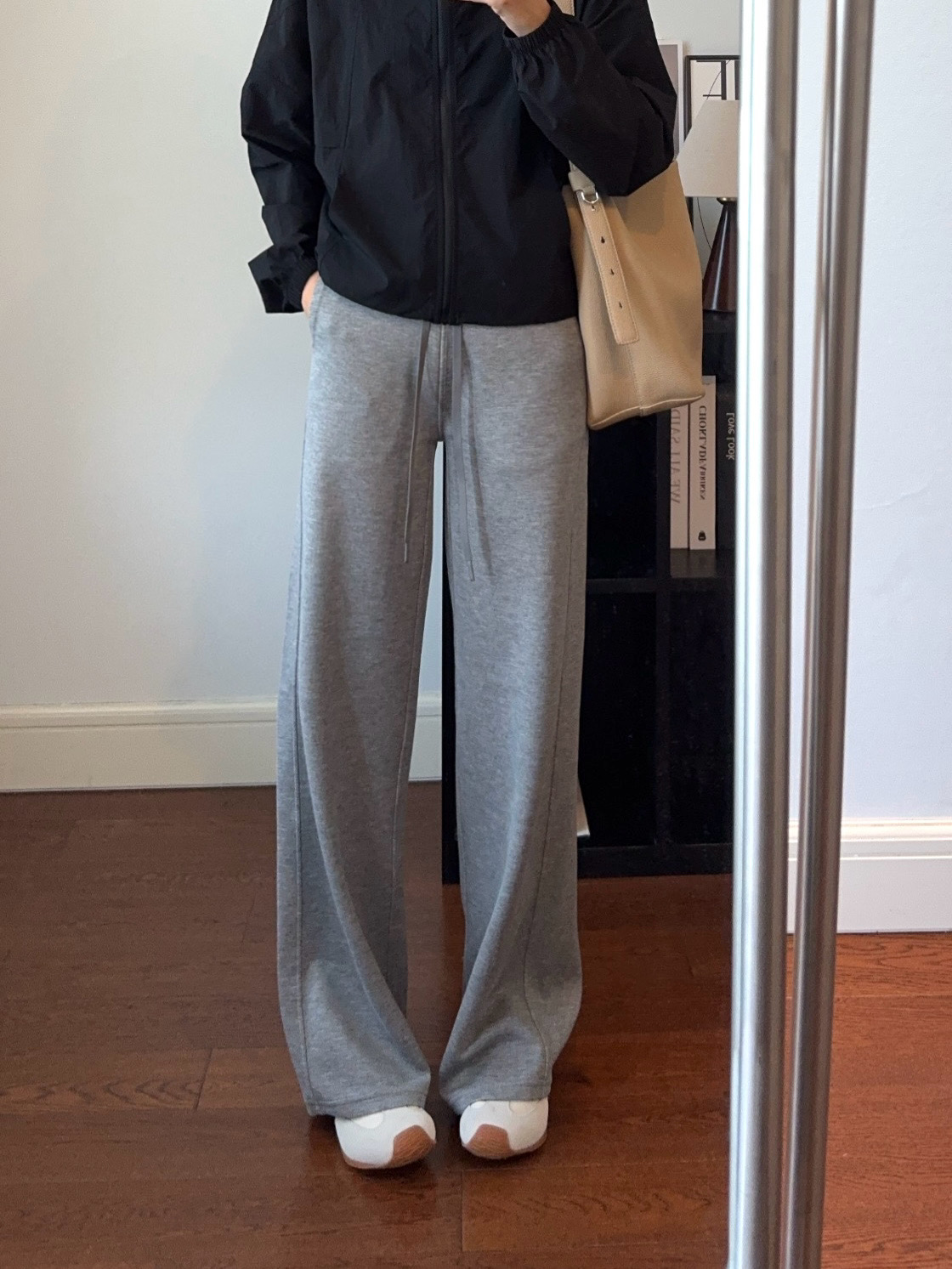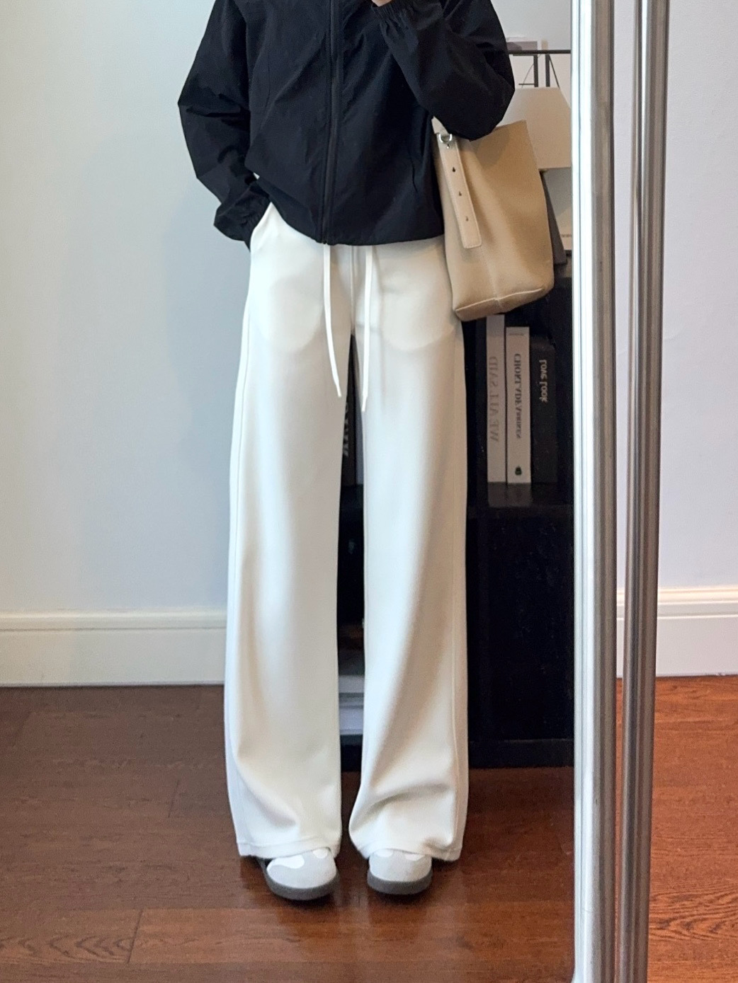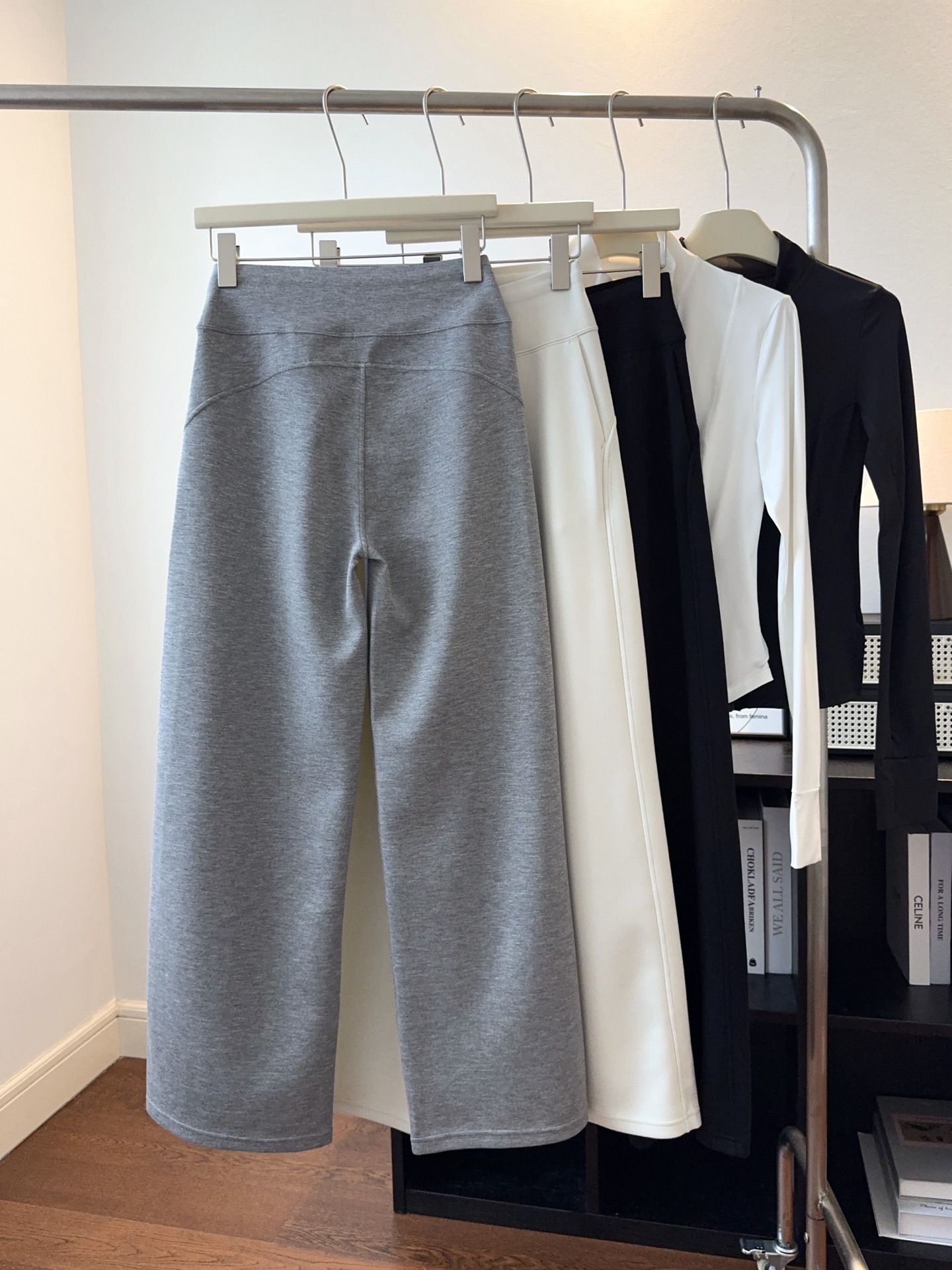 裤子采用空气层面料,追求一种恰到好处的宽松度和流畅的垂坠感,从大腿或膝盖处开始自然向下、向外微扩,形成优雅的直筒效果,线条流畅利落,是打造长腿和气场的利器。
