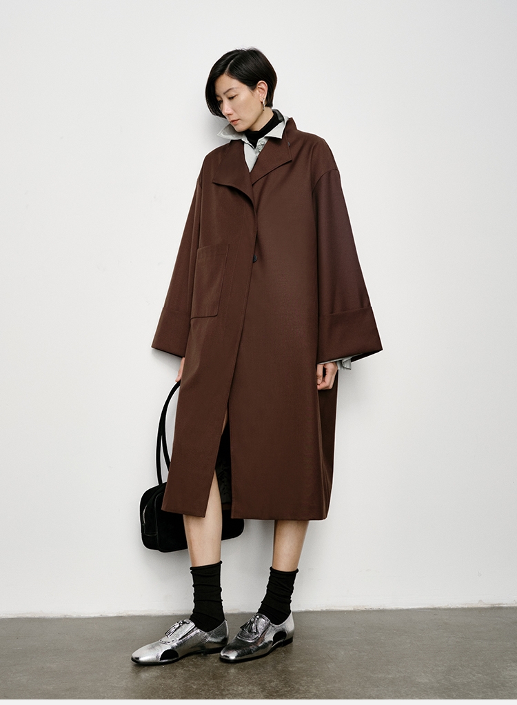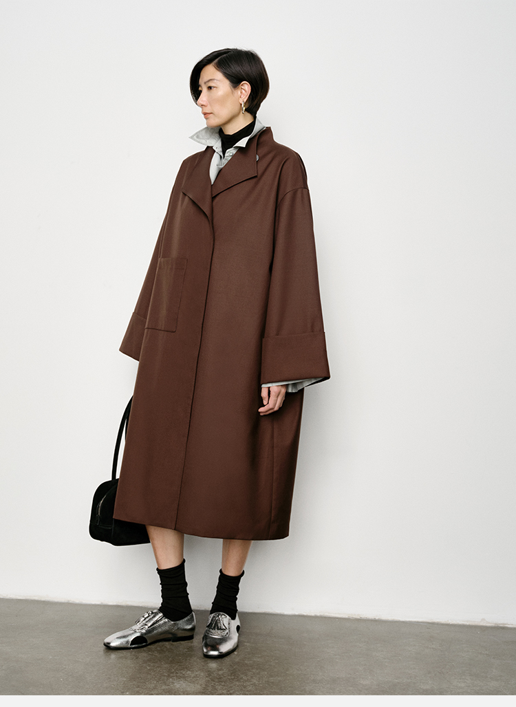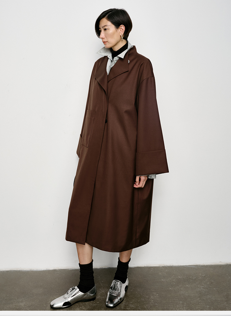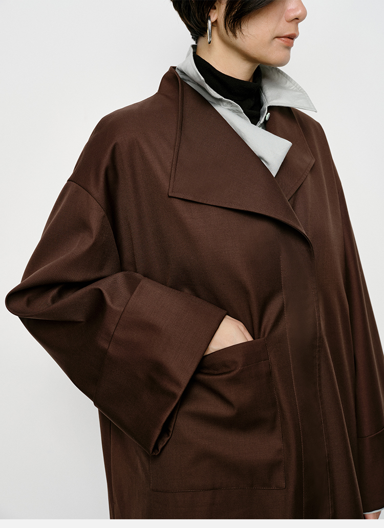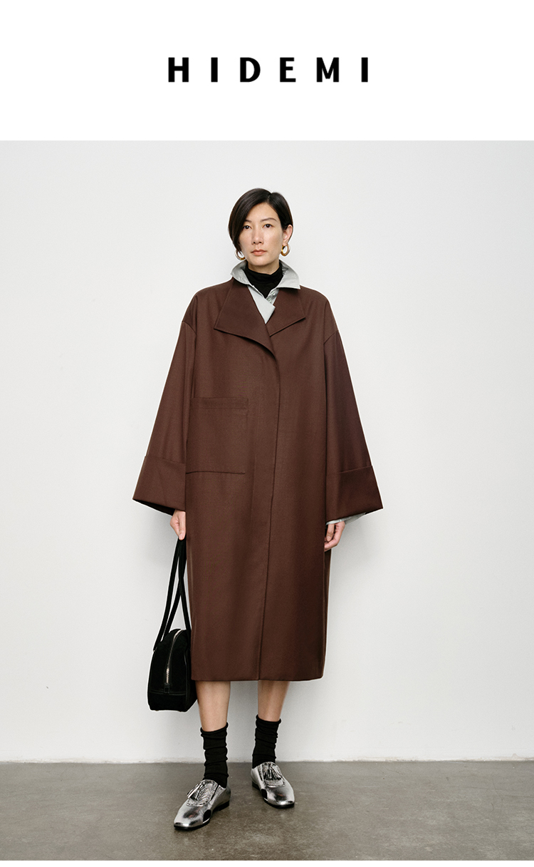 HIDEMI 不对称设计感翻领廓形口袋精纺羊毛中长款风衣