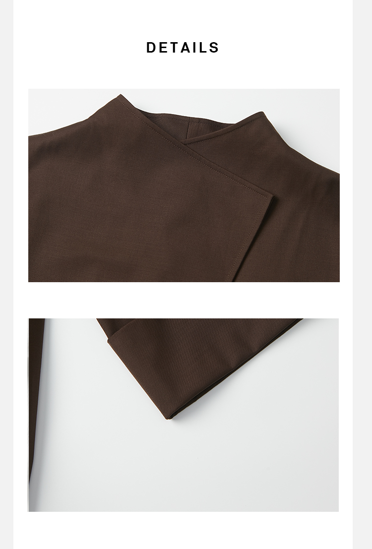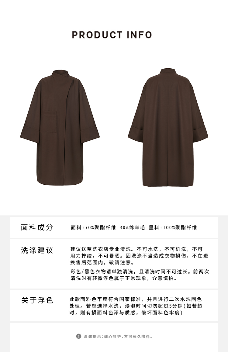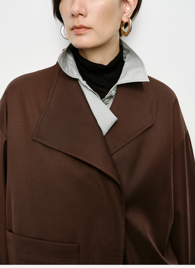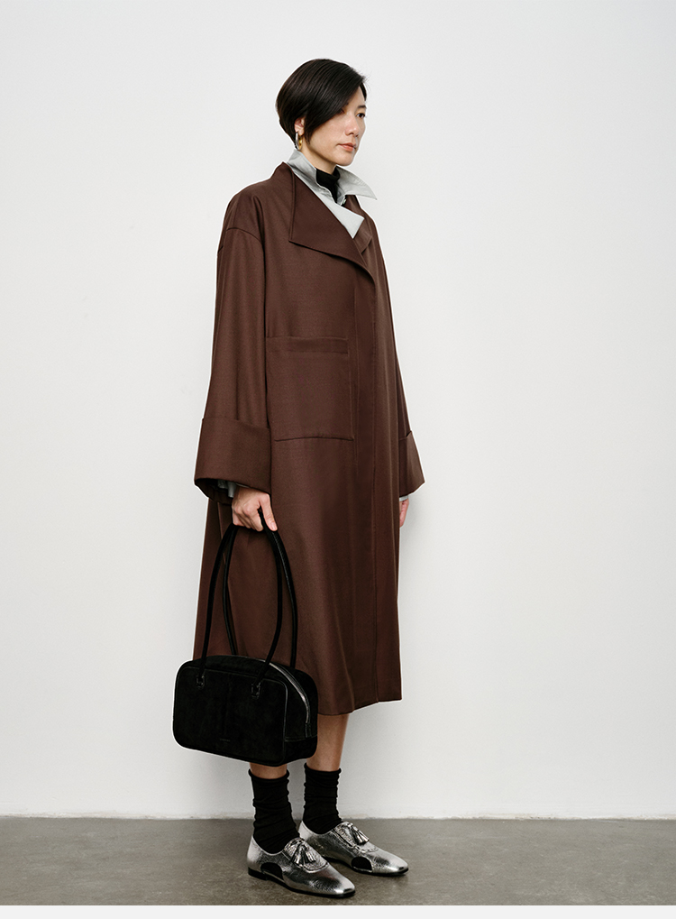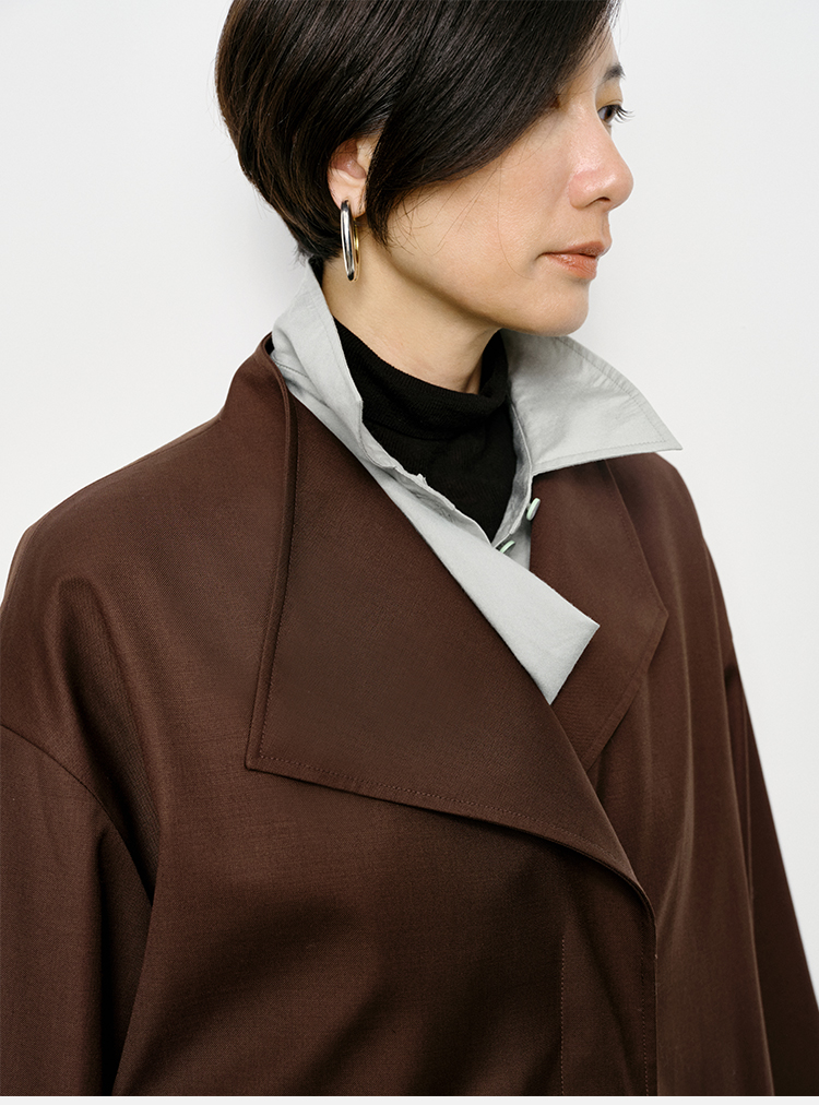 HIDEMI 不对称设计感翻领廓形口袋精纺羊毛中长款风衣