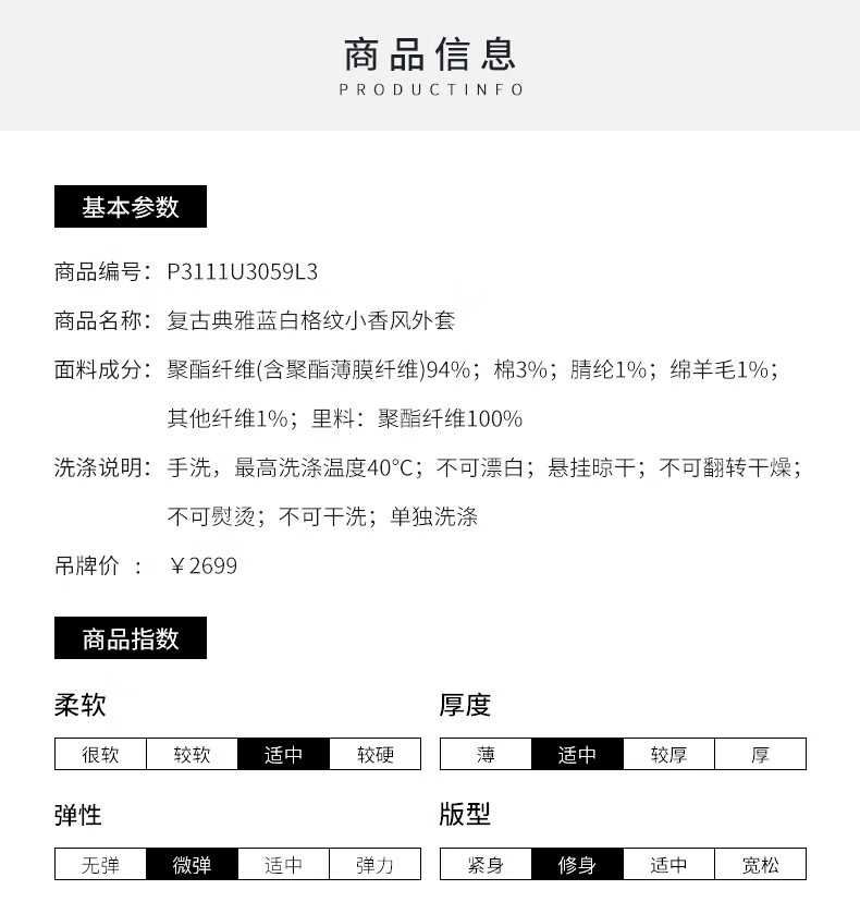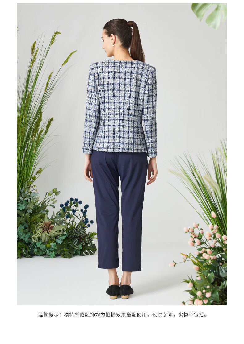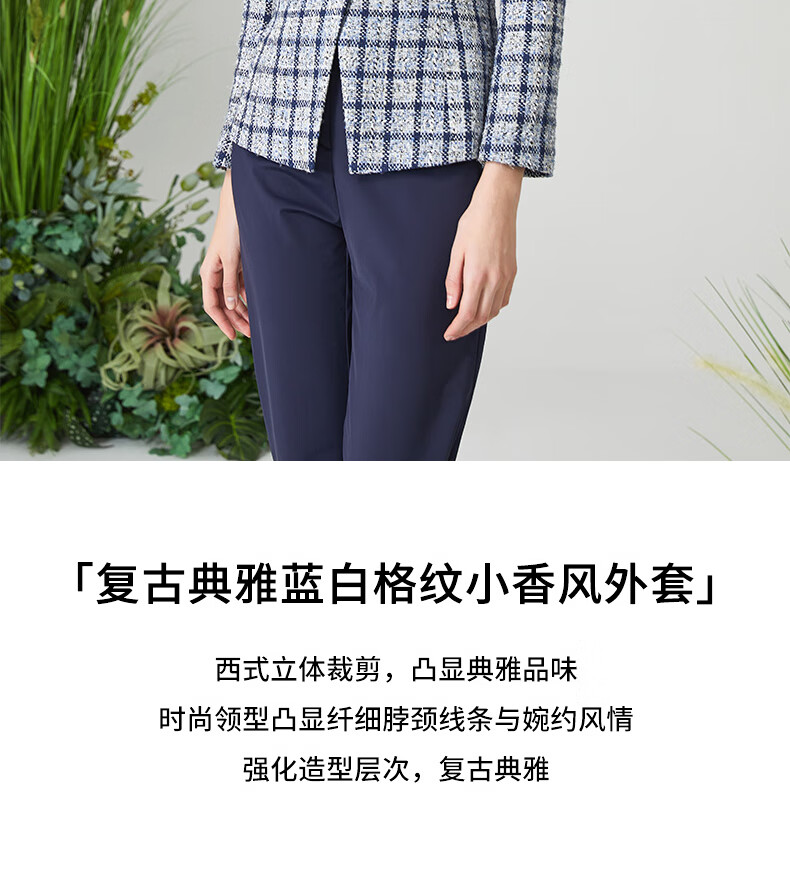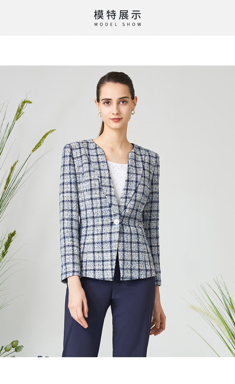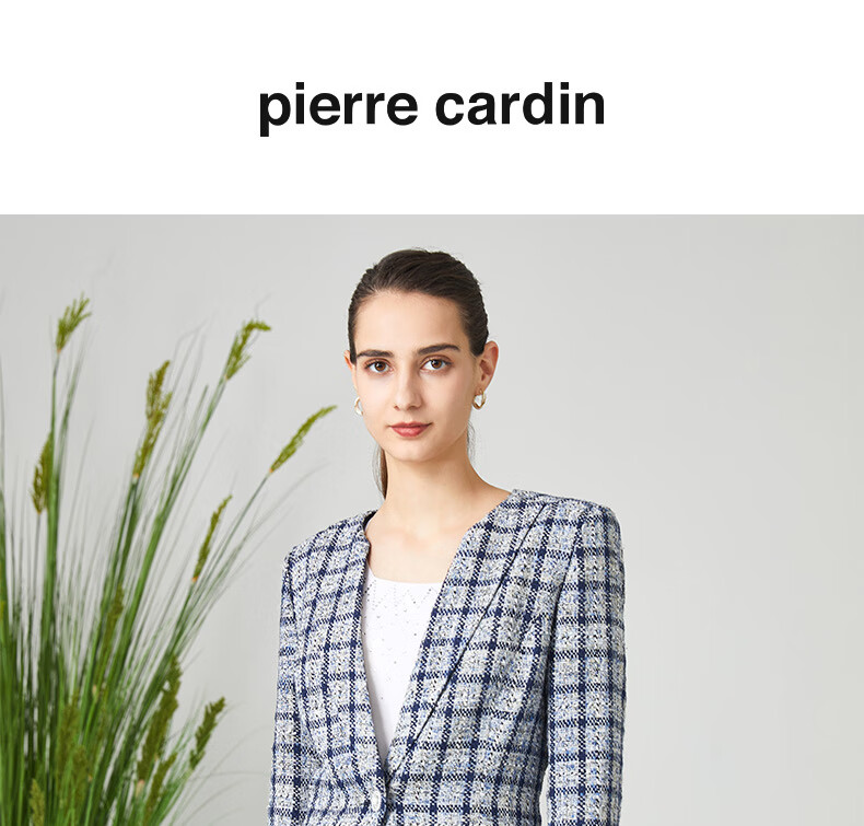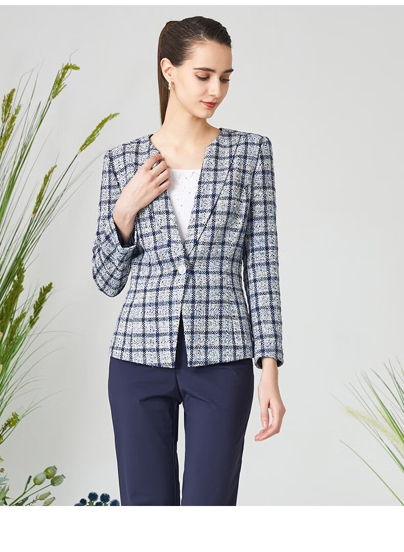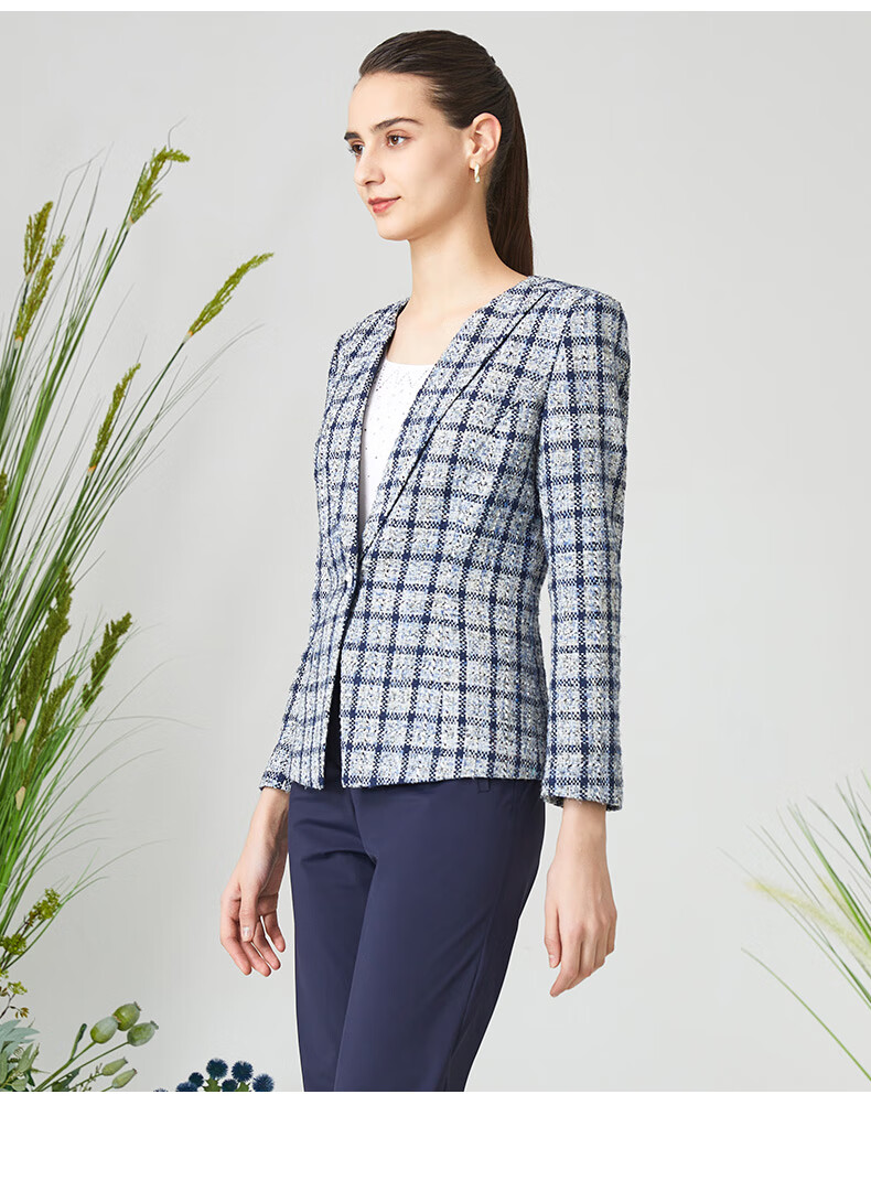 皮尔卡丹女装短外套蓝色格子一粒扣西服式春秋女上衣P3111U3059L3