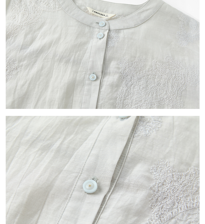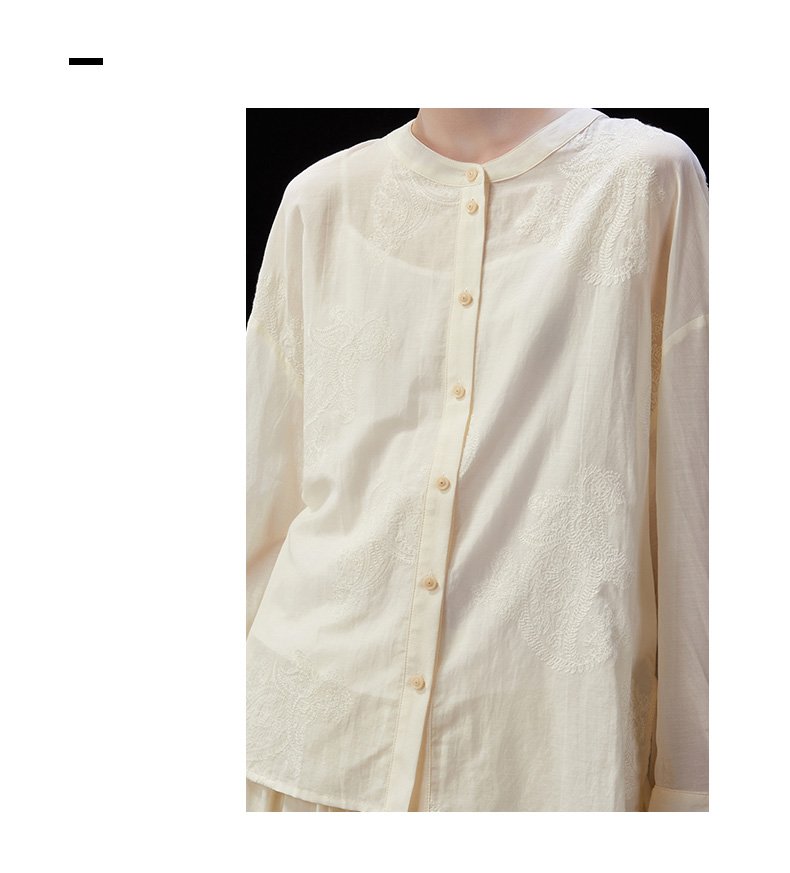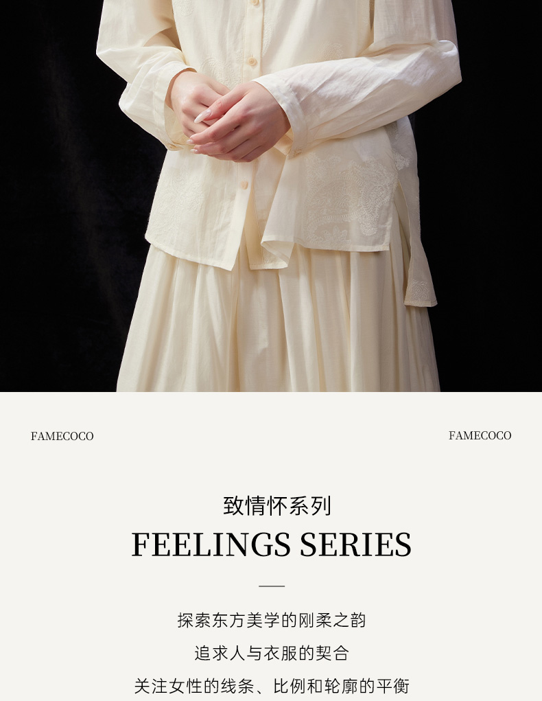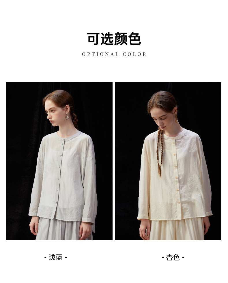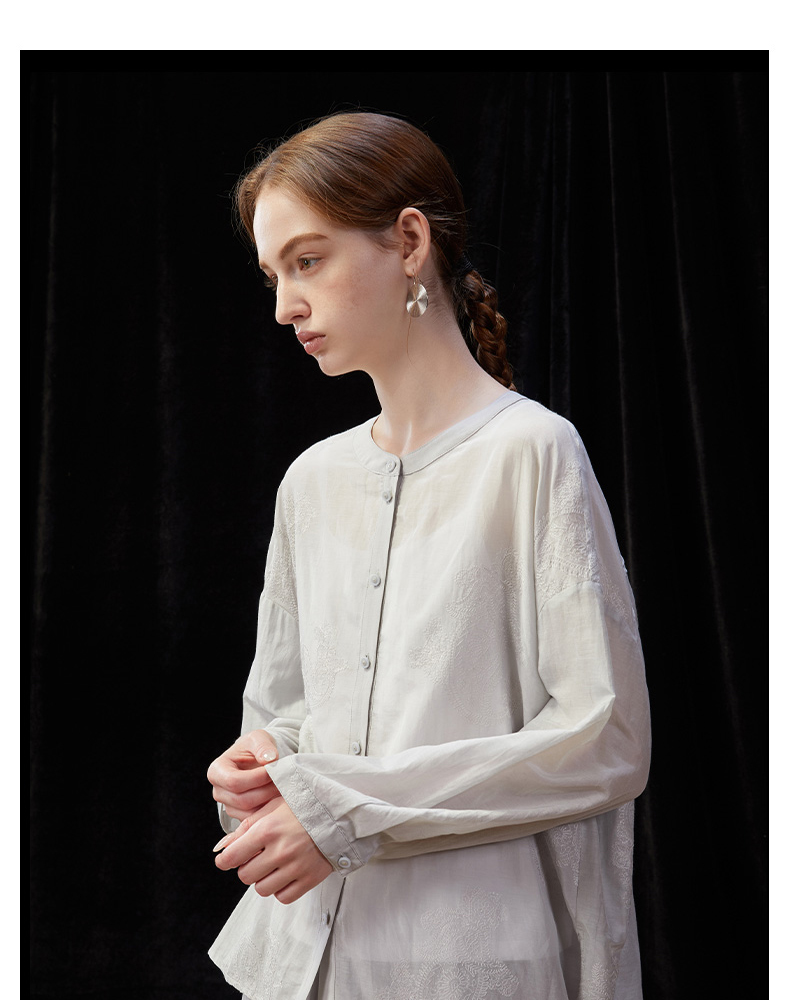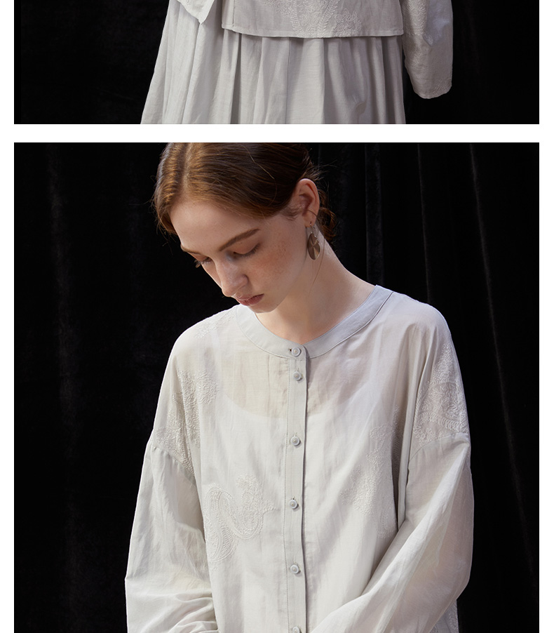 设计师品牌FAMECOCO刺绣简约宽松圆领长袖衬衣F25夏新AD3BH027