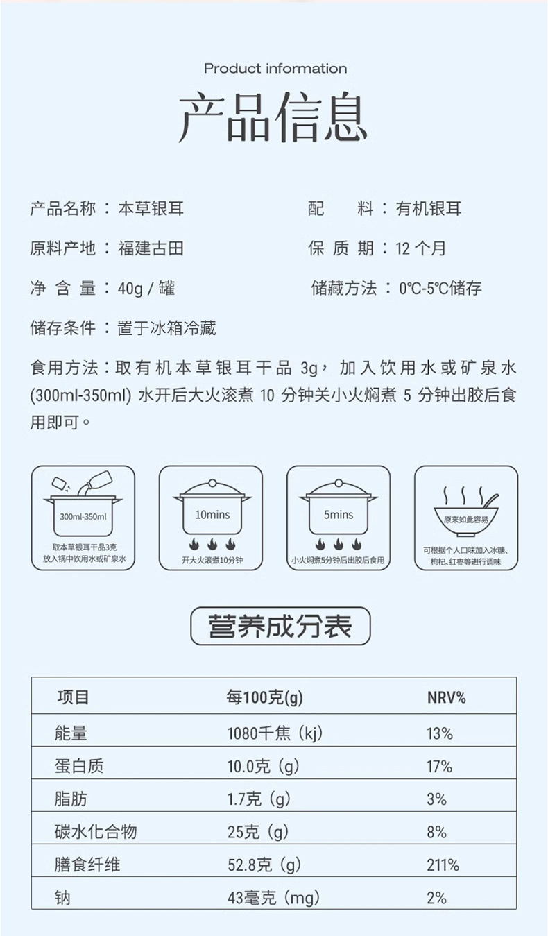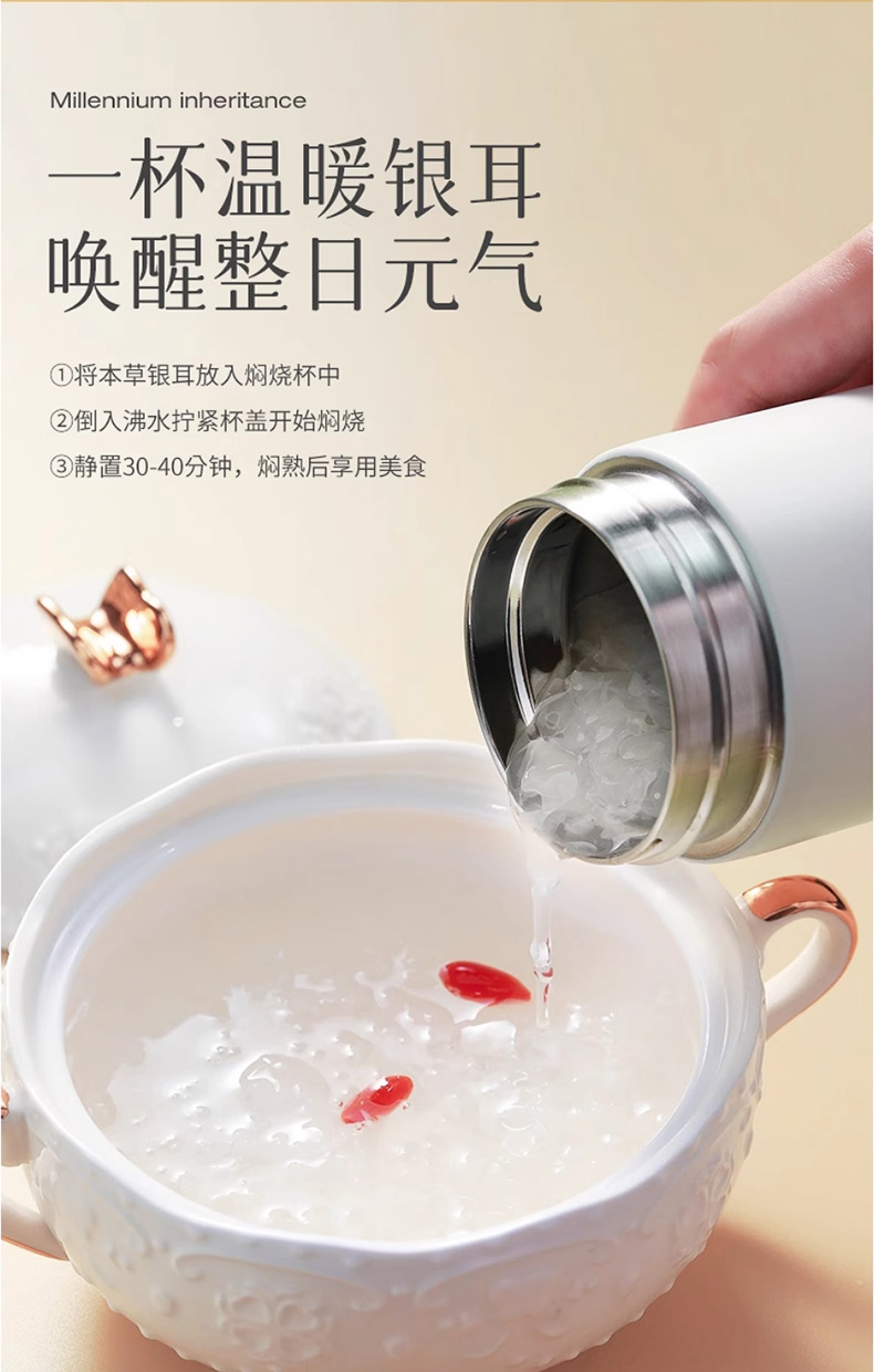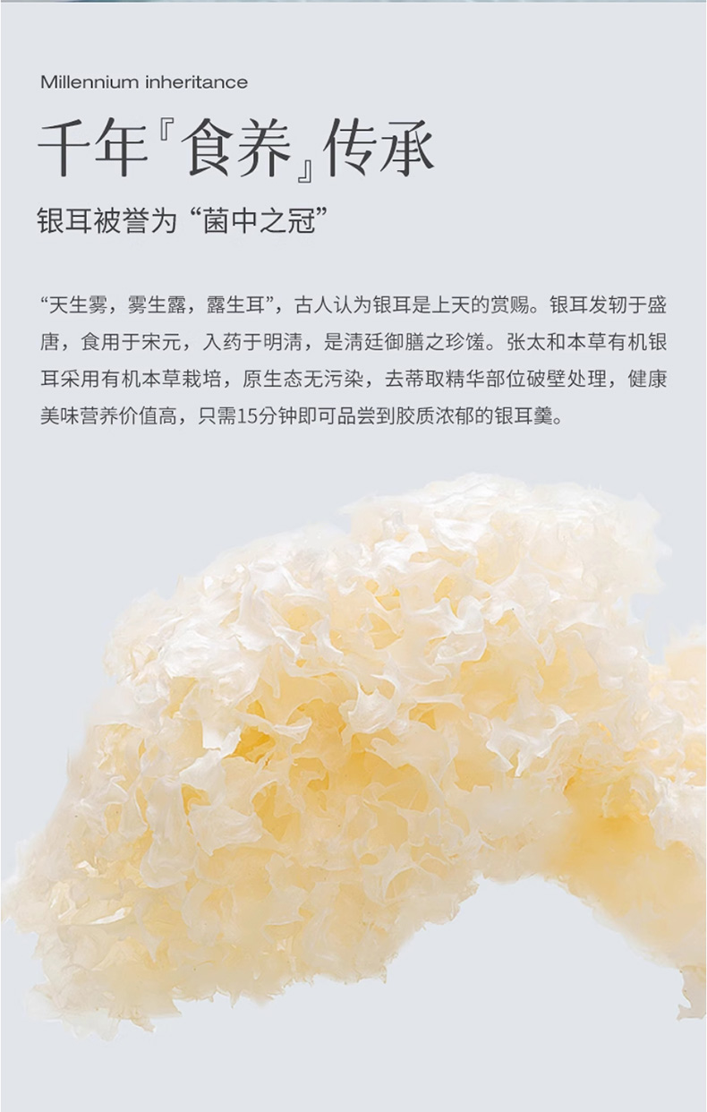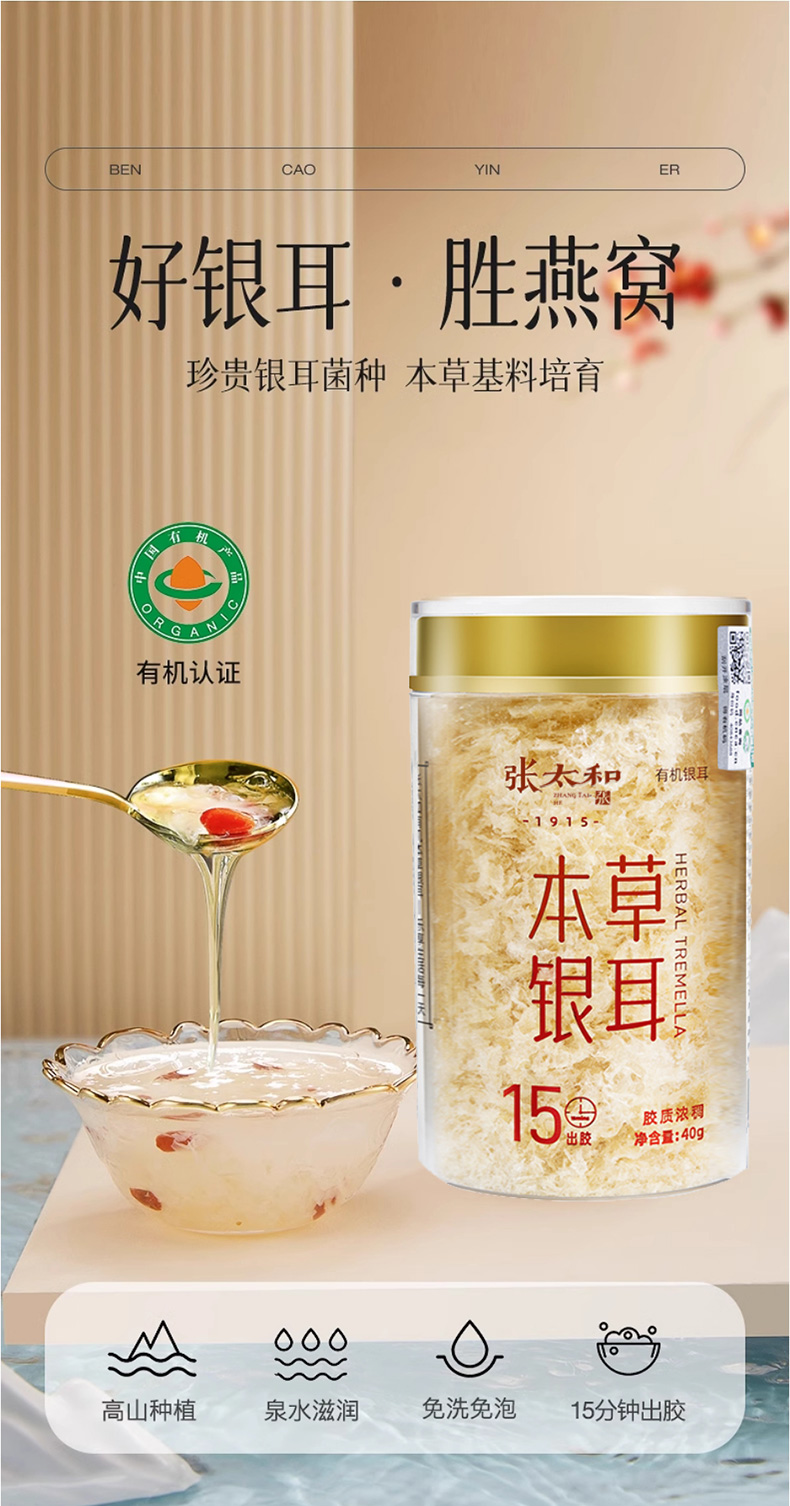 g张太和有机本草银耳40g/瓶*7瓶,双有机认证,软糯香滑,焖如鲜炖,免洗,免泡,免炖~遵循古法养生智慧,百搭养生吃法:搭配百合、红枣、鸡肉等都可以