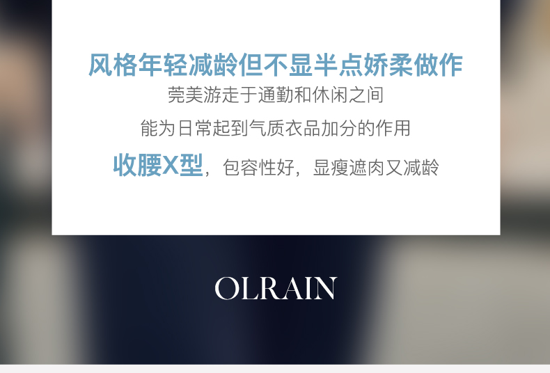 - “精致”是欧芮儿olrain品牌文化的核心,欧芮儿认为,精致的女人,不但要外在动人,更要内在迷人,内外兼修,有魅力、有气质、有内涵,自信而不自傲,优雅而不矫揉,自有万种风情而不轻浮,更不故作矜持。