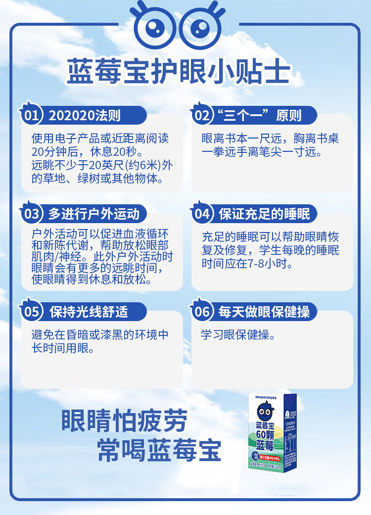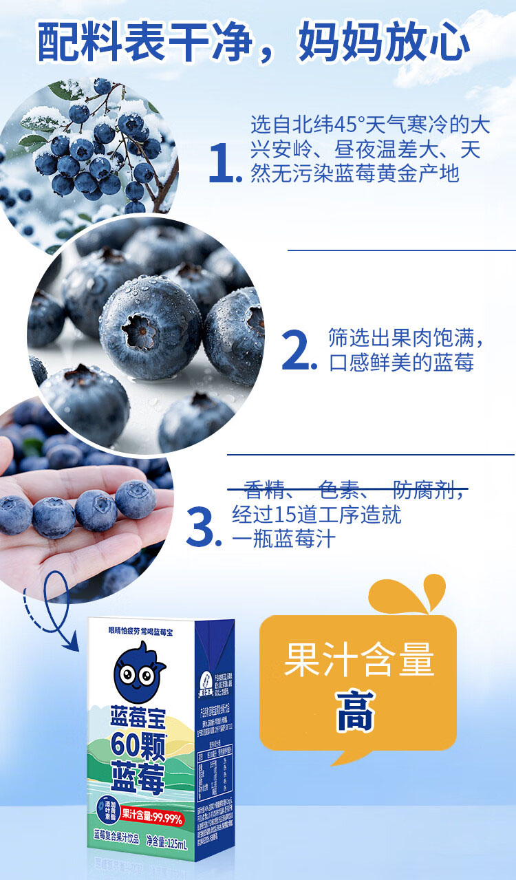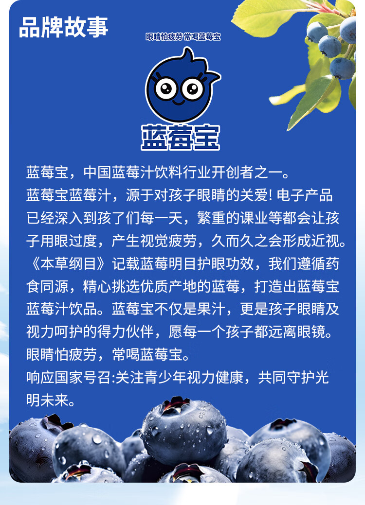 蓝莓复合果汁饮品,36瓶装,鲜果采摘低温榨汁,富含花青素和叶黄素酯,口感酸甜适中,醇厚柔和,健康饮品,配料干净,“眼睛怕疲劳,常喝蓝莓宝”D