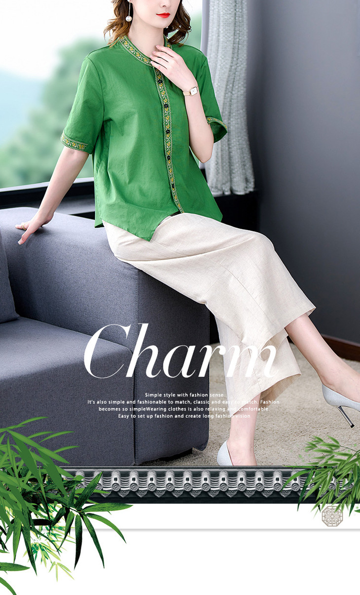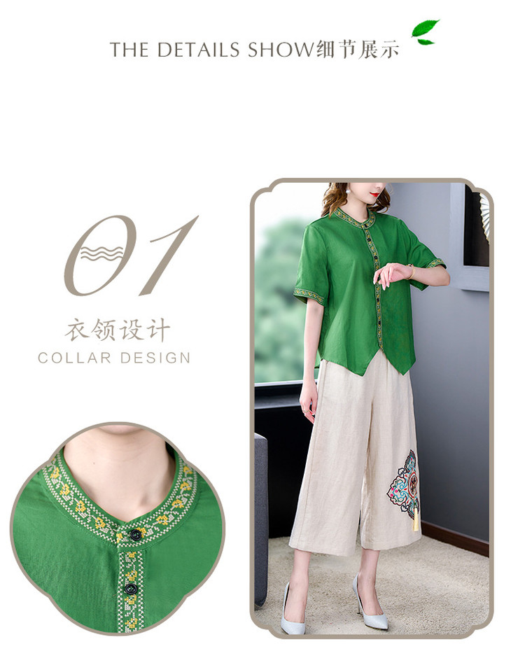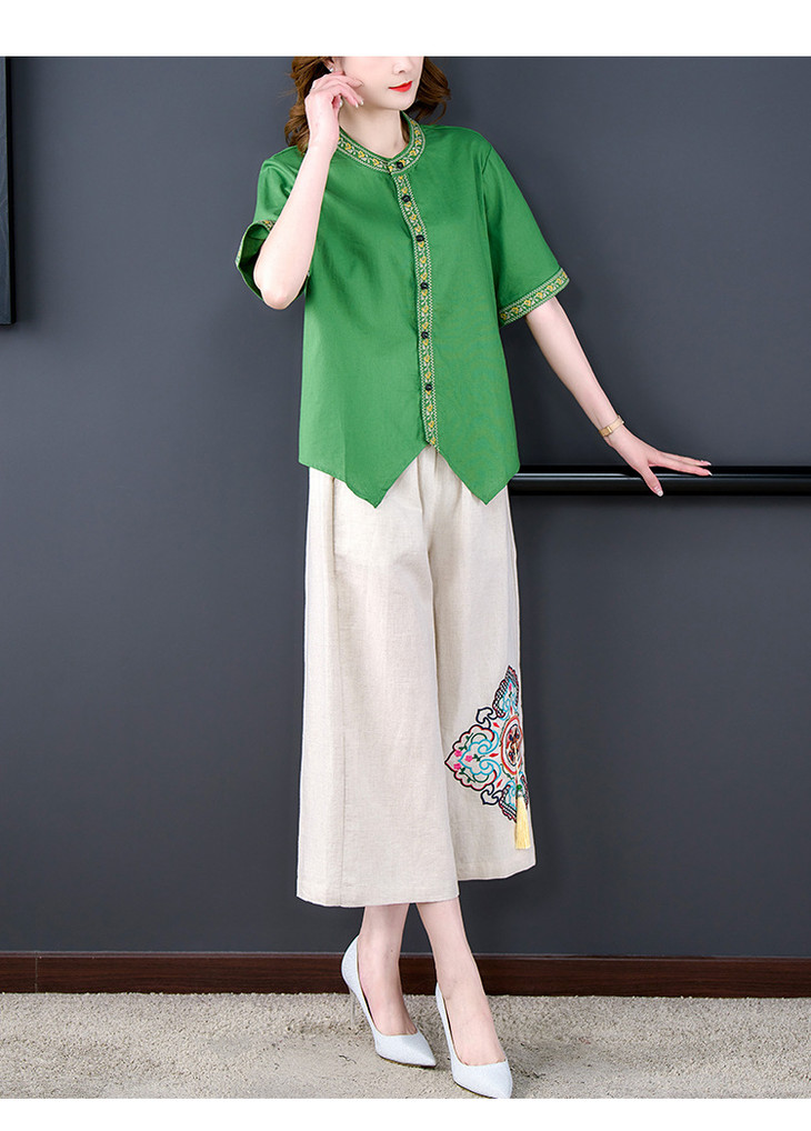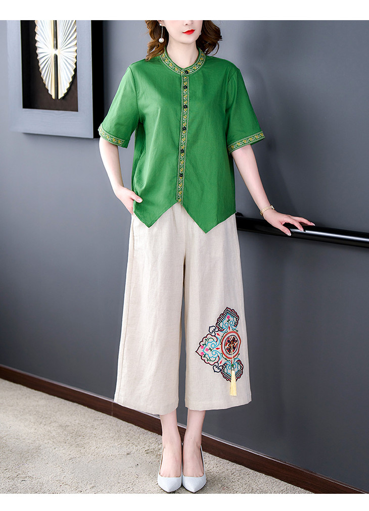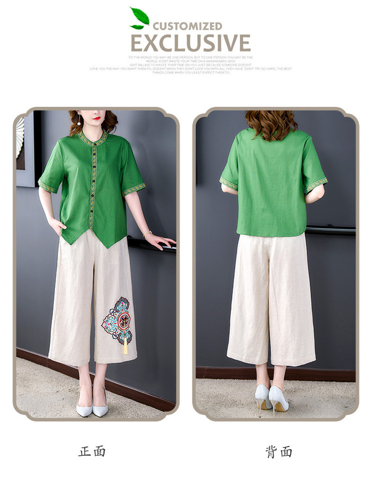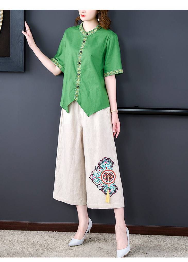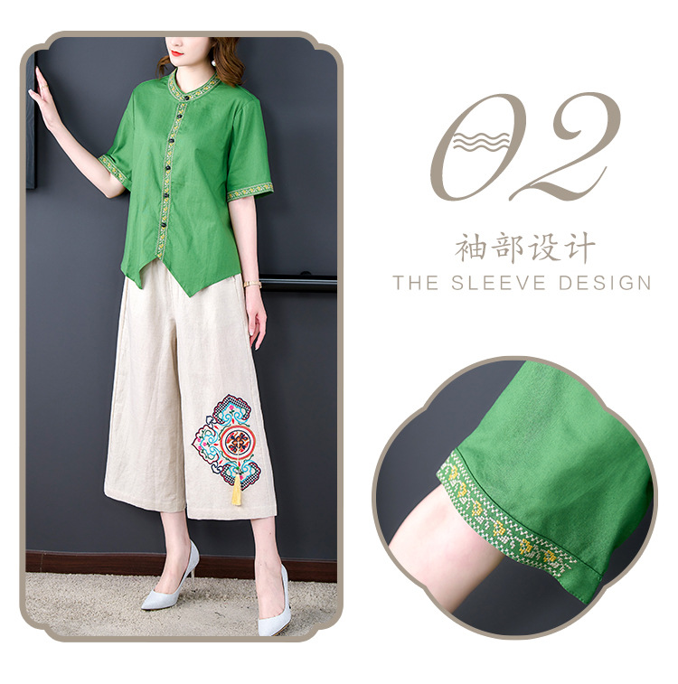 民族风复古显瘦刺绣衬衫阔腿裤棉麻套装AHM-yslg8671