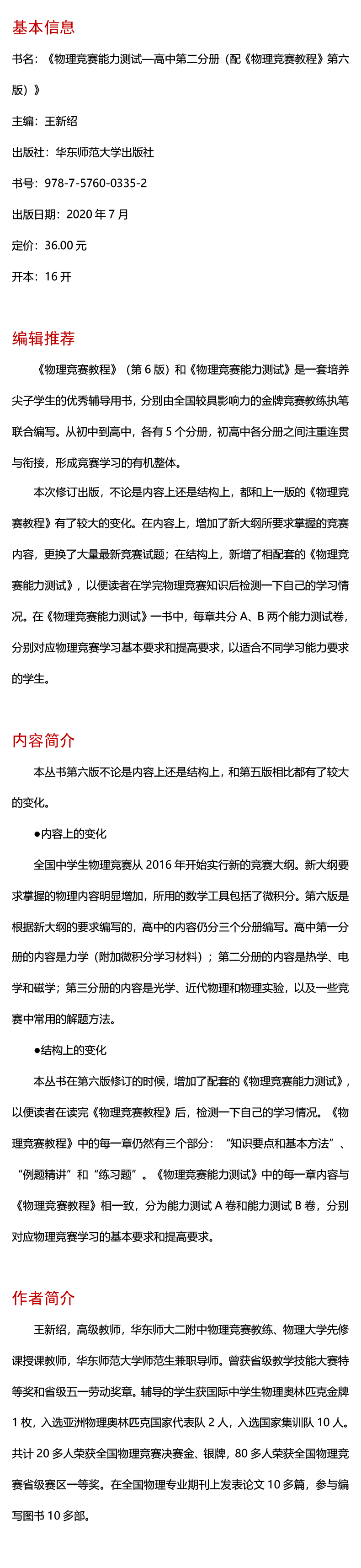 《物理竞赛教程》(第6版)和《物理竞赛能力测试》是一套培养尖子学生的优秀辅导用书,分别由全国较具影响力的金牌竞赛教练执笔联合编写。从初中到高中,各有5个分册,初高中各分册之间注重连贯与衔接,形成竞赛学习的有机整体。本次修订出版,不论是内容上还是结构上,都和上一版的《物理竞赛教程》有了较大的变化。在内容上,增加了新大纲所要求掌握的竞赛内容,更换了大量近期新竞赛试题;在结构上,新增了相配套的《物理竞赛能力测试》,以便读者在学完物理竞赛知识后检测一下自己的学习情况。在《物理竞赛能力测试》一书中,每章共分A、B两个能力测试卷,分别对应物理竞赛学习基本要求和提高要求,以适合不同学习能力要求的学生。