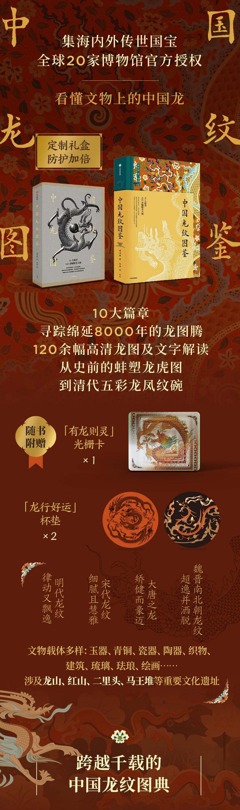玉器、青铜、陶瓷、织物、建筑、琉璃、珐琅…… 精选海内外馆藏珍宝,重描千年前雕刻的线条 10个篇章,100余幅精美大图 始于新石器时代,迄于元明清朝 线条勾出东方瑞兽的韵致,符号重解东方美学的秘钥 将绵延8000年的图腾印入世代流转的民族记忆 在神话中,龙是能“兴风雨,利万物”的东方瑞兽。 曹植在《洛神赋》里写下“翩若惊鸿,婉若游龙”,描摹出龙所承载的东方幻想。 千古神州,龙乃神兽之首。它是祖先对自然界认知有限时,用想象力创造的精神图腾,承载着先民对自然的敬畏、对祥瑞的期盼。蛟龙腾腾,从寥寥数笔到繁复庄重,或蜿蜒盘桓、气魄激昂,或刚柔并存、优雅飘逸,终幻化为民族的符号。 穿越文字,凝望千年前的狩猎间隙,人们就完成了对龙的勾画。C形玉龙龙身弯曲,古朴简约,也象征文明的伊始。随着时间的推移,它被刻在青铜之上,描摹于画卷之中,雕琢在天花与砖瓦之间,形态万千,在不同的时期和地域,演变出万千姿态,寓......