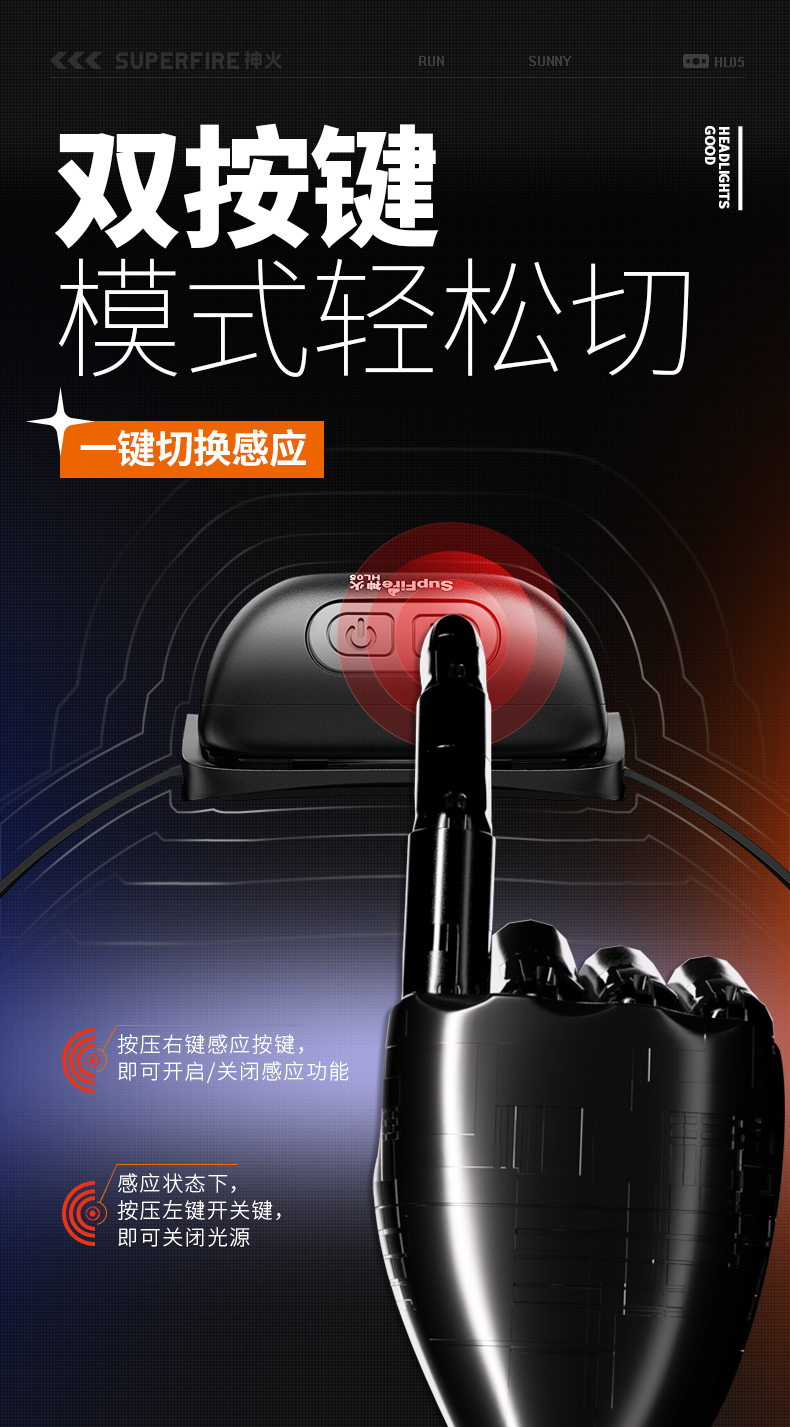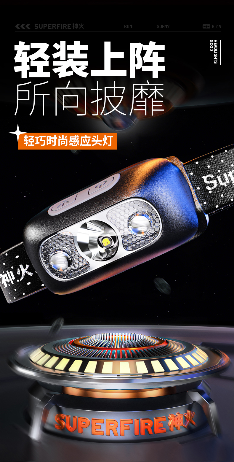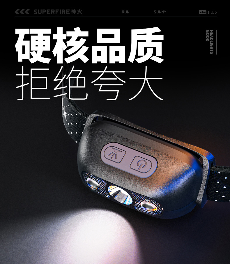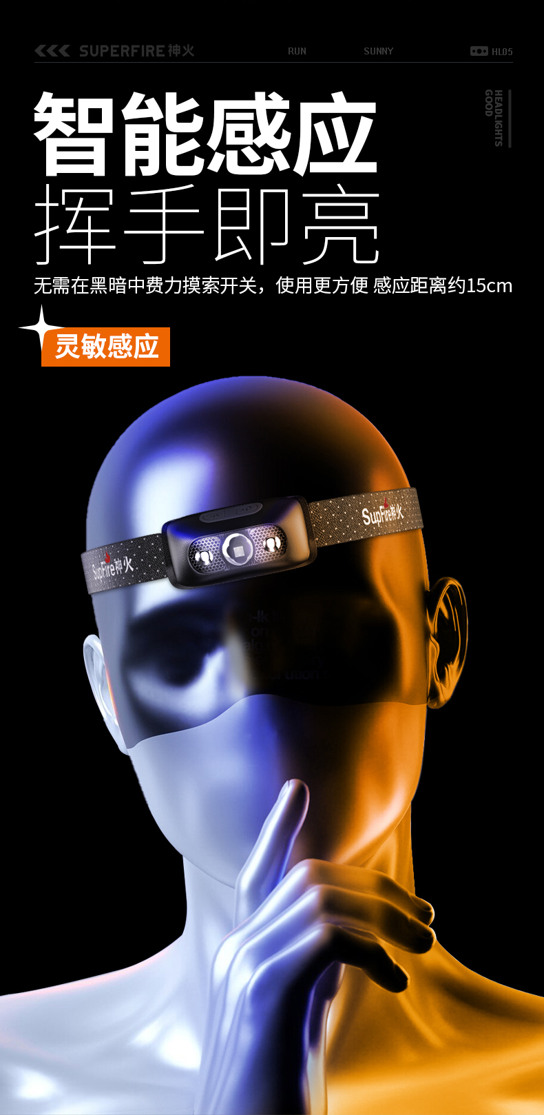 SUPERFIRE神火HL05头灯强光感应充电超轻小号超亮超长续航户外头戴式夜钓钓鱼灯