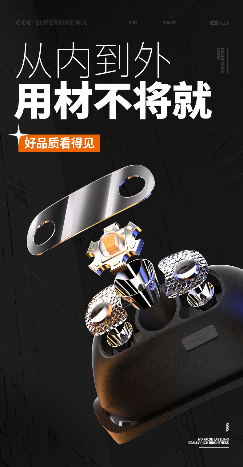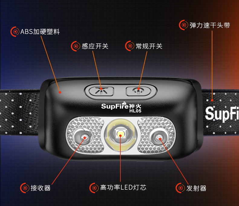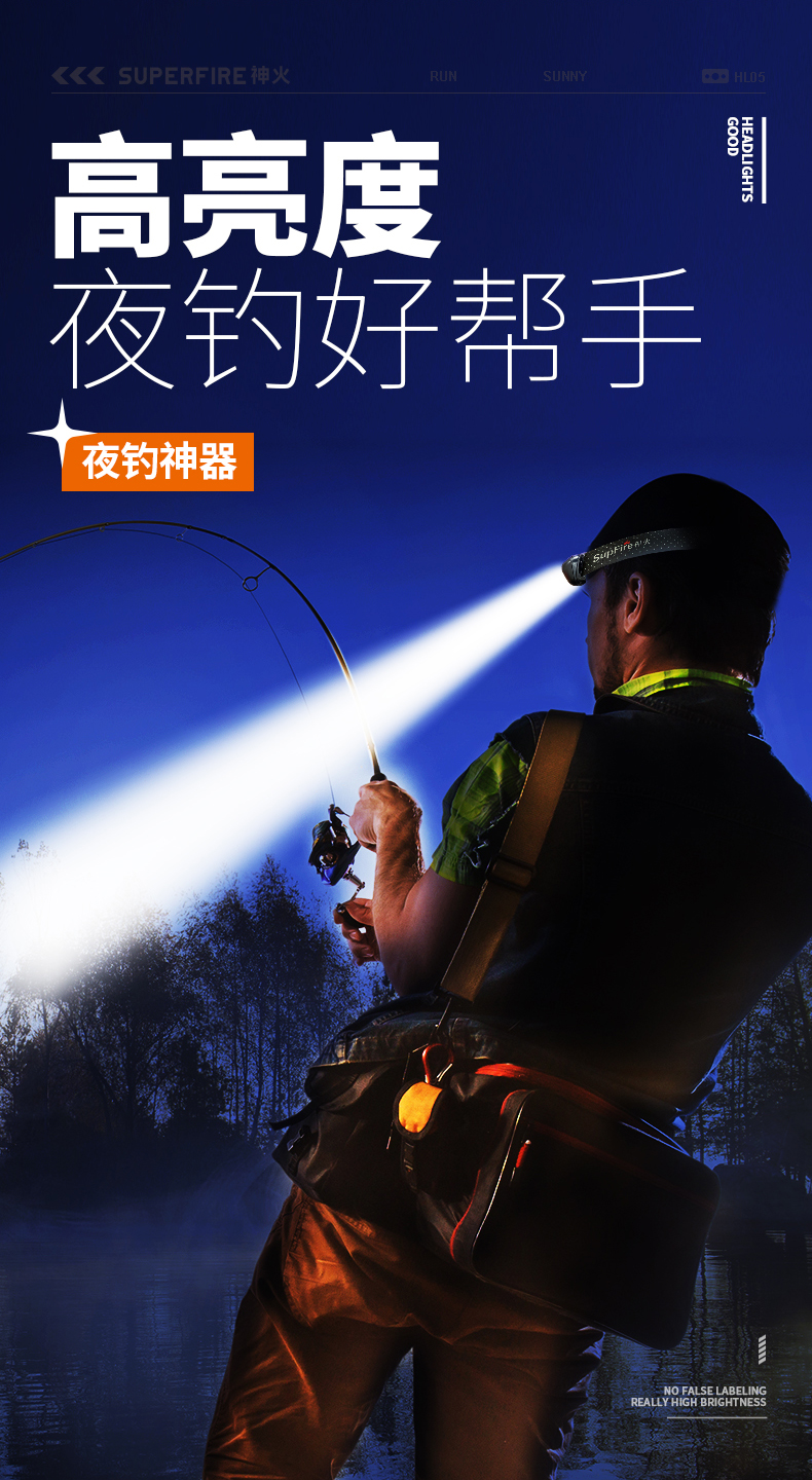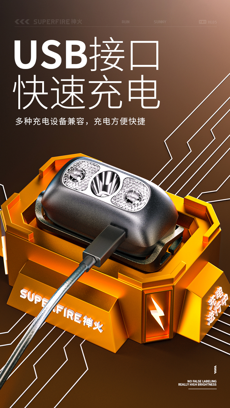 SUPERFIRE神火HL05头灯强光感应充电超轻小号超亮超长续航户外头戴式夜钓钓鱼灯