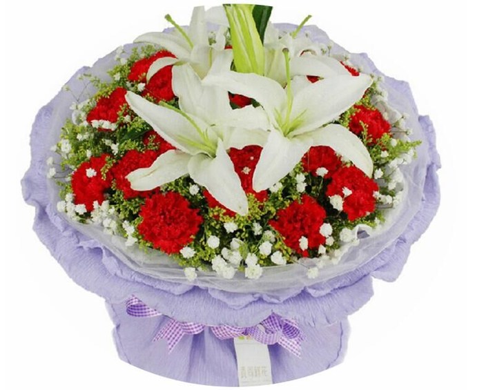 感恩---19支红色康乃馨,2枝多头白色香水百合,点缀黄莺,满天星 内衬白色软纱,外用紫色卷边纸多层圆形包装,系精美蝴蝶结(1307)