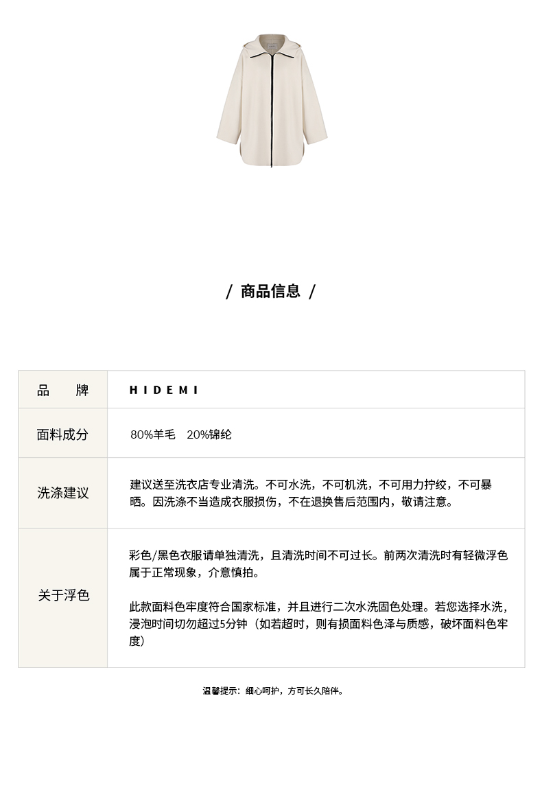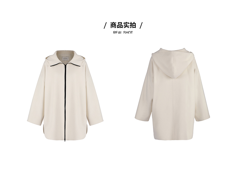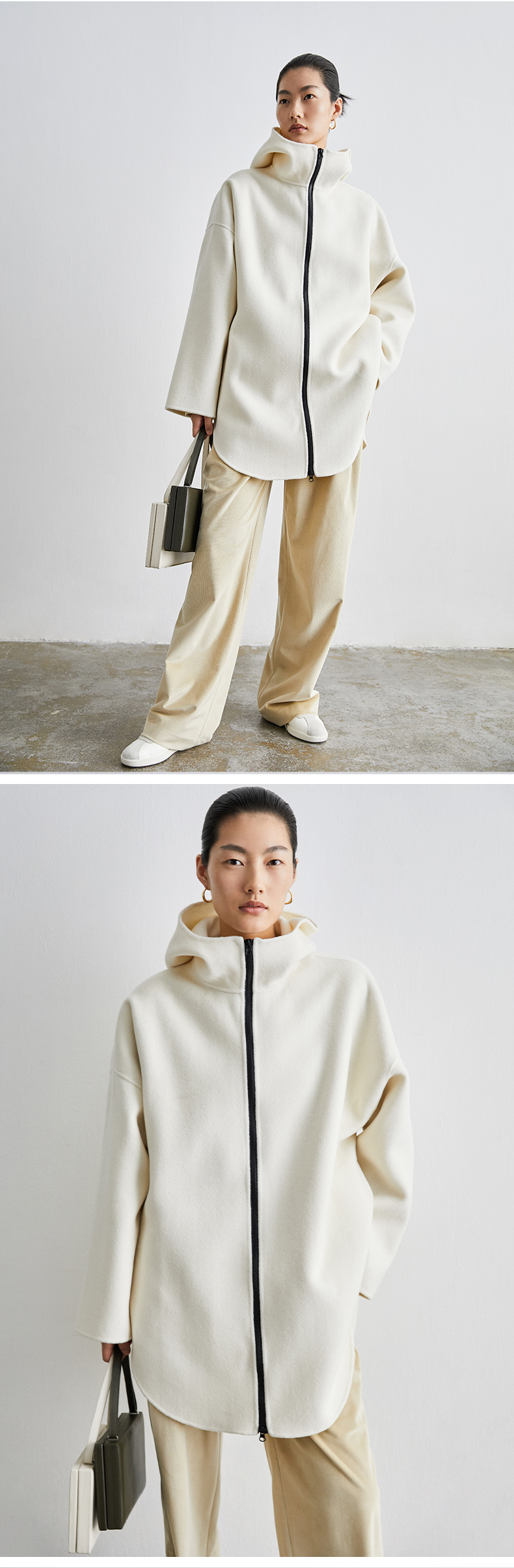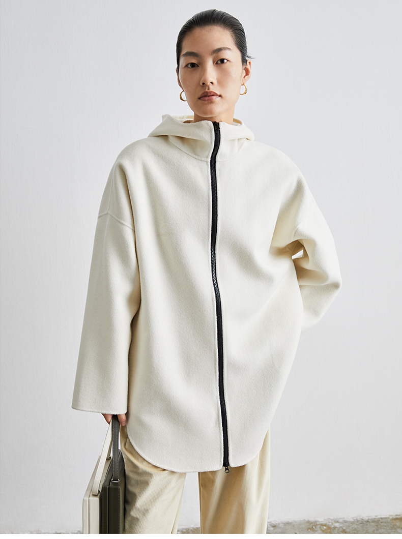 HIDEMI 奶油乳白连帽拉链式简约廓形中长款双面呢大衣