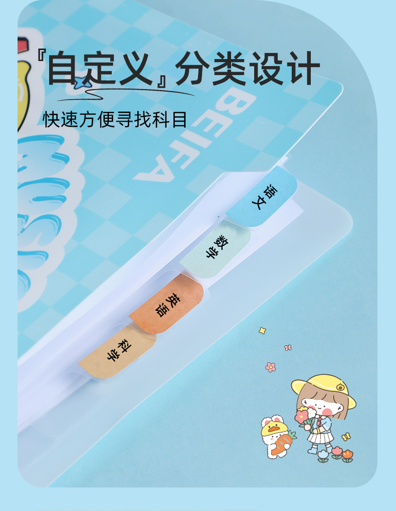按扣设计,全包边带,加厚提手 可用于试卷分类、文件夹、使用便捷;有效改善试卷散乱、资料错乱 影响孩子学习效率和心情