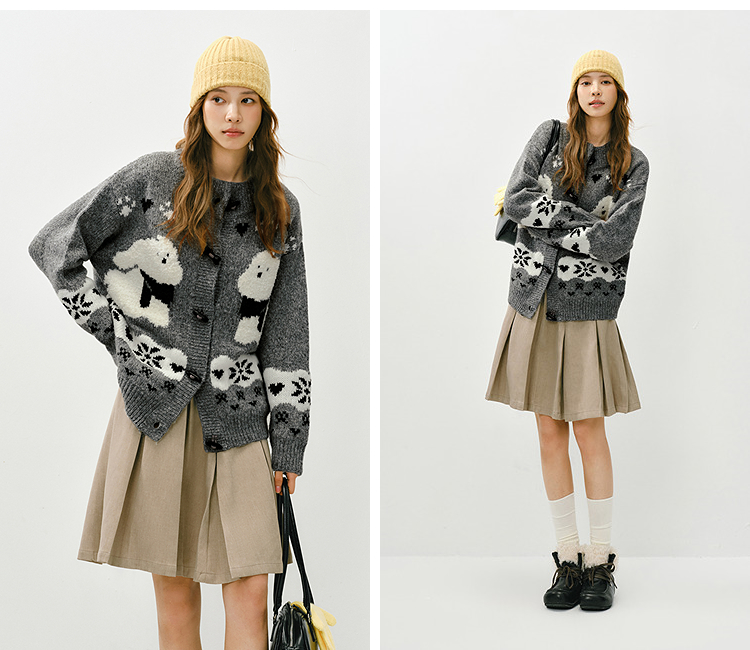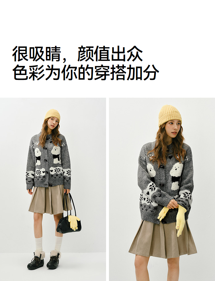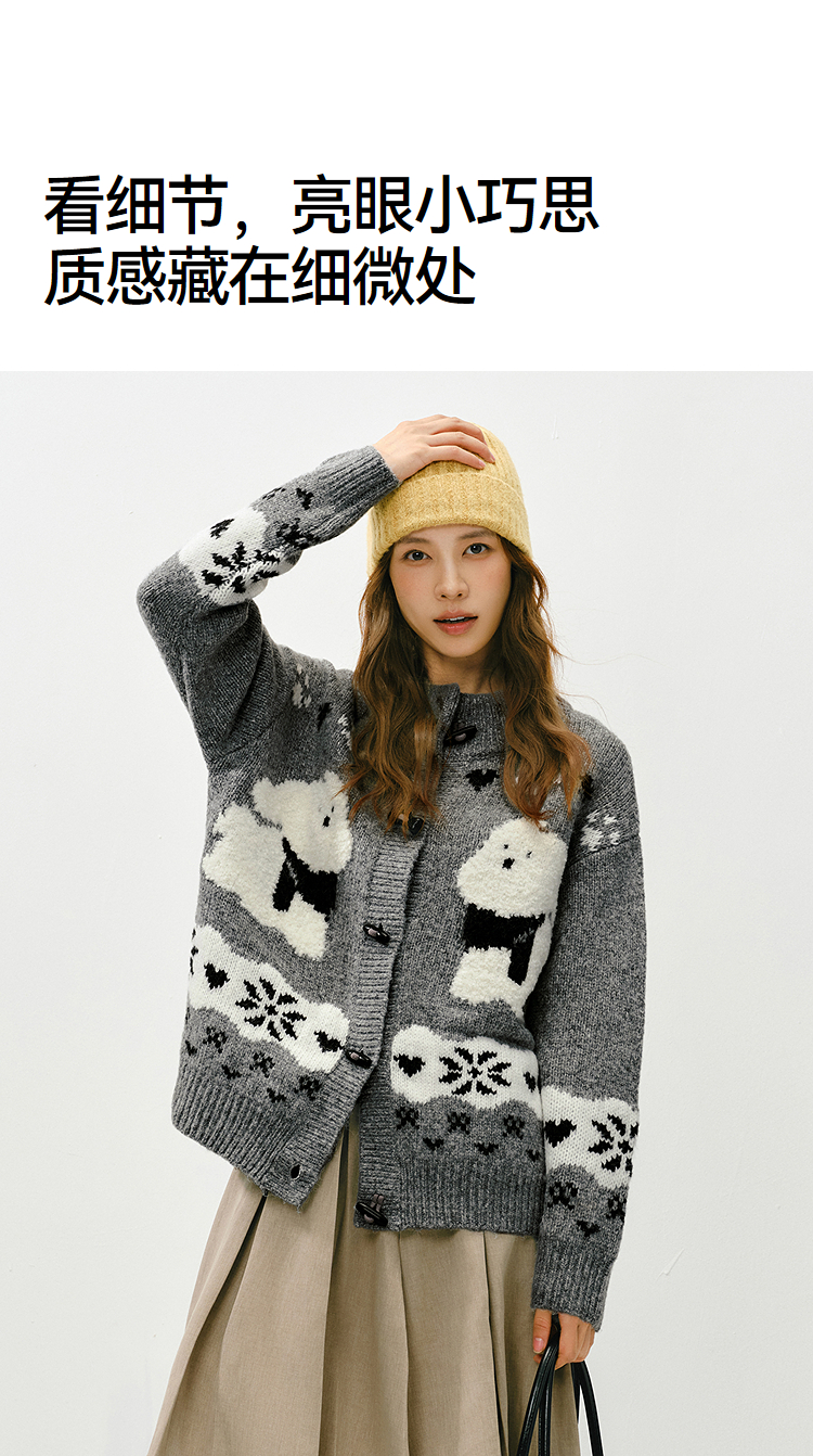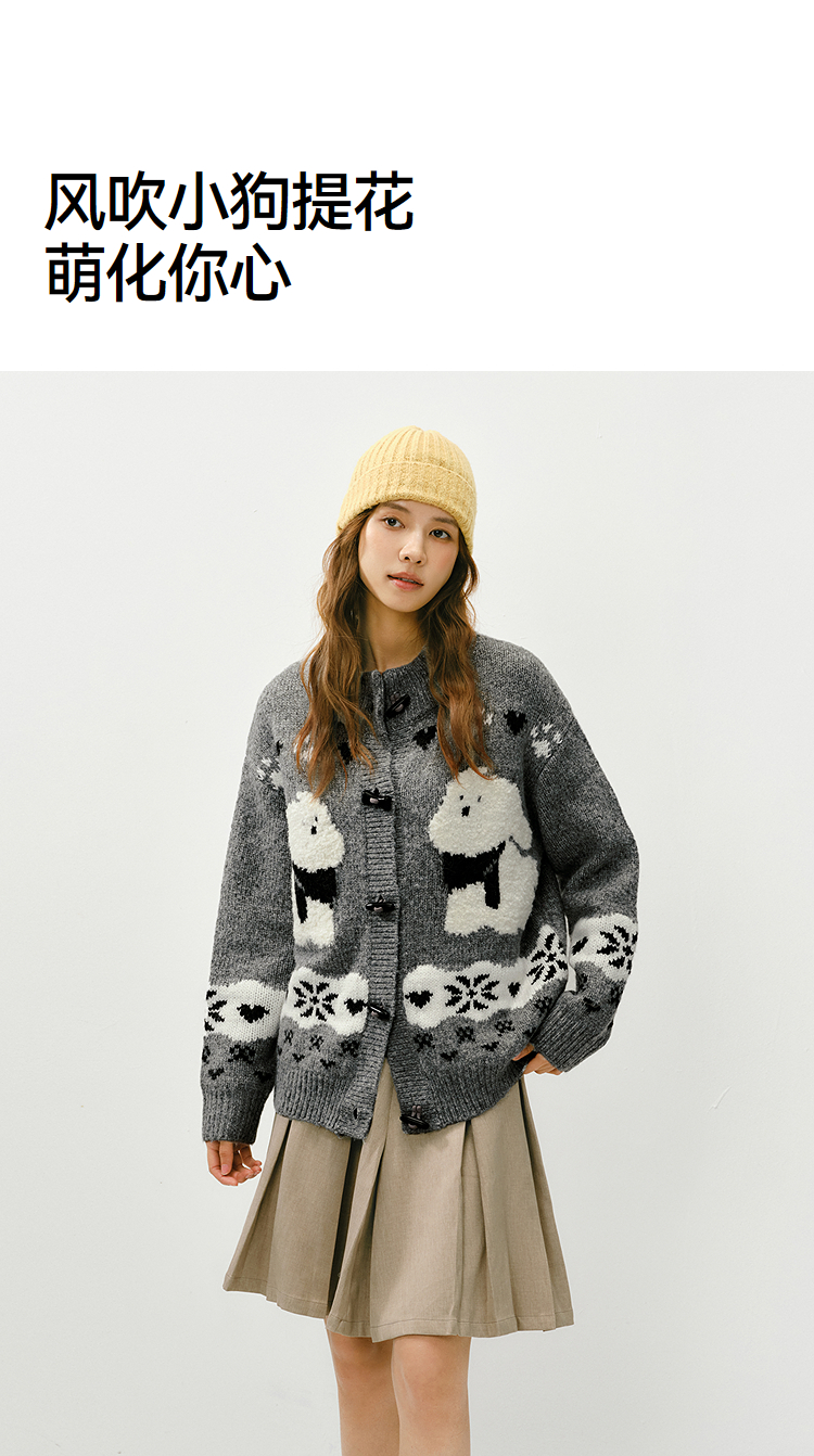 森马针织开衫女冬半高领小狗提花牛角扣毛衫宽松2025新款可爱上衣
