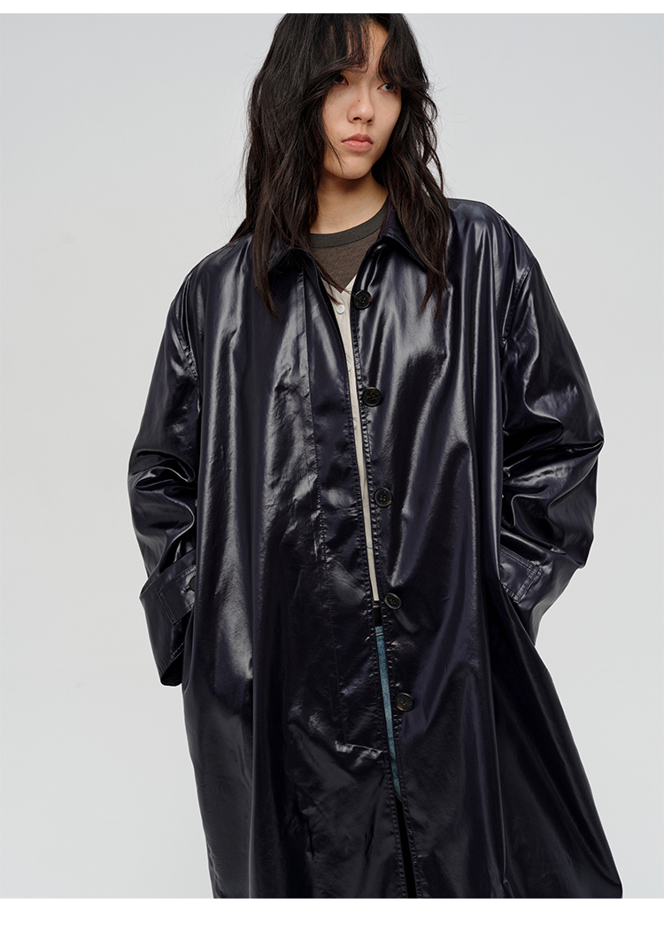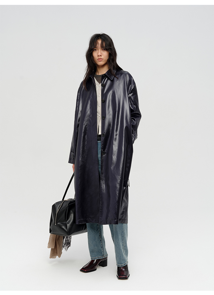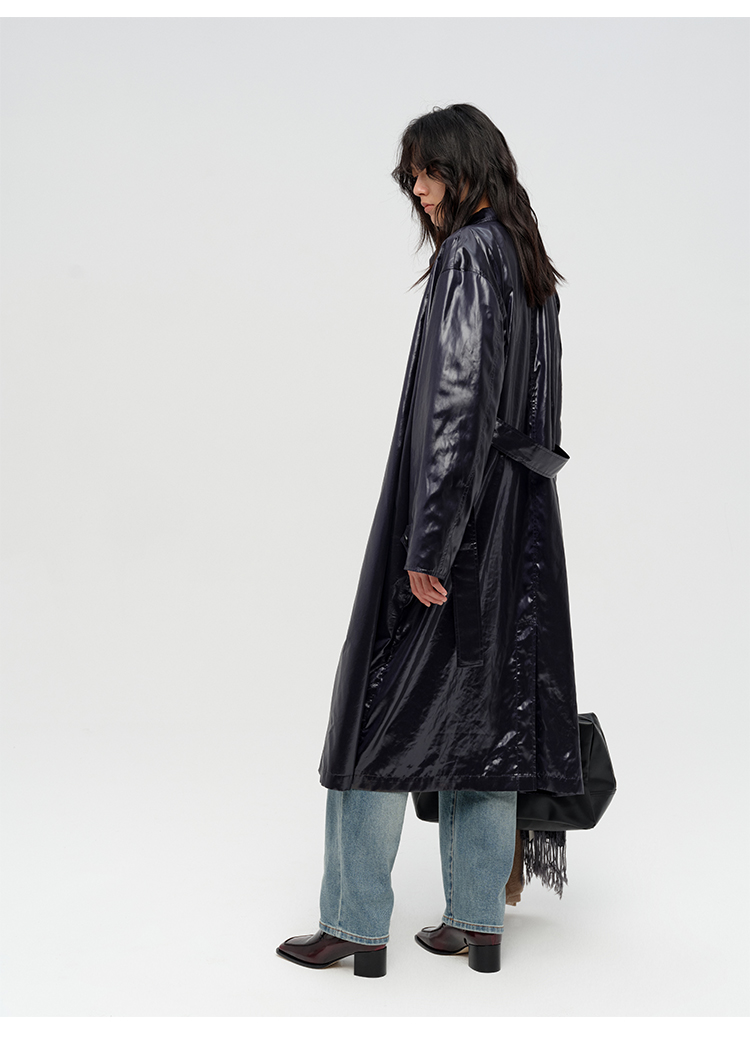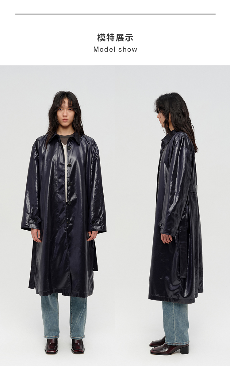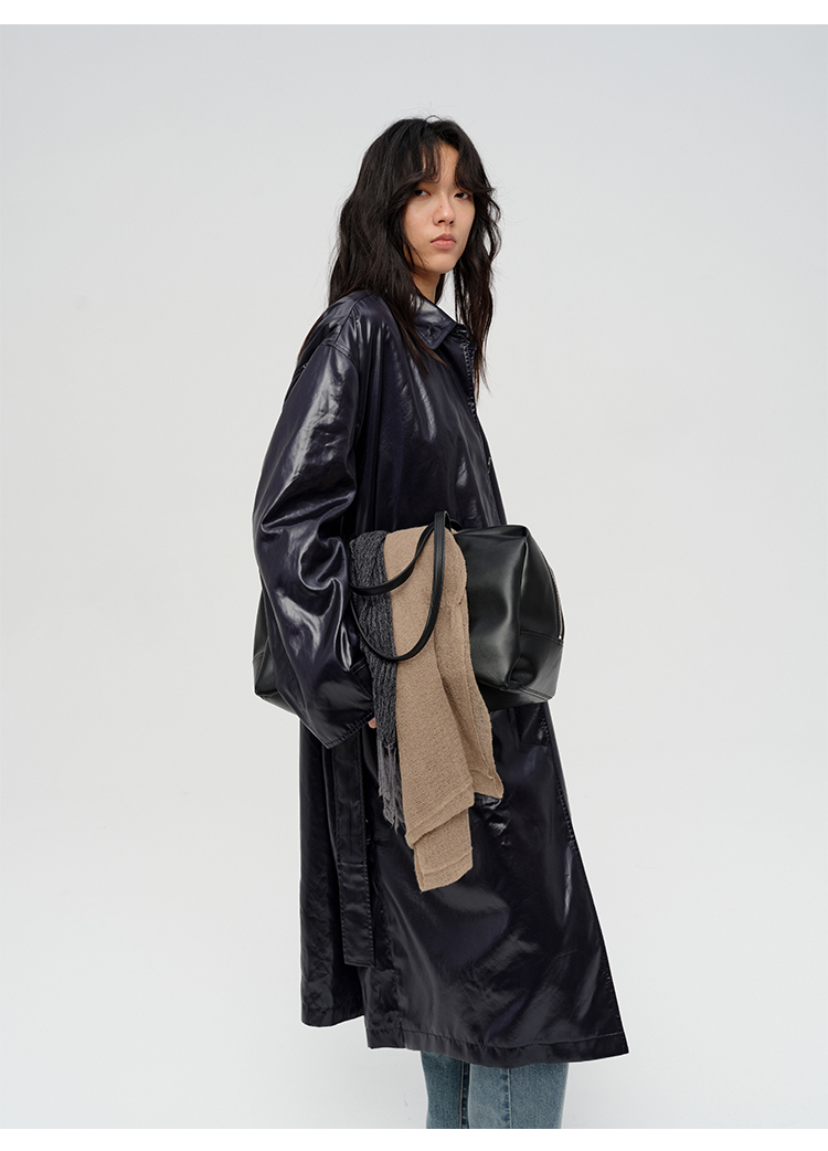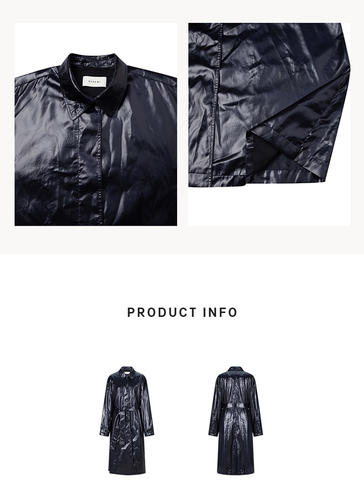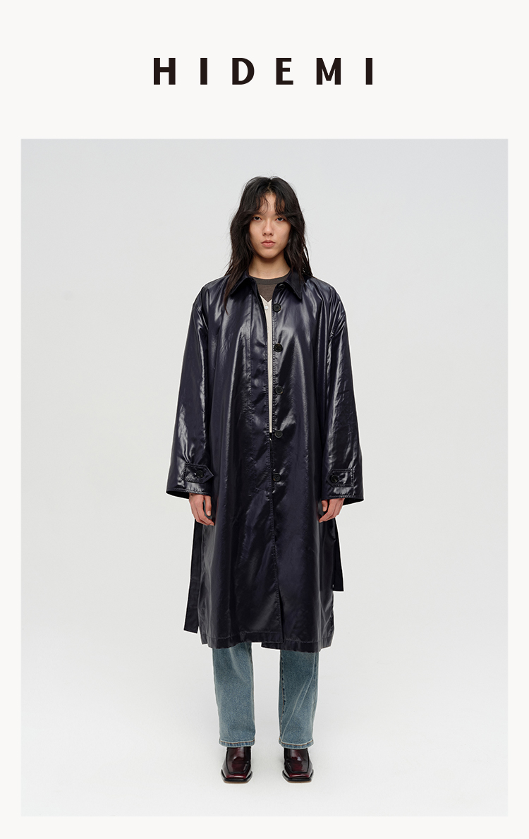 HIDEMI 日本进口亮面纸感纤维极简廓形设计感复古翻领式长款风衣