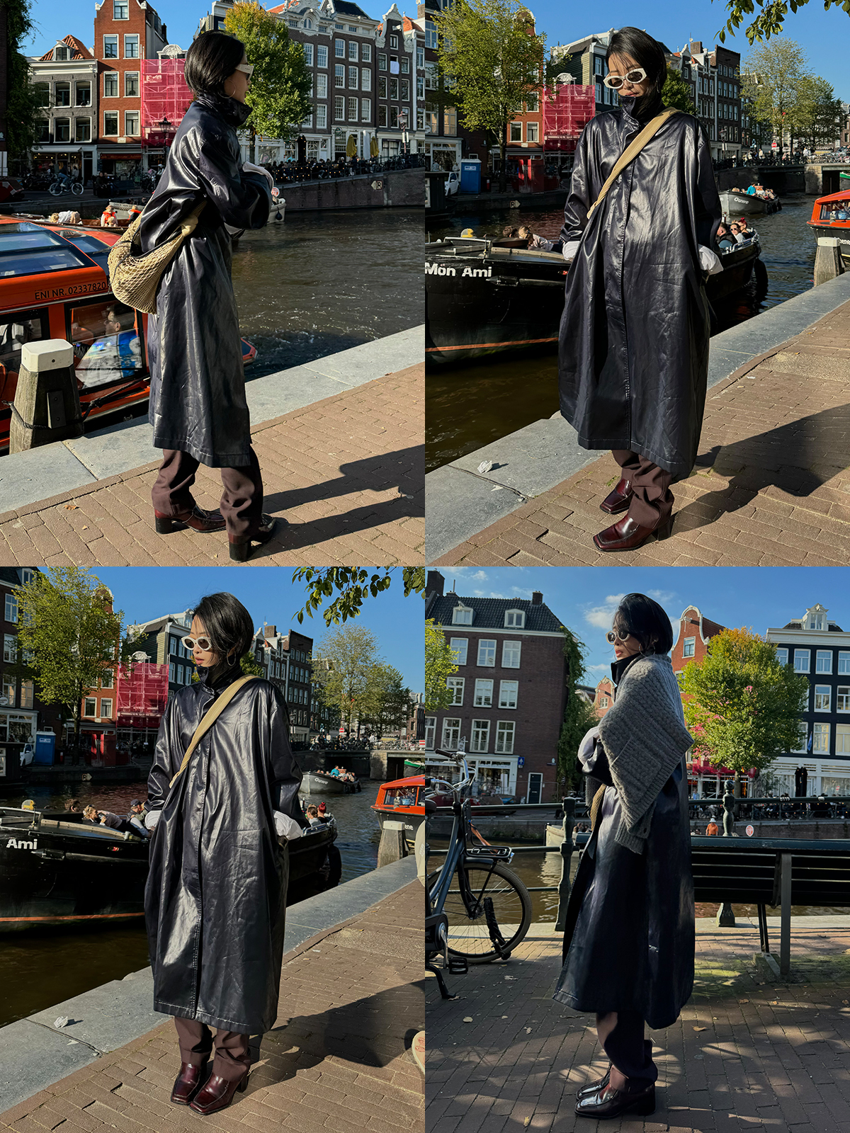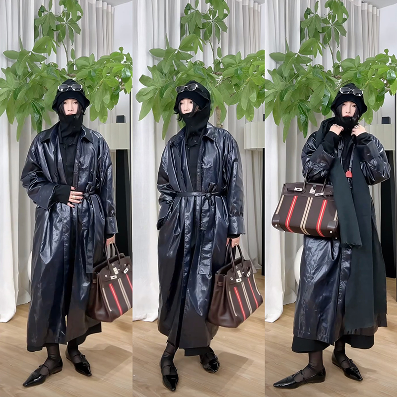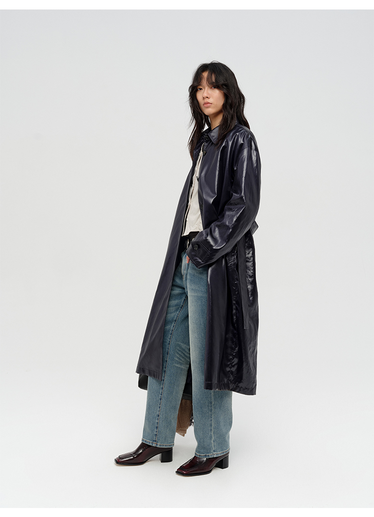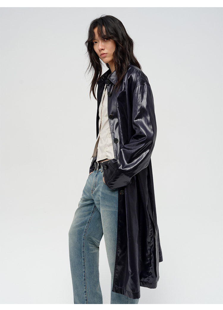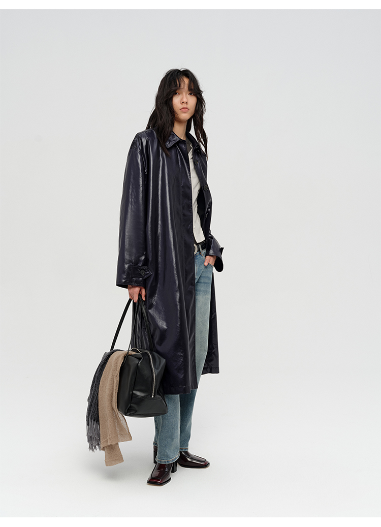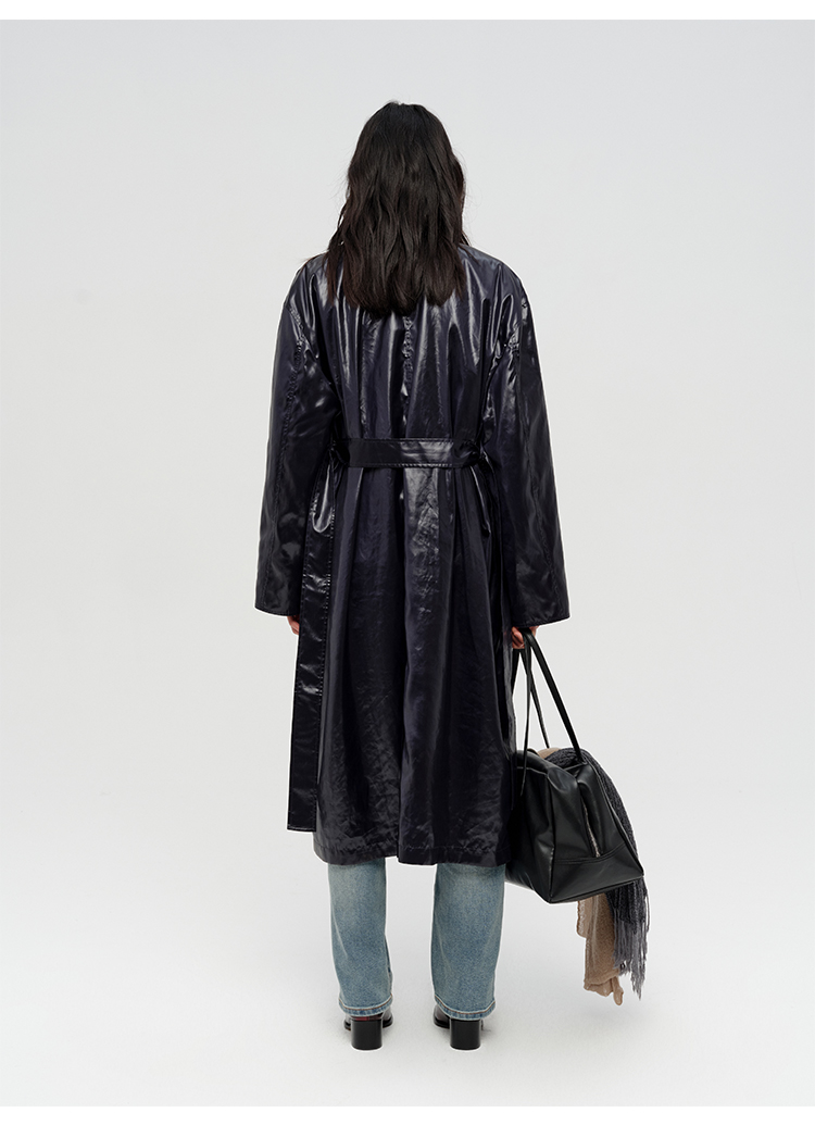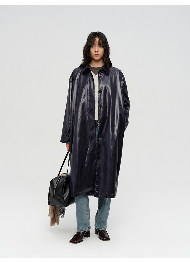 HIDEMI 日本进口亮面纸感纤维极简廓形设计感复古翻领式长款风衣