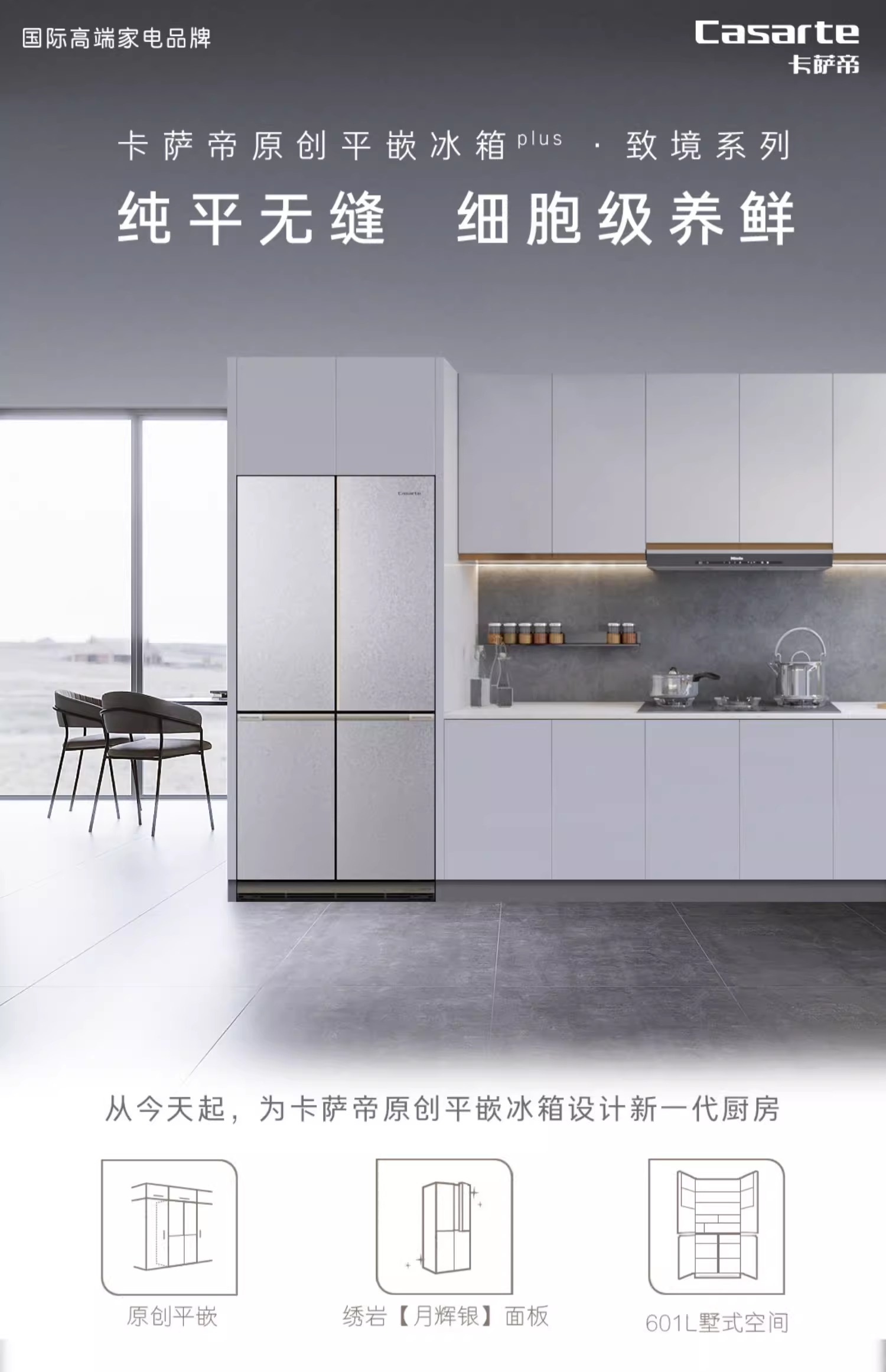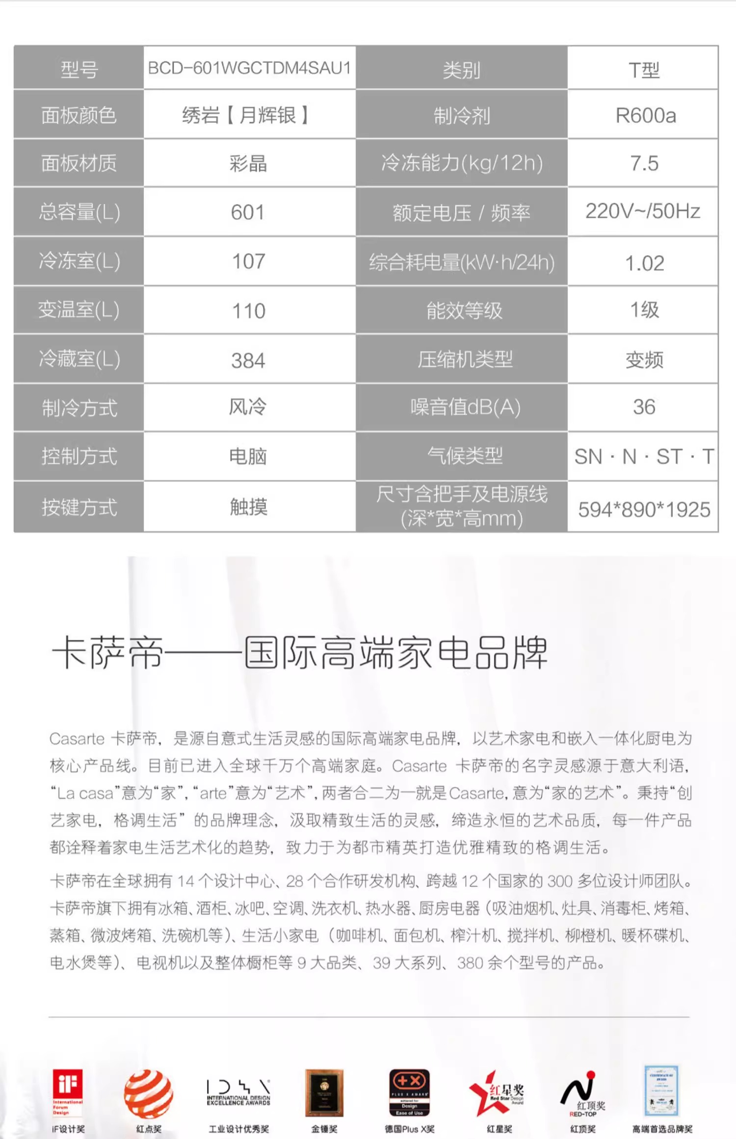 卡萨帝601升冰箱BCD-601WGCTDM4SAU1零嵌入式十字门家用风冷一级