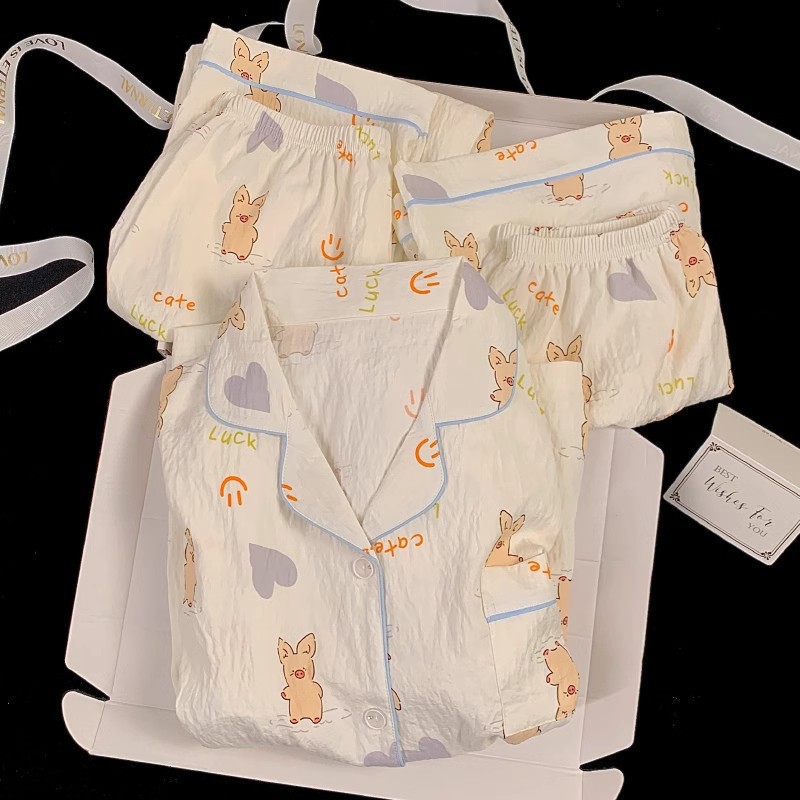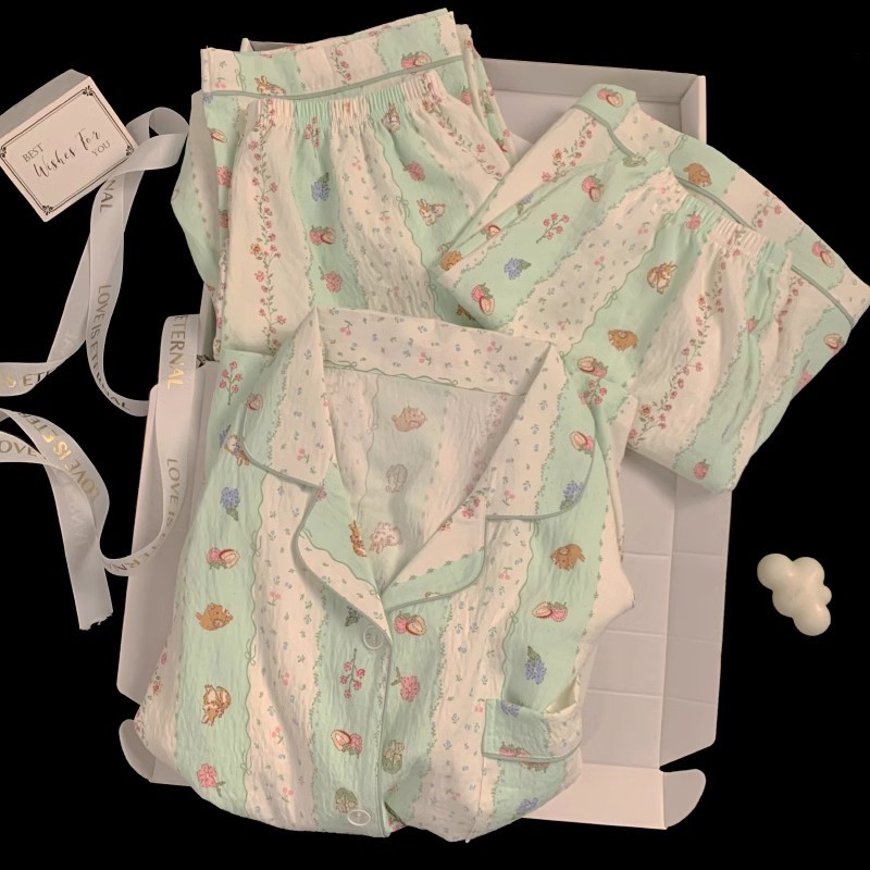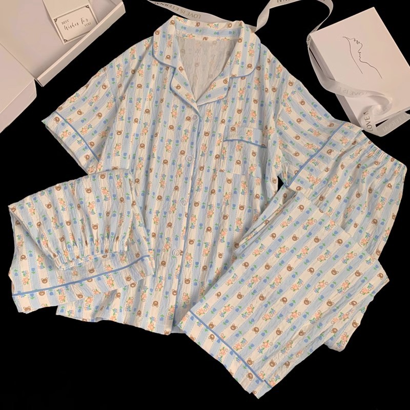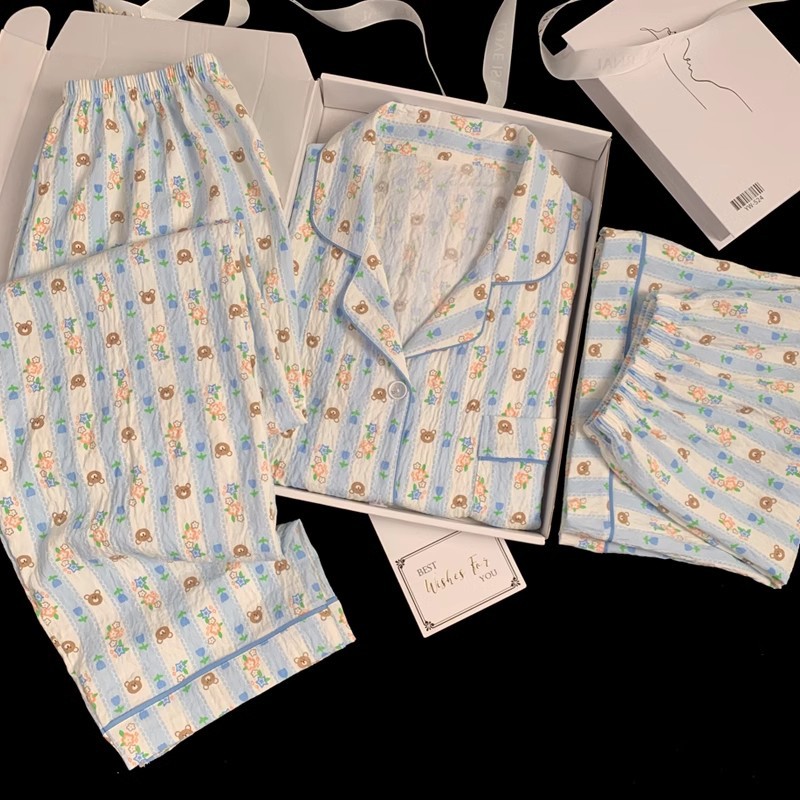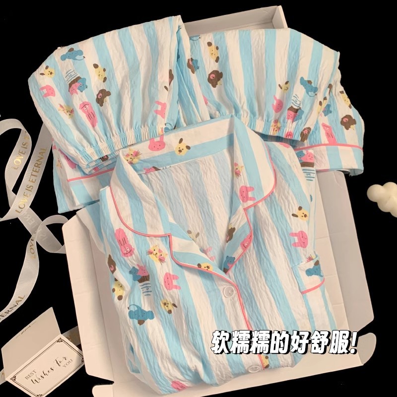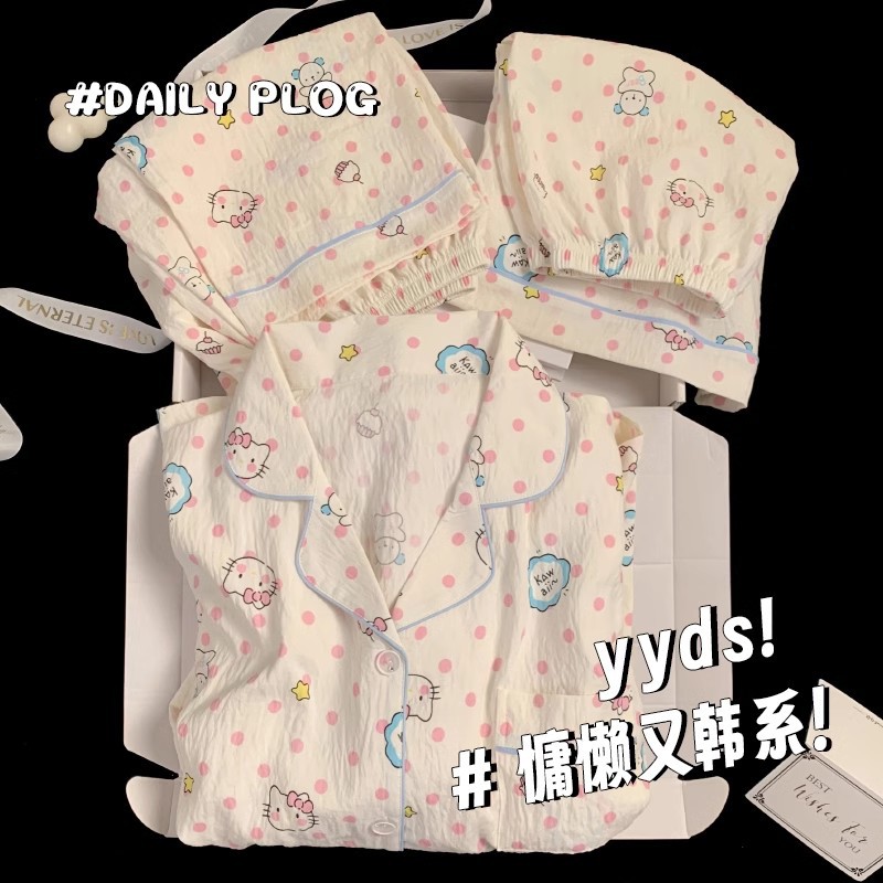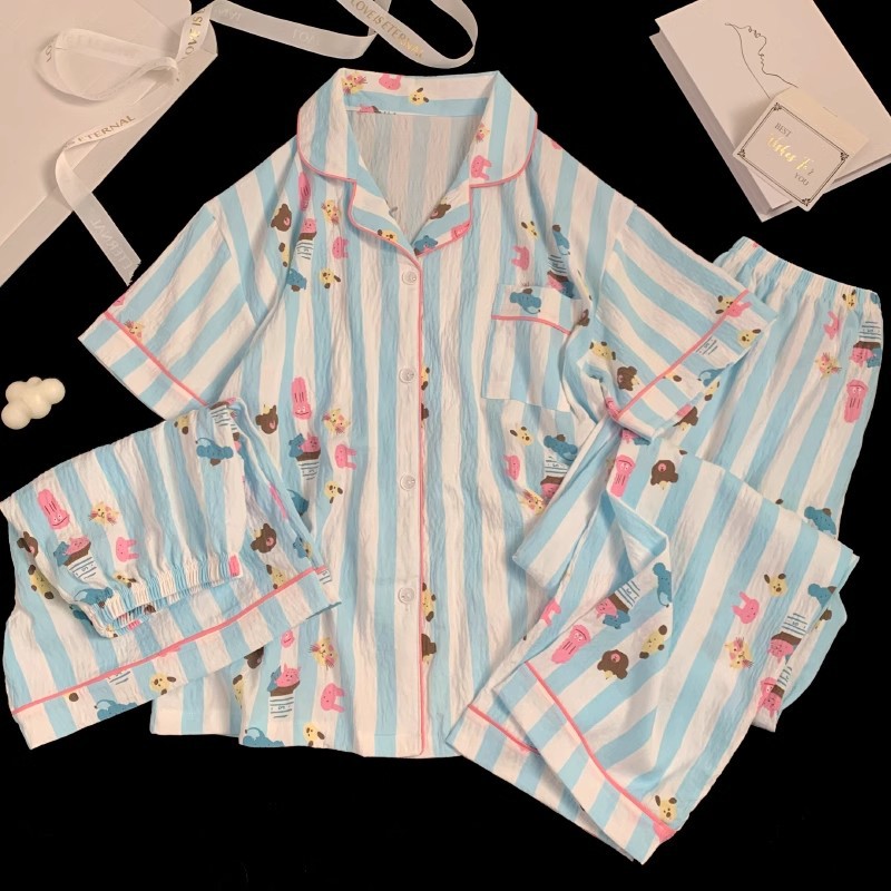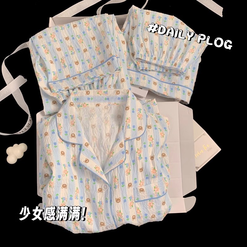 【显瘦不勒肉!亲肤不扎】奶乎乎睡衣女春夏季云朵纯棉绸棉纱短袖可爱大码宽松家居服三件套。xb