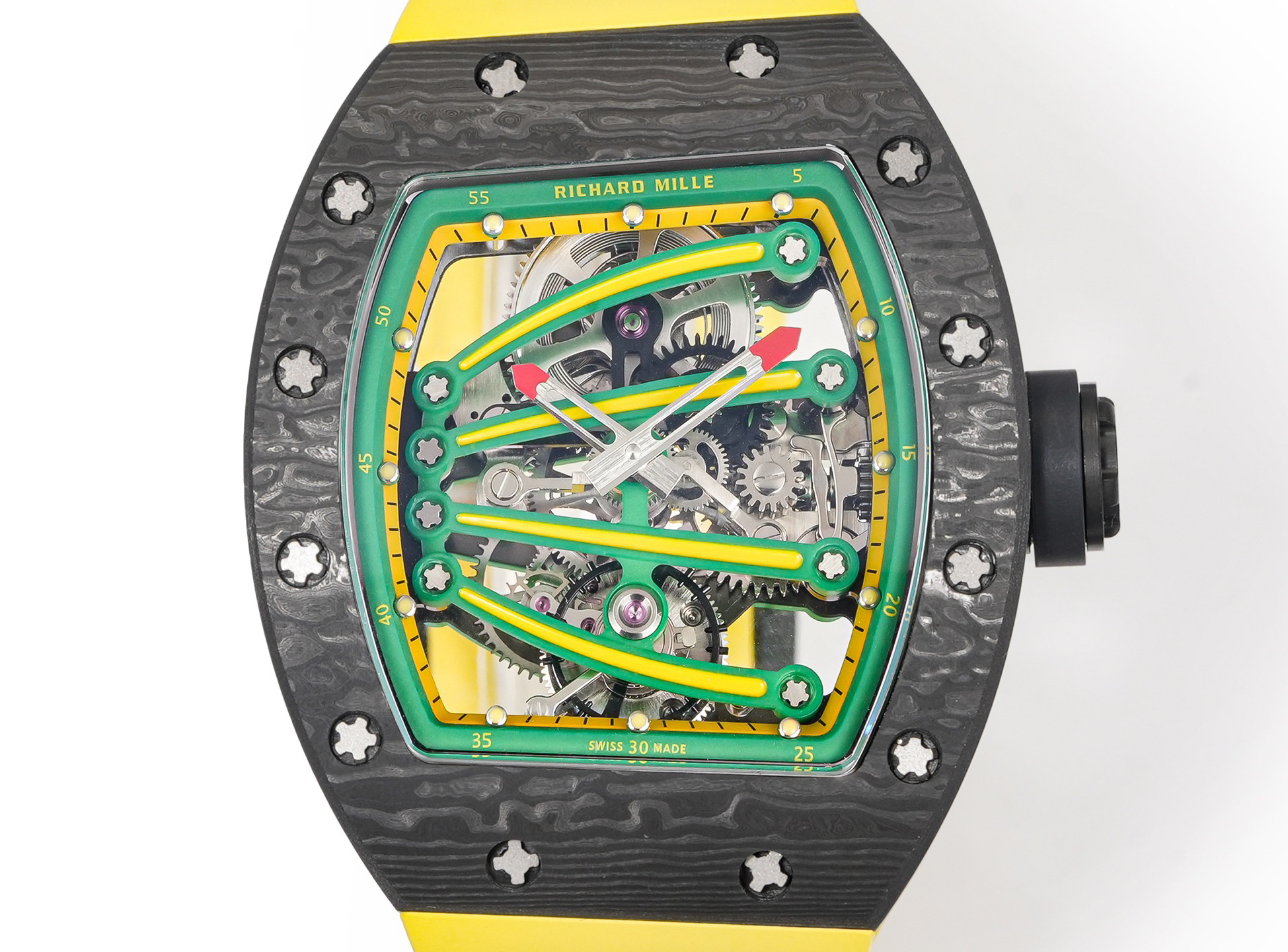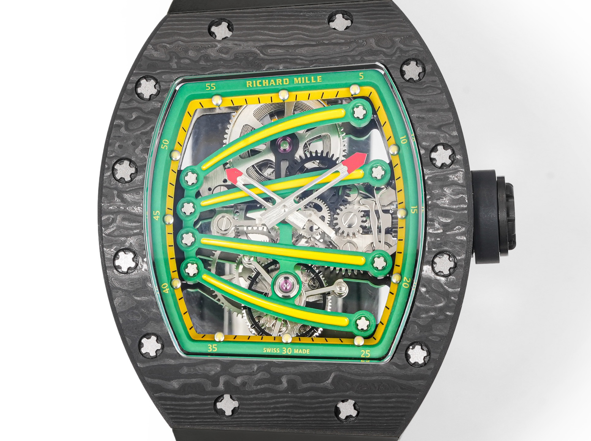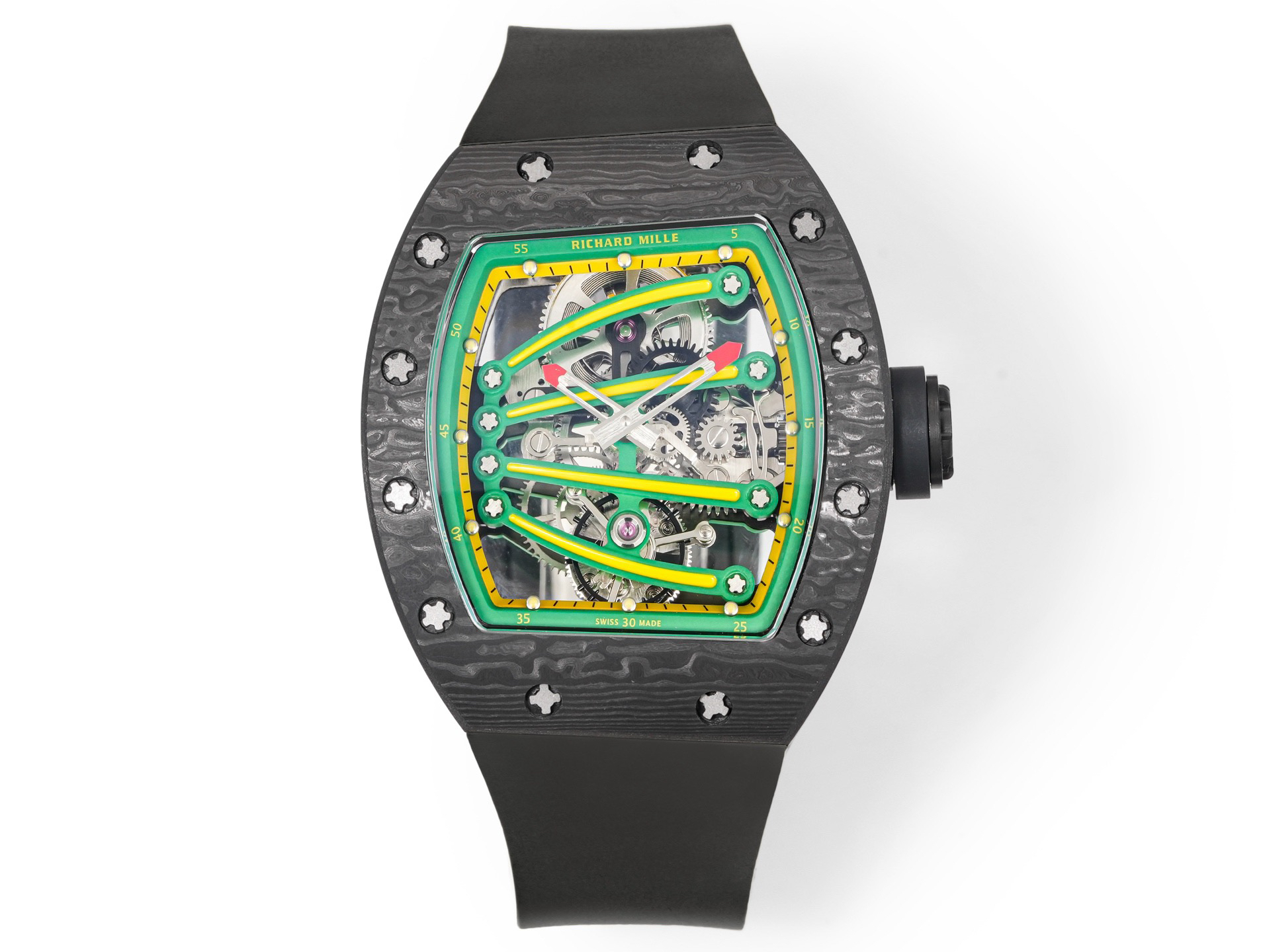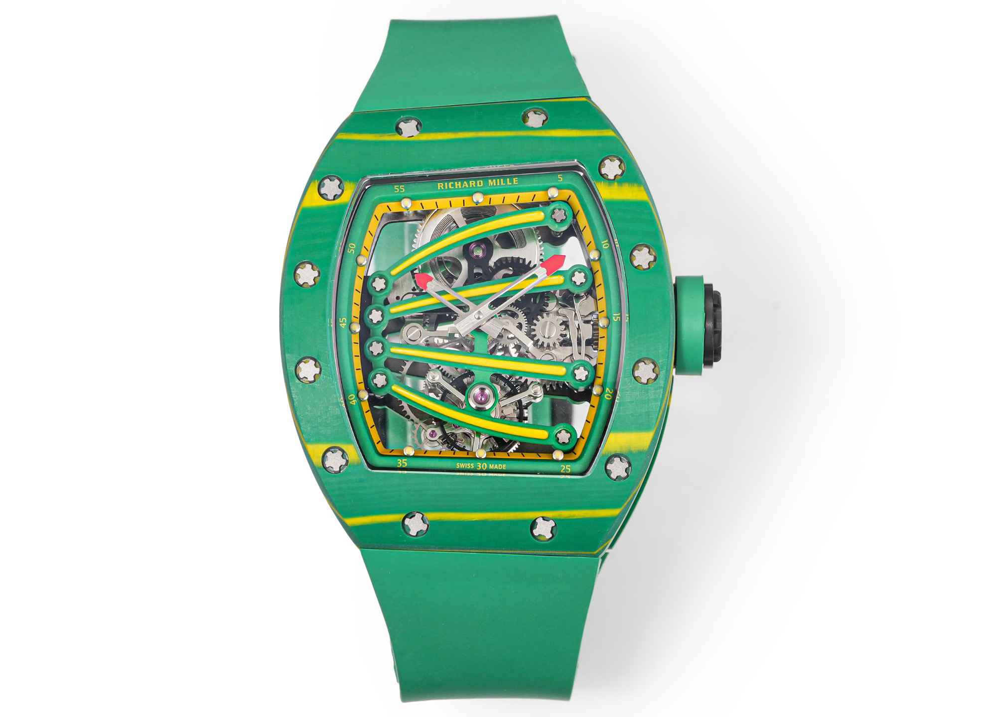 ➕Noob official➕理查德米勒RM59-01陀飞轮 绿蜥蜴 🦎充满独特的标记,以傲人之姿屹立在品牌腕表之间,打造专为运动竞技设计的腕表 1⃣️腕表的表壳,是对Richard Mille钟爱的酒桶型表壳的全新诠释,亦是创新的演绎。表壳2点和5点之间拉长的造型令人惊艳,而这一来避免了表冠与手腕摩擦,且保留了配戴的绝佳舒适感。直径为51.10x 43.10 x 15.20毫米,材质为TPT碳纤维合成物制成,这种材质强度高且轻盈又耐用。2⃣️相信很多人看到这款腕表最先映入眼帘的就是表盘上鲜亮的标志性四爪板桥,板桥具有极佳的柔韧度,将整个机芯紧紧擒住,为减轻外界震动为腕表带来的伤害。3⃣️腕表搭载手动上链陀飞轮机芯,动力储存大约48小时,振频每小时28800次,加上优化的齿轮体系以及可变惯性摆轮,使得这款腕表的性能、规律性以 及动力储存的比例关係达到顶尖的平衡状态。4⃣️腕表采用蓝宝石水晶玻璃设计的表镜,两面防眩处理,厚度为中间1.2毫米,边有1.95毫米。5⃣️腕表胶带为进口材料氟橡胶表带,拥有耐磨性和抗腐蚀性,且配戴起来柔软舒适。Noob official ➕ Richard Miller RM59-01 Tourbillon Green Lizard 🦎 Filled with unique markings, standing proudly among the brand's watches, creating a watch specifically designed for sports competitions ⃣ The watch case is a new interpretation and innovative interpretation of Richard Mille's beloved barrel shaped case. The elongated shape between the 2-point and 5-point of the watch case is stunning, while avoiding friction between the crown and wrist and retaining excellent comfort during wear. The diameter is 51.10 x 43.10 x 15.20 millimeters, made of TPT carbon fiber composite material, which has high strength, lightweight and durability. two ⃣ I believe that the first thing that catches the eye of many people when they see this watch is the bright and iconic four claw bridge on the dial. The bridge has excellent flexibility, tightly grasping the entire movement to reduce the damage caused by external vibrations to the watch. three ⃣ The watch is equipped with a manually wound tourbillon movement, with a power reserve of approximately 48 hours and a frequency of 28800 vibrations per hour. Coupled with an optimized gear system and variable inertia balance wheel, the performance, regularity, and power reserve ratio of this watch reach a top-notch balance state. four ⃣ The watch features a sapphire crystal glass design with anti glare treatment on both sides, with a thickness of 1.2 millimeters in the middle and 1.95 millimeters on the edges. five ⃣ The watch tape is made of imported fluororubber strap, which has wear resistance and corrosion resistance, and is soft and comfortable to wear.